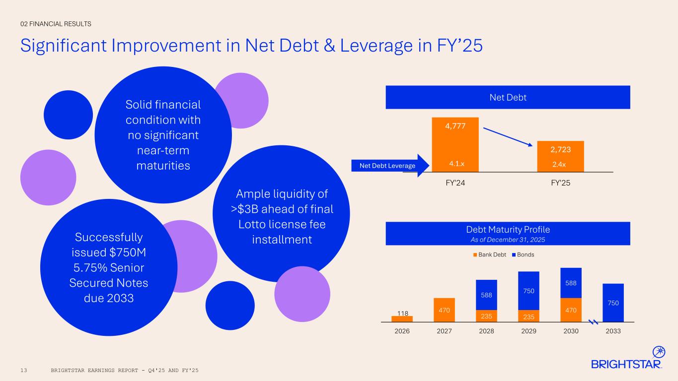 12 Cash Generation Funds Key Investments & Significant Shareholder Returns 02 FINANCIAL RESULTS BRIGHTSTAR EARNINGS REPORT - Q4'25 AND FY'25 Note: cash flow results reflect continuing operations *Non-GAAP measure; see disclaimer on page 2 and reconciliations to the most directly comparable GAAP measures in Appendix for further details • Lotto license fee €2.23B or ~$2.56B • €800M or $926M paid in FY’25; BRSL share €492M or ~$569M • €1.43B or $1.68B due in Q2’26; BRSL share ~€879M or ~$1.03B • Significant shareholder returns • $271M in share repurchases; 9% reduction in shares outstanding • $770M in cash dividends • $600M special dividend • $170M quarterly cash dividends • Double-digit percentage increase in quarterly cash dividend • $0.20 in Q2’25 • $0.22 in Q3’25; +10% • $0.23 in Q4’25; +5% ($193M)/$733M Cash from Operations including & excluding Lotto upfront license fee ($509M) Free Cash Flow* including $926M for Lotto upfront license fee $316M CapEx >$1B Shareholder returns
