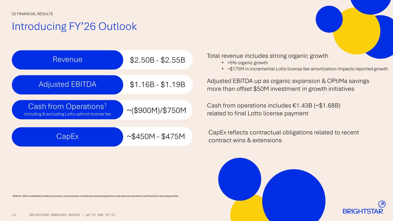 Net Debt 13 Significant Improvement in Net Debt & Leverage in FY’25 BRIGHTSTAR EARNINGS REPORT - Q4'25 AND FY'25 02 FINANCIAL RESULTS 118 470 235 235 470 588 750 588 750 2026 2027 2028 2029 2030 2033 Bank Debt Bonds 4,777 2,723 FY'24 FY'25 2.4x4.1.xNet Debt Leverage Solid financial condition with no significant near-term maturities Ample liquidity of >$3B ahead of final Lotto license fee installmentSuccessfully issued $750M 5.75% Senior Secured Notes due 2033 Debt Maturity Profile As of December 31, 2025