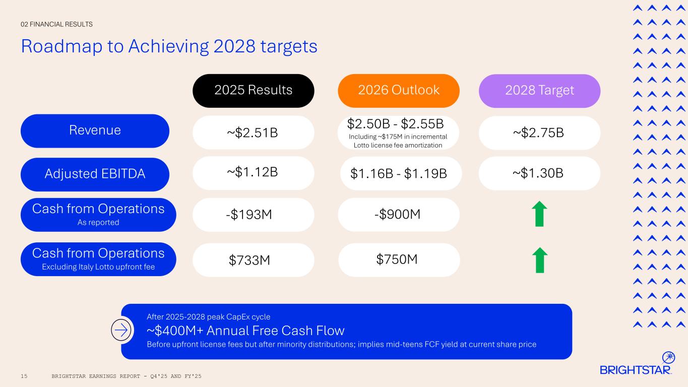 14 Introducing FY’26 Outlook 02 FINANCIAL RESULTS BRIGHTSTAR EARNINGS REPORT - Q4'25 AND FY'25 1Reflects 100% consolidation of Italy joint venture; minority partner contributions representing their pro rata share are recorded in cash flows from financing activities CapEx reflects contractual obligations related to recent contract wins & extensions Cash from operations includes €1.43B (~$1.68B) related to final Lotto license payment Revenue Adjusted EBITDA $2.50B - $2.55B $1.16B - $1.19B Cash from Operations1 including & excluding Lotto upfront license fee ~($900M)/$750M CapEx ~$450M - $475M Total revenue includes strong organic growth • >5% organic growth • ~$175M in incremental Lotto license fee amortization impacts reported growth Adjusted EBITDA up as organic expansion & OPtiMa savings more than offset $50M investment in growth initiatives