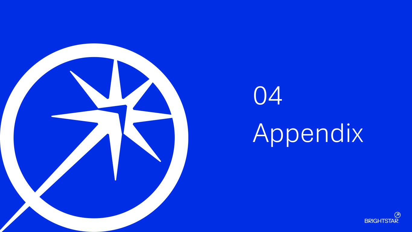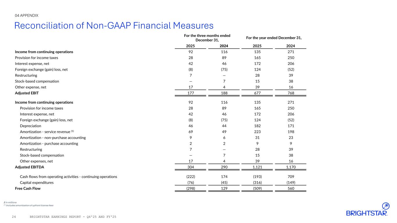 $ in millions (1) Includes amortization of upfront license fees Reconciliation of Non-GAAP Financial Measures 04 APPENDIX BRIGHTSTAR EARNINGS REPORT - Q4'25 AND FY'2524 For the three months ended December 31, For the year ended December 31, 2025 2024 2025 2024 Income from continuing operations 92 116 135 271 Provision for income taxes 28 89 165 250 Interest expense, net 42 46 172 206 Foreign exchange (gain) loss, net (8) (75) 124 (52) Restructuring 7 — 28 39 Stock-based compensation — 7 15 38 Other expense, net 17 4 39 16 Adjusted EBIT 177 188 677 768 Income from continuing operations 92 116 135 271 Provision for income taxes 28 89 165 250 Interest expense, net 42 46 172 206 Foreign exchange (gain) loss, net (8) (75) 124 (52) Depreciation 46 44 182 171 Amortization - service revenue (1) 69 49 223 198 Amortization - non-purchase accounting 9 6 31 23 Amortization - purchase accounting 2 2 9 9 Restructuring 7 — 28 39 Stock-based compensation — 7 15 38 Other expenses, net 17 4 39 16 Adjusted EBITDA 304 290 1,121 1,170 Cash flows from operating activities - continuing operations (222) 174 (193) 709 Capital expenditures (76) (45) (316) (149) Free Cash Flow (298) 129 (509) 560