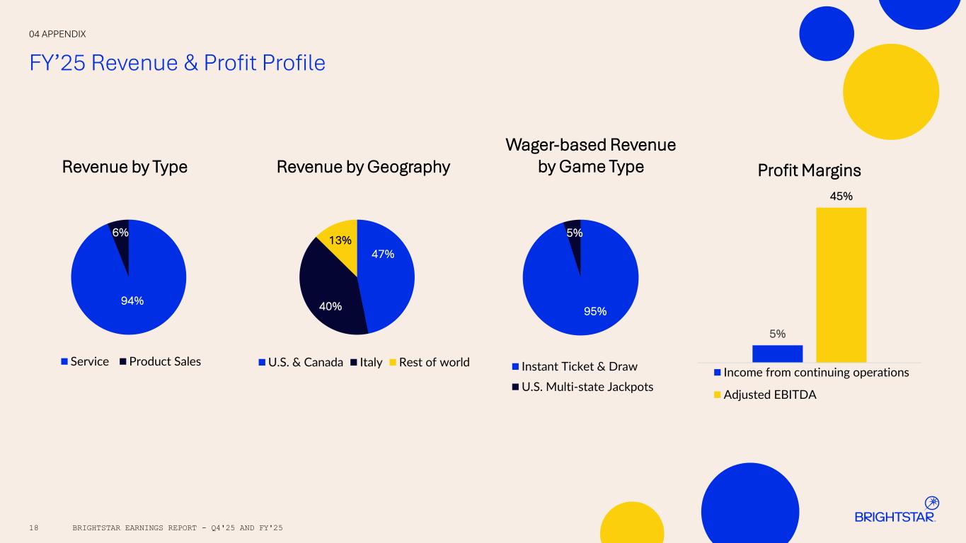04 APPENDIX FY’25 Revenue & Profit Profile 94% 6% Service Product Sales 47% 40% 13% U.S. & Canada Italy Rest of world 95% 5% Instant Ticket & Draw U.S. Multi-state Jackpots 5% 45% Income from continuing operations Adjusted EBITDA Revenue by Type Revenue by Geography Wager-based Revenue by Game Type Profit Margins BRIGHTSTAR EARNINGS REPORT - Q4'25 AND FY'2518