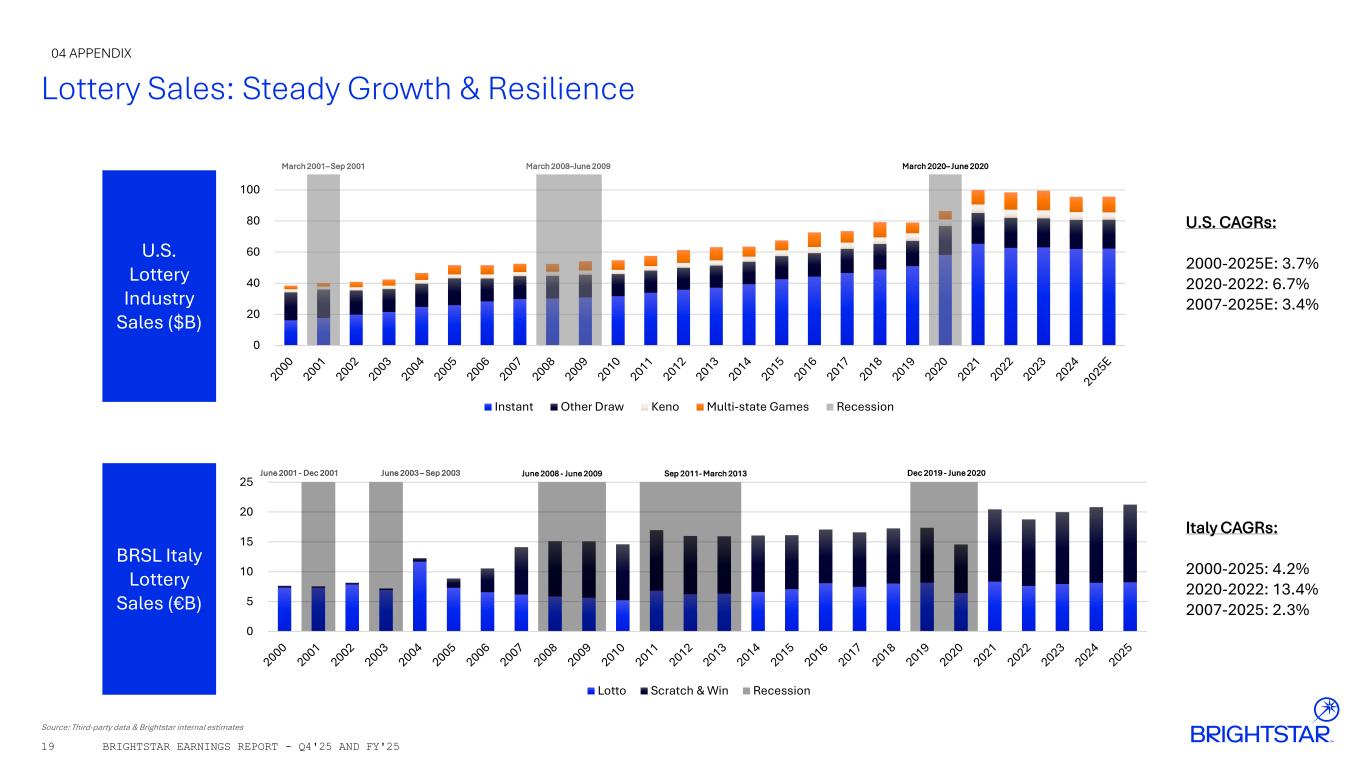 19 Lottery Sales: Steady Growth & Resilience Source: Third-party data & Brightstar internal estimates U.S. CAGRs: 2000-2025E: 3.7% 2020-2022: 6.7% 2007-2025E: 3.4% Italy CAGRs: 2000-2025: 4.2% 2020-2022: 13.4% 2007-2025: 2.3% 04 APPENDIX BRIGHTSTAR EARNINGS REPORT - Q4'25 AND FY'25 March 2001– Sep 2001 March 2008–June 2009 March 2020– June 2020 0 20 40 60 80 100 Instant Other Draw Keno Multi-state Games Recession U.S. Lottery Industry Sales ($B) BRSL Italy Lottery Sales (€B) June 2001 - Dec 2001 June 2003 – Sep 2003 June 2008 - June 2009 Sep 2011- March 2013 Dec 2019 - June 2020 0 5 10 15 20 25 Lotto Scratch & Win Recession
