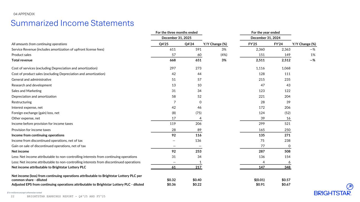 Summarized Income Statements $ in millions except otherwise noted 04 APPENDIX BRIGHTSTAR EARNINGS REPORT - Q4'25 AND FY'2522 For the three months ended For the year ended December 31, 2025 December 31, 2024 All amounts from continuing operations Q4'25 Q4'24 Y/Y Change (%) FY'25 FY'24 Y/Y Change (%) Service Revenue (includes amortization of upfront license fees) 611 591 3% 2,360 2,363 —% Product sales 57 60 (4%) 151 149 1% Total revenue 668 651 3% 2,511 2,512 —% Cost of services (excluding Depreciation and amortization) 297 273 1,116 1,068 Cost of product sales (excluding Depreciation and amortization) 42 44 128 111 General and administrative 51 57 215 235 Research and development 13 10 47 43 Sales and Marketing 31 34 123 122 Depreciation and amortization 58 52 221 204 Restructuring 7 0 28 39 Interest expense, net 42 46 172 206 Foreign exchange (gain) loss, net (8) (75) 124 (52) Other expense, net 17 4 39 16 Income before provision for income taxes 119 206 299 521 Provision for income taxes 28 89 165 250 Income from continuing operations 92 116 135 271 Income from discontinued operations, net of tax — 136 75 238 Gain on sale of discontinued operations, net of tax — — 77 0 Net income 92 253 287 508 Less: Net income attributable to non-controlling interests from continuing operations 31 34 136 154 Less: Net income attributable to non-controlling interests from discontinued operations — 1 4 6 Net income attributable to Brightstar Lottery PLC 61 217 147 348 Net income (loss) from continuing operations attributable to Brightstar Lottery PLC per common share - diluted $0.32 $0.40 $(0.01) $0.57 Adjusted EPS from continuing operations attributable to Brightstar Lottery PLC - diluted $0.36 $0.22 $0.91 $0.67