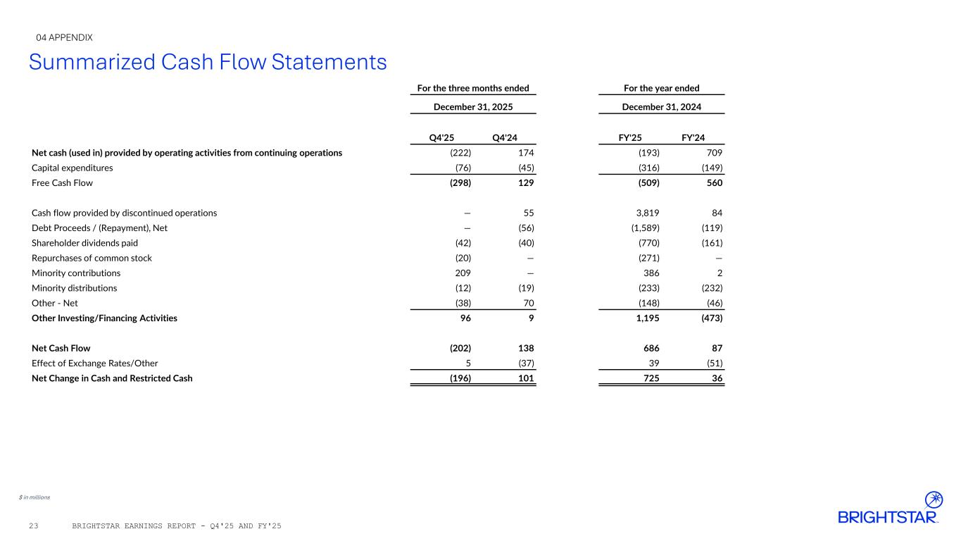 Summarized Cash Flow Statements $ in millions 04 APPENDIX BRIGHTSTAR EARNINGS REPORT - Q4'25 AND FY'2523 For the three months ended For the year ended December 31, 2025 December 31, 2024 Q4'25 Q4'24 FY'25 FY'24 Net cash (used in) provided by operating activities from continuing operations (222) 174 (193) 709 Capital expenditures (76) (45) (316) (149) Free Cash Flow (298) 129 (509) 560 Cash flow provided by discontinued operations — 55 3,819 84 Debt Proceeds / (Repayment), Net — (56) (1,589) (119) Shareholder dividends paid (42) (40) (770) (161) Repurchases of common stock (20) — (271) — Minority contributions 209 — 386 2 Minority distributions (12) (19) (233) (232) Other - Net (38) 70 (148) (46) Other Investing/Financing Activities 96 9 1,195 (473) Net Cash Flow (202) 138 686 87 Effect of Exchange Rates/Other 5 (37) 39 (51) Net Change in Cash and Restricted Cash (196) 101 725 36