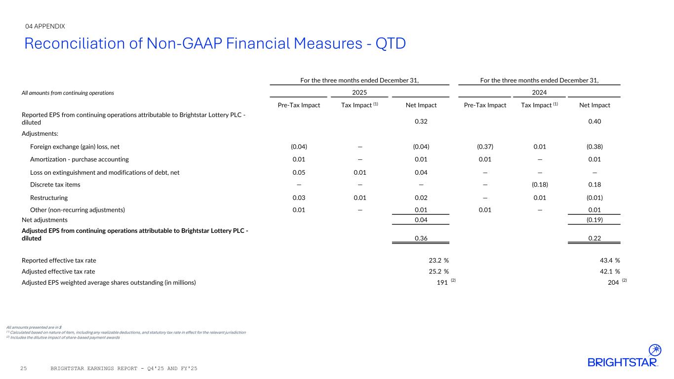 Reconciliation of Non-GAAP Financial Measures - QTD All amounts presented are in $ (1) Calculated based on nature of item, including any realizable deductions, and statutory tax rate in effect for the relevant jurisdiction (2) Includes the dilutive impact of share-based payment awards 04 APPENDIX BRIGHTSTAR EARNINGS REPORT - Q4'25 AND FY'2525 For the three months ended December 31, For the three months ended December 31, All amounts from continuing operations 2025 2024 Pre-Tax Impact Tax Impact (1) Net Impact Pre-Tax Impact Tax Impact (1) Net Impact Reported EPS from continuing operations attributable to Brightstar Lottery PLC - diluted 0.32 0.40 Adjustments: Foreign exchange (gain) loss, net (0.04) — (0.04) (0.37) 0.01 (0.38) Amortization - purchase accounting 0.01 — 0.01 0.01 — 0.01 Loss on extinguishment and modifications of debt, net 0.05 0.01 0.04 — — — Discrete tax items — — — — (0.18) 0.18 Restructuring 0.03 0.01 0.02 — 0.01 (0.01) Other (non-recurring adjustments) 0.01 — 0.01 0.01 — 0.01 Net adjustments 0.04 (0.19) Adjusted EPS from continuing operations attributable to Brightstar Lottery PLC - diluted 0.36 0.22 Reported effective tax rate 23.2 % 43.4 % Adjusted effective tax rate 25.2 % 42.1 % Adjusted EPS weighted average shares outstanding (in millions) 191 (2) 204 (2)