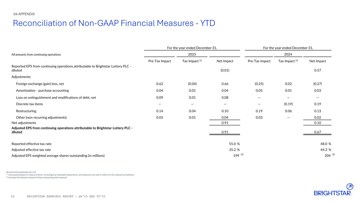 Reconciliation of Non-GAAP Financial Measures - YTD All amounts presented are in $ (1) Calculated based on nature of item, including any realizable deductions, and statutory tax rate in effect for the relevant jurisdiction (2) Includes the dilutive impact of share-based payment awards 04 APPENDIX BRIGHTSTAR EARNINGS REPORT - Q4'25 AND FY'2526 For the year ended December 31, For the year ended December 31, All amounts from continuing operations 2025 2024 Pre-Tax Impact Tax Impact (1) Net Impact Pre-Tax Impact Tax Impact (1) Net Impact Reported EPS from continuing operations attributable to Brightstar Lottery PLC - diluted (0.01) 0.57 Adjustments: Foreign exchange (gain) loss, net 0.62 (0.04) 0.66 (0.25) 0.02 (0.27) Amortization - purchase accounting 0.04 0.01 0.04 0.05 0.01 0.03 Loss on extinguishment and modifications of debt, net 0.09 0.01 0.08 — — — Discrete tax items — — — — (0.19) 0.19 Restructuring 0.14 0.04 0.10 0.19 0.06 0.13 Other (non-recurring adjustments) 0.05 0.01 0.04 0.03 — 0.02 Net adjustments 0.91 0.10 Adjusted EPS from continuing operations attributable to Brightstar Lottery PLC - diluted 0.91 0.67 Reported effective tax rate 55.0 % 48.0 % Adjusted effective tax rate 35.2 % 44.3 % Adjusted EPS weighted average shares outstanding (in millions) 199 (2) 204 (2)