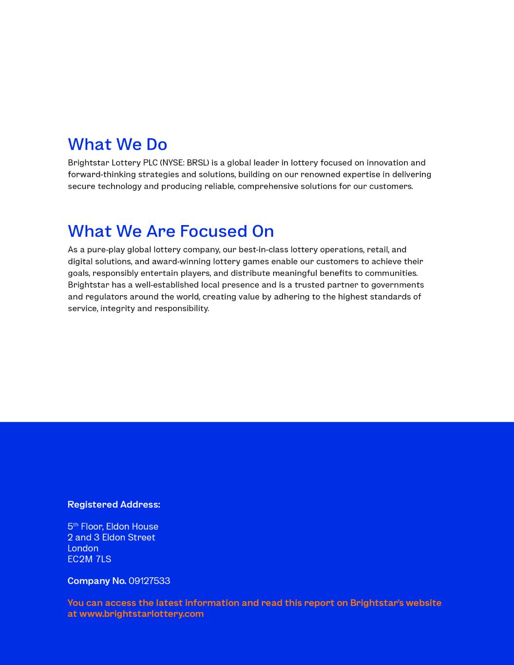 Investor Information Listing The ordinary shares of Brightstar Lottery PLC are listed on the New York Stock Exchange under ticker symbol BRSL. News Releases Additional company information including news releases, earnings announcements, and information on corporate governance are available at www.brightstarlottery.com. Investor Contact Investor Relations Department Brightstar Lottery 10 Memorial Boulevard Providence, RI 02903 Phone: +1 (401) 392-7077 E-mail: investor.relations@brightstarlottery.com Share Transfer Agent and Registrar Computershare Shareholder Services Regular Mail: Computershare PO Box 43078 Providence, RI 02940-3078 Overnight Mail Delivery: Computershare 150 Royall Street, Suite 101 Canton, MA 02021 www-us.computershare.com/investor FORWARD-LOOKING STATEMENTS This Annual Report and Accounts includes forward-looking statements concerning the Company and other matters. These statements may discuss goals, intentions, and expectations as to future plans and strategies, expected growth, transactions, trends, events, products and services, customer relationships, dividends, results of operations, and/or financial condition or measures, or otherwise, based on current beliefs of the management of the Company as well as assumptions made by, and information currently available to, such management. Forward-looking statements may be accompanied by words such as “aim,” “anticipate,” “believe,” “plan,” “could,” “would,” “should,” “shall,” “continue,” “estimate,” “expect,” “forecast,” “future,” “guidance,” “intend,” “may,” “will,” “outlook,” “possible,” “potential,” “predict,” “project,” “target”, “designed to,” “strategy,” “committed to” or the negative or other variations of them. These forward- looking statements speak only as of the date on which such statements are made and are subject to various risks and uncertainties, many of which are outside the Company’s control. Should one or more of these risks or uncertainties materialize, or should any of the underlying assumptions prove incorrect, actual results may differ materially from those predicted in the forward-looking statements and from past results, performance, or achievements. Therefore, you should not place undue reliance on such statements. Factors that could cause actual results to differ materially from those in the forward-looking statements include (but are not limited to) changing economic conditions in the global markets where the Company operates, including economic slowdowns, rising interest rates, inflationary and other economic factors that pressure customer spending, changes in customer demand for products and services and a slowdown in customer payments; unanticipated changes relating to competitive factors in the industries in which the Company operates; the Company’s international operations, which are subject to the risks of currency fluctuations and foreign exchange controls; changes in legislation, governmental regulations, or the enforcement thereof, including changes in tax laws and tariffs in or between the jurisdictions in which the Company operates, that could affect the Company; and the resolution of pending and potential future legal, regulatory, or tax proceedings and investigations. Except as required under applicable law, the Company does not assume any obligation to update these forward-looking statements. Nothing in this Annual Report and Accounts is intended, or is to be construed, as a profit forecast or to be interpreted to mean that earnings per share of the Parent for the current or any future financial years will necessarily match or exceed the historical published earnings per share of the Parent, as applicable. All forward-looking statements contained in this Annual Report and Accounts are qualified in their entirety by this cautionary statement. Additional Information Annual Report and Accounts 2025 Page | 163