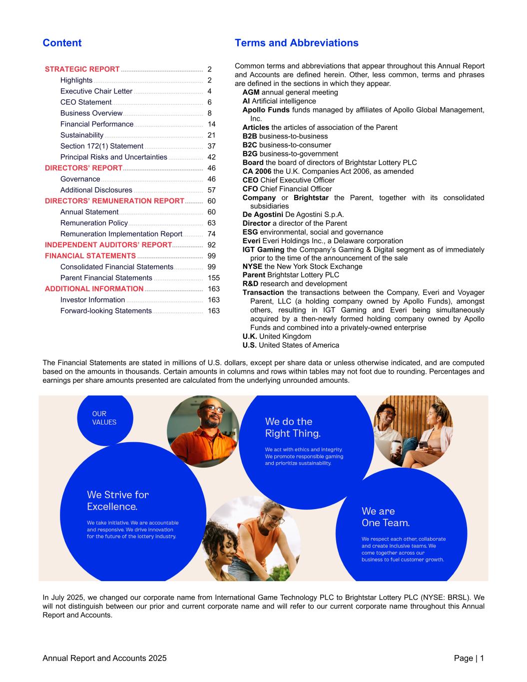 Content STRATEGIC REPORT ............................................. 2 Highlights ............................................................ 2 Executive Chair Letter ...................................... 4 CEO Statement .................................................. 6 Business Overview ............................................ 8 Financial Performance ...................................... 14 Sustainability ...................................................... 21 Section 172(1) Statement ................................ 37 Principal Risks and Uncertainties ................... 42 DIRECTORS’ REPORT ............................................ 46 Governance ........................................................ 46 Additional Disclosures ...................................... 57 DIRECTORS’ REMUNERATION REPORT .......... 60 Annual Statement .............................................. 60 Remuneration Policy ......................................... 63 Remuneration Implementation Report ........... 74 INDEPENDENT AUDITORS’ REPORT ................. 92 FINANCIAL STATEMENTS .................................... 99 Consolidated Financial Statements ................ 99 Parent Financial Statements ........................... 155 ADDITIONAL INFORMATION ................................ 163 Investor Information .......................................... 163 Forward-looking Statements ............................ 163 Terms and Abbreviations Common terms and abbreviations that appear throughout this Annual Report and Accounts are defined herein. Other, less common, terms and phrases are defined in the sections in which they appear. AGM annual general meeting AI Artificial intelligence Apollo Funds funds managed by affiliates of Apollo Global Management, Inc. Articles the articles of association of the Parent B2B business-to-business B2C business-to-consumer B2G business-to-government Board the board of directors of Brightstar Lottery PLC CA 2006 the U.K. Companies Act 2006, as amended CEO Chief Executive Officer CFO Chief Financial Officer Company or Brightstar the Parent, together with its consolidated subsidiaries De Agostini De Agostini S.p.A. Director a director of the Parent ESG environmental, social and governance Everi Everi Holdings Inc., a Delaware corporation IGT Gaming the Company’s Gaming & Digital segment as of immediately prior to the time of the announcement of the sale NYSE the New York Stock Exchange Parent Brightstar Lottery PLC R&D research and development Transaction the transactions between the Company, Everi and Voyager Parent, LLC (a holding company owned by Apollo Funds), amongst others, resulting in IGT Gaming and Everi being simultaneously acquired by a then-newly formed holding company owned by Apollo Funds and combined into a privately-owned enterprise U.K. United Kingdom U.S. United States of America The Financial Statements are stated in millions of U.S. dollars, except per share data or unless otherwise indicated, and are computed based on the amounts in thousands. Certain amounts in columns and rows within tables may not foot due to rounding. Percentages and earnings per share amounts presented are calculated from the underlying unrounded amounts. In July 2025, we changed our corporate name from International Game Technology PLC to Brightstar Lottery PLC (NYSE: BRSL). We will not distinguish between our prior and current corporate name and will refer to our current corporate name throughout this Annual Report and Accounts. Annual Report and Accounts 2025 Page | 1