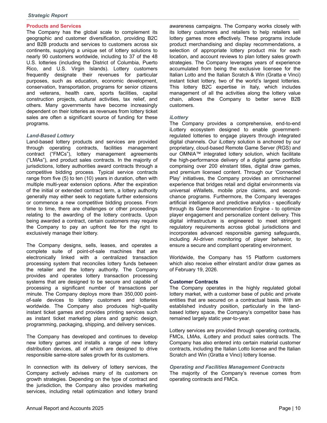 Products and Services The Company has the global scale to complement its geographic and customer diversification, providing B2C and B2B products and services to customers across six continents, supplying a unique set of lottery solutions to nearly 90 customers worldwide, including to 37 of the 48 U.S. lotteries (including the District of Columbia, Puerto Rico, and U.S. Virgin Islands). Lottery customers frequently designate their revenues for particular purposes, such as education, economic development, conservation, transportation, programs for senior citizens and veterans, health care, sports facilities, capital construction projects, cultural activities, tax relief, and others. Many governments have become increasingly dependent on their lotteries as revenues from lottery ticket sales are often a significant source of funding for these programs. Land-Based Lottery Land-based lottery products and services are provided through operating contracts, facilities management contract (“FMCs”), lottery management agreements (“LMAs”), and product sales contracts. In the majority of jurisdictions, lottery authorities award contracts through a competitive bidding process. Typical service contracts range from five (5) to ten (10) years in duration, often with multiple multi-year extension options. After the expiration of the initial or extended contract term, a lottery authority generally may either seek to negotiate further extensions or commence a new competitive bidding process. From time to time, there are challenges or other proceedings relating to the awarding of the lottery contracts. Upon being awarded a contract, certain customers may require the Company to pay an upfront fee for the right to exclusively manage their lottery. The Company designs, sells, leases, and operates a complete suite of point-of-sale machines that are electronically linked with a centralized transaction processing system that reconciles lottery funds between the retailer and the lottery authority. The Company provides and operates lottery transaction processing systems that are designed to be secure and capable of processing a significant number of transactions per minute. The Company deploys more than 350,000 point- of-sale devices to lottery customers and lotteries worldwide. The Company also produces high-quality instant ticket games and provides printing services such as instant ticket marketing plans and graphic design, programming, packaging, shipping, and delivery services. The Company has developed and continues to develop new lottery games and installs a range of new lottery distribution devices, all of which are designed to drive responsible same-store sales growth for its customers. In connection with its delivery of lottery services, the Company actively advises many of its customers on growth strategies. Depending on the type of contract and the jurisdiction, the Company also provides marketing services, including retail optimization and lottery brand awareness campaigns. The Company works closely with its lottery customers and retailers to help retailers sell lottery games more effectively. These programs include product merchandising and display recommendations, a selection of appropriate lottery product mix for each location, and account reviews to plan lottery sales growth strategies. The Company leverages years of experience accumulated from being the exclusive licensee for the Italian Lotto and the Italian Scratch & Win (Gratta e Vinci) instant ticket lottery, two of the world’s largest lotteries. This lottery B2C expertise in Italy, which includes management of all the activities along the lottery value chain, allows the Company to better serve B2B customers. iLottery The Company provides a comprehensive, end-to-end iLottery ecosystem designed to enable government- regulated lotteries to engage players through integrated digital channels. Our iLottery solution is anchored by our proprietary, cloud-based Remote Game Server (RGS) and our OMNIA™ integrated lottery solution, which facilitate the high-performance delivery of a digital game portfolio comprising over 200 eInstant titles, digital draw games, and premium licensed content. Through our ‘Connected Play’ initiatives, the Company provides an omnichannel experience that bridges retail and digital environments via universal eWallets, mobile prize claims, and second- chance programs. Furthermore, the Company leverages artificial intelligence and predictive analytics - specifically through its Game Recommendation Engine - to optimize player engagement and personalize content delivery. This digital infrastructure is engineered to meet stringent regulatory requirements across global jurisdictions and incorporates advanced responsible gaming safeguards, including AI-driven monitoring of player behavior, to ensure a secure and compliant operating environment. Worldwide, the Company has 15 Platform customers which also receive either eInstant and/or draw games as of February 19, 2026. Customer Contracts The Company operates in the highly regulated global lottery market, with a customer base of public and private entities that are secured on a contractual basis. With an established industry position, particularly in the land- based lottery space, the Company’s competitor base has remained largely static year-to-year. Lottery services are provided through operating contracts, FMCs, LMAs, iLottery and product sales contracts. The Company has also entered into certain material customer contracts, including the Italian Lotto license and the Italian Scratch and Win (Gratta e Vinci) lottery license. Operating and Facilities Management Contracts The majority of the Company’s revenue comes from operating contracts and FMCs. Strategic Report Annual Report and Accounts 2025 Page | 10