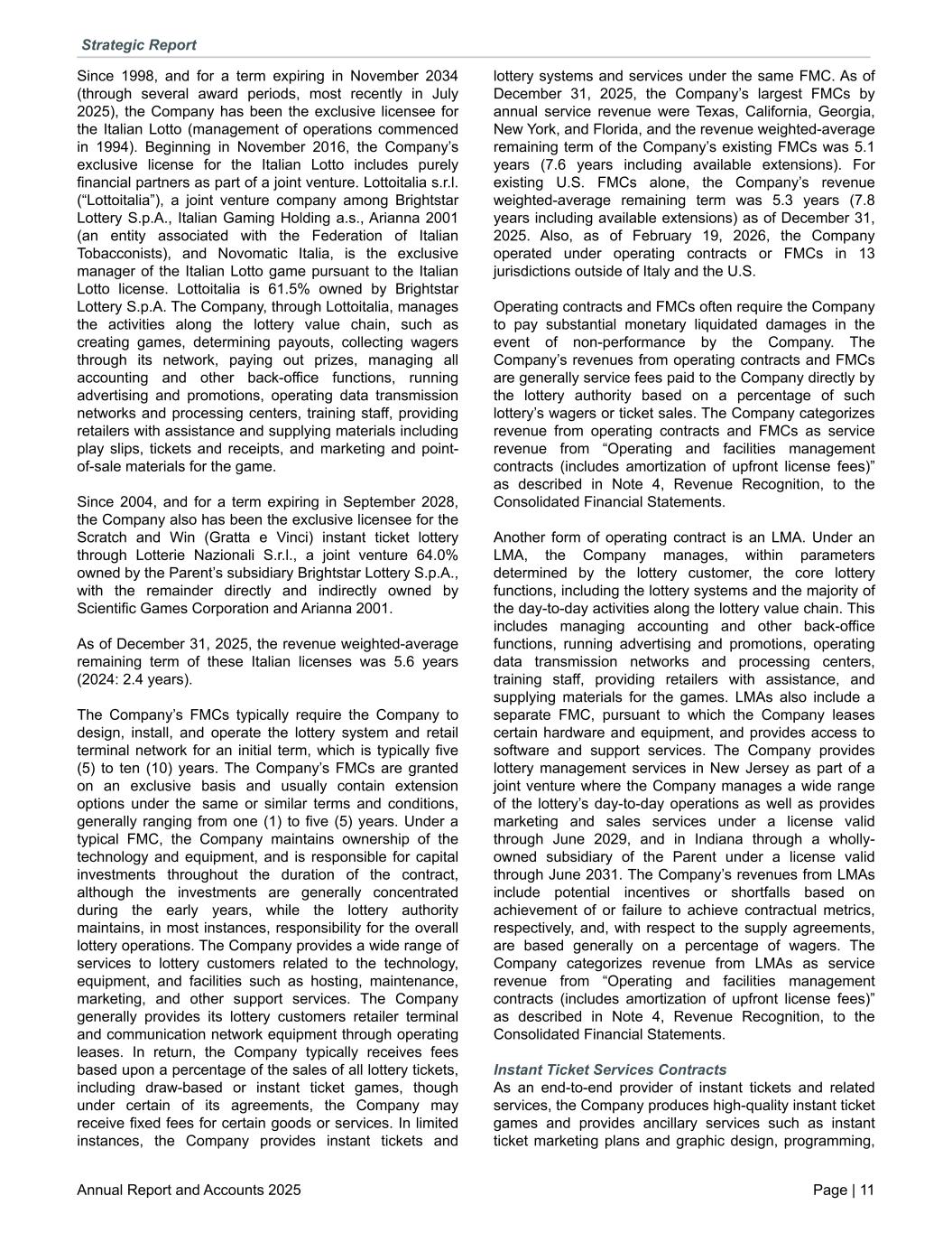 Since 1998, and for a term expiring in November 2034 (through several award periods, most recently in July 2025), the Company has been the exclusive licensee for the Italian Lotto (management of operations commenced in 1994). Beginning in November 2016, the Company’s exclusive license for the Italian Lotto includes purely financial partners as part of a joint venture. Lottoitalia s.r.l. (“Lottoitalia”), a joint venture company among Brightstar Lottery S.p.A., Italian Gaming Holding a.s., Arianna 2001 (an entity associated with the Federation of Italian Tobacconists), and Novomatic Italia, is the exclusive manager of the Italian Lotto game pursuant to the Italian Lotto license. Lottoitalia is 61.5% owned by Brightstar Lottery S.p.A. The Company, through Lottoitalia, manages the activities along the lottery value chain, such as creating games, determining payouts, collecting wagers through its network, paying out prizes, managing all accounting and other back-office functions, running advertising and promotions, operating data transmission networks and processing centers, training staff, providing retailers with assistance and supplying materials including play slips, tickets and receipts, and marketing and point- of-sale materials for the game. Since 2004, and for a term expiring in September 2028, the Company also has been the exclusive licensee for the Scratch and Win (Gratta e Vinci) instant ticket lottery through Lotterie Nazionali S.r.l., a joint venture 64.0% owned by the Parent’s subsidiary Brightstar Lottery S.p.A., with the remainder directly and indirectly owned by Scientific Games Corporation and Arianna 2001. As of December 31, 2025, the revenue weighted-average remaining term of these Italian licenses was 5.6 years (2024: 2.4 years). The Company’s FMCs typically require the Company to design, install, and operate the lottery system and retail terminal network for an initial term, which is typically five (5) to ten (10) years. The Company’s FMCs are granted on an exclusive basis and usually contain extension options under the same or similar terms and conditions, generally ranging from one (1) to five (5) years. Under a typical FMC, the Company maintains ownership of the technology and equipment, and is responsible for capital investments throughout the duration of the contract, although the investments are generally concentrated during the early years, while the lottery authority maintains, in most instances, responsibility for the overall lottery operations. The Company provides a wide range of services to lottery customers related to the technology, equipment, and facilities such as hosting, maintenance, marketing, and other support services. The Company generally provides its lottery customers retailer terminal and communication network equipment through operating leases. In return, the Company typically receives fees based upon a percentage of the sales of all lottery tickets, including draw-based or instant ticket games, though under certain of its agreements, the Company may receive fixed fees for certain goods or services. In limited instances, the Company provides instant tickets and lottery systems and services under the same FMC. As of December 31, 2025, the Company’s largest FMCs by annual service revenue were Texas, California, Georgia, New York, and Florida, and the revenue weighted-average remaining term of the Company’s existing FMCs was 5.1 years (7.6 years including available extensions). For existing U.S. FMCs alone, the Company’s revenue weighted-average remaining term was 5.3 years (7.8 years including available extensions) as of December 31, 2025. Also, as of February 19, 2026, the Company operated under operating contracts or FMCs in 13 jurisdictions outside of Italy and the U.S. Operating contracts and FMCs often require the Company to pay substantial monetary liquidated damages in the event of non-performance by the Company. The Company’s revenues from operating contracts and FMCs are generally service fees paid to the Company directly by the lottery authority based on a percentage of such lottery’s wagers or ticket sales. The Company categorizes revenue from operating contracts and FMCs as service revenue from “Operating and facilities management contracts (includes amortization of upfront license fees)” as described in Note 4, Revenue Recognition, to the Consolidated Financial Statements. Another form of operating contract is an LMA. Under an LMA, the Company manages, within parameters determined by the lottery customer, the core lottery functions, including the lottery systems and the majority of the day-to-day activities along the lottery value chain. This includes managing accounting and other back-office functions, running advertising and promotions, operating data transmission networks and processing centers, training staff, providing retailers with assistance, and supplying materials for the games. LMAs also include a separate FMC, pursuant to which the Company leases certain hardware and equipment, and provides access to software and support services. The Company provides lottery management services in New Jersey as part of a joint venture where the Company manages a wide range of the lottery’s day-to-day operations as well as provides marketing and sales services under a license valid through June 2029, and in Indiana through a wholly- owned subsidiary of the Parent under a license valid through June 2031. The Company’s revenues from LMAs include potential incentives or shortfalls based on achievement of or failure to achieve contractual metrics, respectively, and, with respect to the supply agreements, are based generally on a percentage of wagers. The Company categorizes revenue from LMAs as service revenue from “Operating and facilities management contracts (includes amortization of upfront license fees)” as described in Note 4, Revenue Recognition, to the Consolidated Financial Statements. Instant Ticket 
