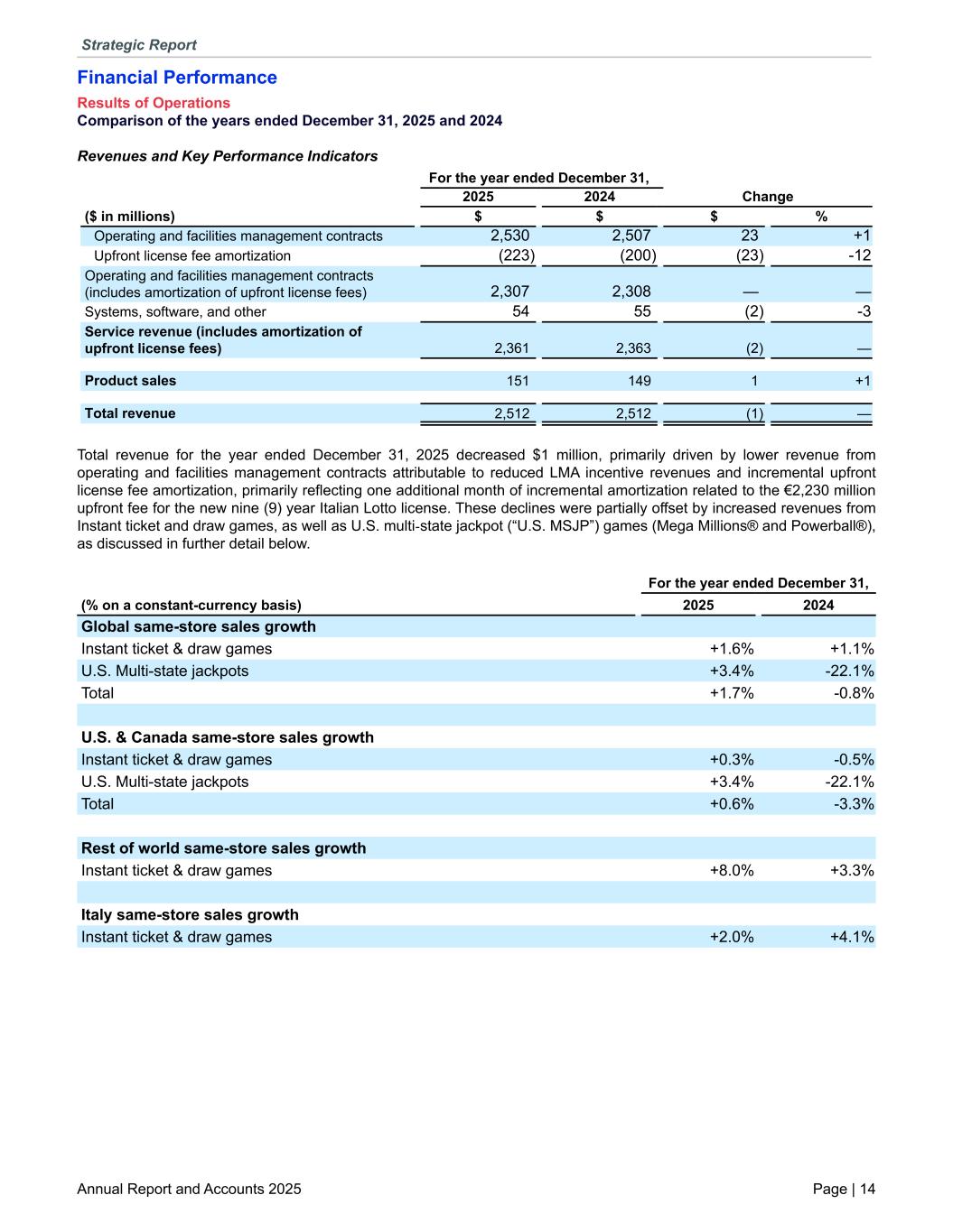 Financial Performance Results of Operations Comparison of the years ended December 31, 2025 and 2024 Revenues and Key Performance Indicators For the year ended December 31, 2025 2024 Change ($ in millions) $ $ $ % Operating and facilities management contracts 2,530 2,507 23 +1 Upfront license fee amortization (223) (200) (23) -12 Operating and facilities management contracts (includes amortization of upfront license fees) 2,307 2,308 — — Systems, software, and other 54 55 (2) -3 Service revenue (includes amortization of upfront license fees) 2,361 2,363 (2) — Product sales 151 149 1 +1 Total revenue 2,512 2,512 (1) — Total revenue for the year ended December 31, 2025 decreased $1 million, primarily driven by lower revenue from operating and facilities management contracts attributable to reduced LMA incentive revenues and incremental upfront license fee amortization, primarily reflecting one additional month of incremental amortization related to the €2,230 million upfront fee for the new nine (9) year Italian Lotto license. These declines were partially offset by increased revenues from Instant ticket and draw games, as well as U.S. multi-state jackpot (“U.S. MSJP”) games (Mega Millions® and Powerball®), as discussed in further detail below. For the year ended December 31, (% on a constant-currency basis) 2025 2024 Global same-store sales growth Instant ticket & draw games +1.6 % +1.1 % U.S. Multi-state jackpots +3.4 % -22.1 % Total +1.7 % -0.8 % U.S. & Canada same-store sales growth Instant ticket & draw games +0.3 % -0.5 % U.S. Multi-state jackpots +3.4 % -22.1 % Total +0.6 % -3.3 % Rest of world same-store sales growth Instant ticket & draw games +8.0 % +3.3 % Italy same-store sales growth Instant ticket & draw games +2.0 % +4.1 % Strategic Report Annual Report and Accounts 2025 Page | 14