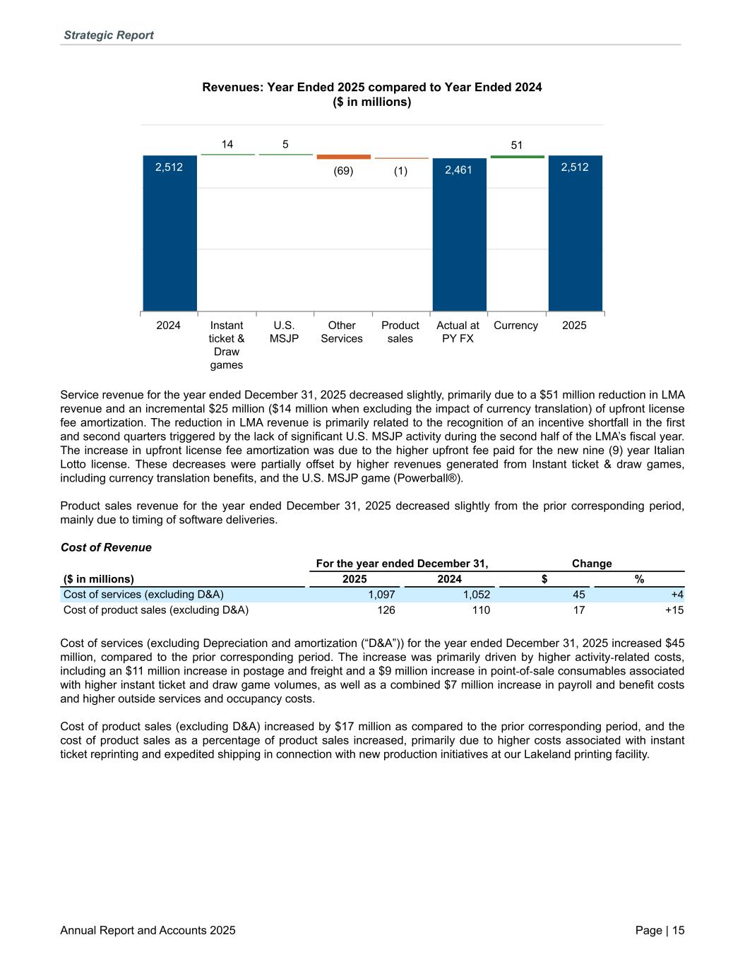 Revenues: Year Ended 2025 compared to Year Ended 2024 ($ in millions) 2,512 14 5 (69) (1) 2,461 51 2,512 2024 Instant ticket & Draw games U.S. MSJP Other Services Product sales Actual at PY FX Currency 2025 Service revenue for the year ended December 31, 2025 decreased slightly, primarily due to a $51 million reduction in LMA revenue and an incremental $25 million ($14 million when excluding the impact of currency translation) of upfront license fee amortization. The reduction in LMA revenue is primarily related to the recognition of an incentive shortfall in the first and second quarters triggered by the lack of significant U.S. MSJP activity during the second half of the LMA’s fiscal year. The increase in upfront license fee amortization was due to the higher upfront fee paid for the new nine (9) year Italian Lotto license. These decreases were partially offset by higher revenues generated from Instant ticket & draw games, including currency translation benefits, and the U.S. MSJP game (Powerball®). Product sales revenue for the year ended December 31, 2025 decreased slightly from the prior corresponding period, mainly due to timing of software deliveries. Cost of Revenue For the year ended December 31, Change ($ in millions) 2025 2024 $ % Cost of services (excluding D&A) 1,097 1,052 45 +4 Cost of product sales (excluding D&A) 126 110 17 +15 Cost of services (excluding Depreciation and amortization (“D&A”)) for the year ended December 31, 2025 increased $45 million, compared to the prior corresponding period. The increase was primarily driven by higher activity-related costs, including an $11 million increase in postage and freight and a $9 million increase in point-of-sale consumables associated with higher instant ticket and draw game volumes, as well as a combined $7 million increase in payroll and benefit costs and higher outside services and occupancy costs. Cost of product sales (excluding D&A) increased by $17 million as compared to the prior corresponding period, and the cost of product sales as a percentage of product sales increased, primarily due to higher costs associated with instant ticket reprinting and expedited shipping in connection with new production initiatives at our Lakeland printing facility. Strategic Report Annual Report and Accounts 2025 Page | 15