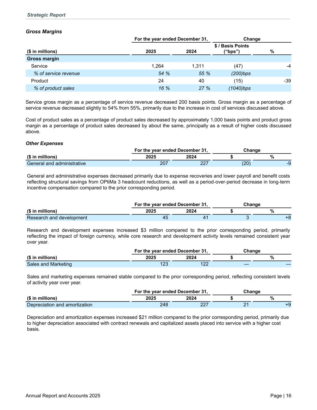 Gross Margins For the year ended December 31, Change ($ in millions) 2025 2024 $ / Basis Points (“bps”) % Gross margin Service 1,264 1,311 (47) -4 % of service revenue 54 % 55 % (200) bps Product 24 40 (15) -39 % of product sales 16 % 27 % (1040) bps Service gross margin as a percentage of service revenue decreased 200 basis points. Gross margin as a percentage of service revenue decreased slightly to 54% from 55%, primarily due to the increase in cost of services discussed above. Cost of product sales as a percentage of product sales decreased by approximately 1,000 basis points and product gross margin as a percentage of product sales decreased by about the same, principally as a result of higher costs discussed above. Other Expenses For the year ended December 31, Change ($ in millions) 2025 2024 $ % General and administrative 207 227 (20) -9 General and administrative expenses decreased primarily due to expense recoveries and lower payroll and benefit costs reflecting structural savings from OPtiMa 3 headcount reductions, as well as a period-over-period decrease in long-term incentive compensation compared to the prior corresponding period. For the year ended December 31, Change ($ in millions) 2025 2024 $ % Research and development 45 41 3 +8 Research and development expenses increased $3 million compared to the prior corresponding period, primarily reflecting the impact of foreign currency, while core research and development activity levels remained consistent year over year. For the year ended December 31, Change ($ in millions) 2025 2024 $ % Sales and Marketing 123 122 — — Sales and marketing expenses remained stable compared to the prior corresponding period, reflecting consistent levels of activity year over year. For the year ended December 31, Change ($ in millions) 2025 2024 $ % Depreciation and amortization 248 227 21 +9 Depreciation and amortization expenses increased $21 million compared to the prior corresponding period, primarily due to higher depreciation associated with contract renewals and capitalized assets placed into service with a higher cost basis. Strategic Report Annual Report and Accounts 2025 Page | 16