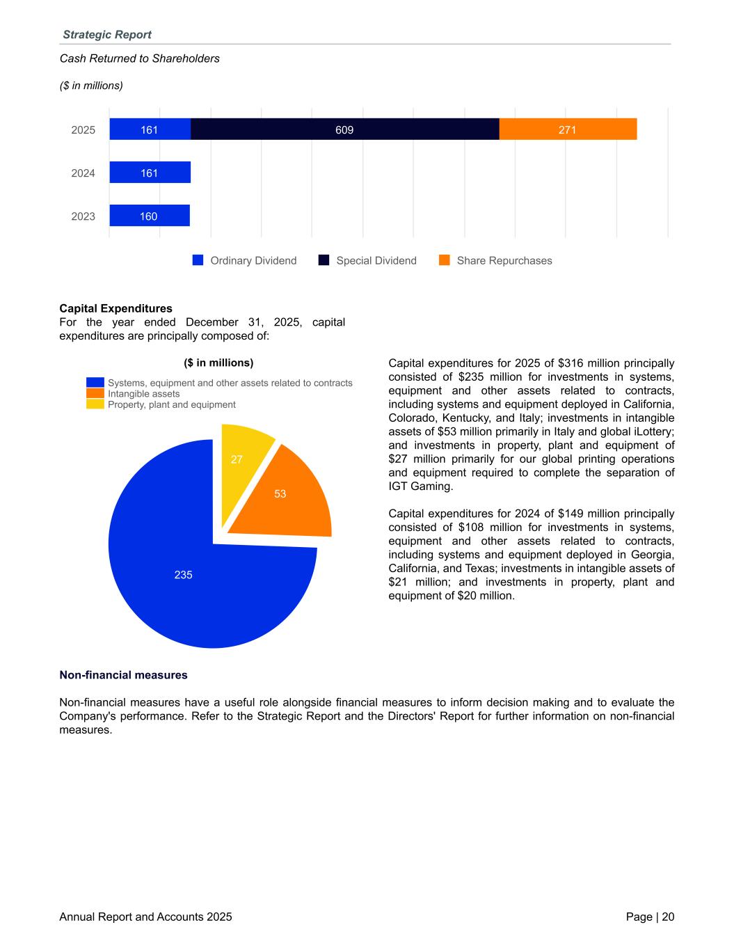 Cash Returned to Shareholders ($ in millions) 161 161 160 609 271 Ordinary Dividend Special Dividend Share Repurchases 2025 2024 2023 Capital Expenditures For the year ended December 31, 2025, capital expenditures are principally composed of: ($ in millions) 27 53 235 Systems, equipment and other assets related to contracts Intangible assets Property, plant and equipment Capital expenditures for 2025 of $316 million principally consisted of $235 million for investments in systems, equipment and other assets related to contracts, including systems and equipment deployed in California, Colorado, Kentucky, and Italy; investments in intangible assets of $53 million primarily in Italy and global iLottery; and investments in property, plant and equipment of $27 million primarily for our global printing operations and equipment required to complete the separation of IGT Gaming. Capital expenditures for 2024 of $149 million principally consisted of $108 million for investments in systems, equipment and other assets related to contracts, including systems and equipment deployed in Georgia, California, and Texas; investments in intangible assets of $21 million; and investments in property, plant and equipment of $20 million. Non-financial measures Non-financial measures have a useful role alongside financial measures to inform decision making and to evaluate the Company's performance. Refer to the Strategic Report and the Directors' Report for further information on non-financial measures. Strategic Report Annual Report and Accounts 2025 Page | 20