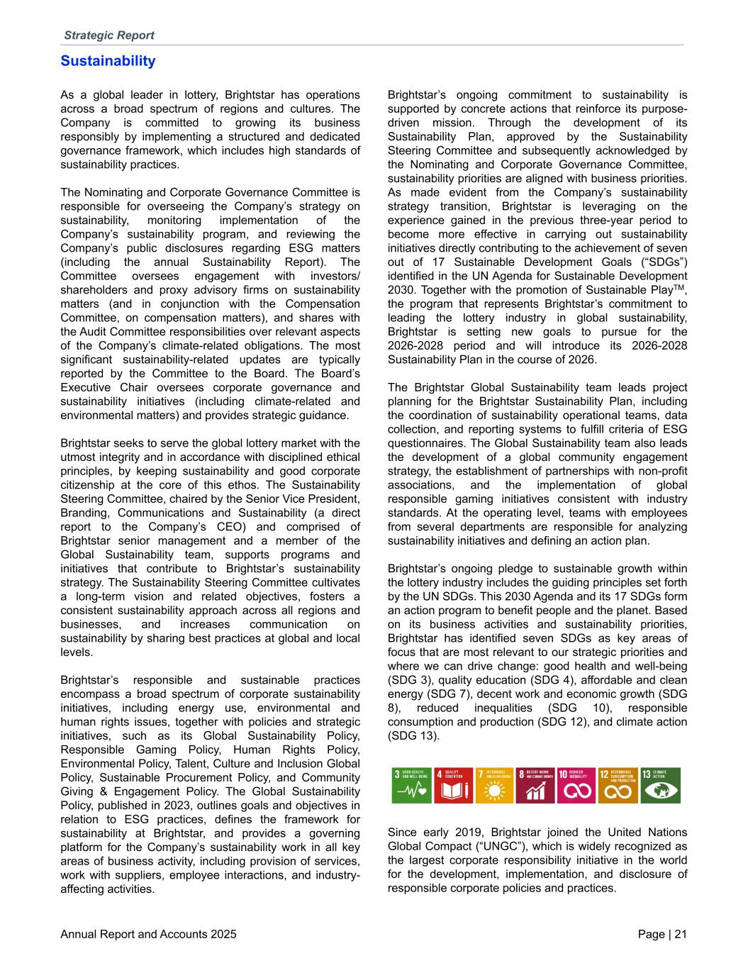 Sustainability As a global leader in lottery, Brightstar has operations across a broad spectrum of regions and cultures. The Company is committed to growing its business responsibly by implementing a structured and dedicated governance framework, which includes high standards of sustainability practices. The Nominating and Corporate Governance Committee is responsible for overseeing the Company’s strategy on sustainability, monitoring implementation of the Company’s sustainability program, and reviewing the Company’s public disclosures regarding ESG matters (including the annual Sustainability Report). The Committee oversees engagement with investors/ shareholders and proxy advisory firms on sustainability matters (and in conjunction with the Compensation Committee, on compensation matters), and shares with the Audit Committee responsibilities over relevant aspects of the Company’s climate-related obligations. The most significant sustainability-related updates are typically reported by the Committee to the Board. The Board’s Executive Chair oversees corporate governance and sustainability initiatives (including climate-related and environmental matters) and provides strategic guidance. Brightstar seeks to serve the global lottery market with the utmost integrity and in accordance with disciplined ethical principles, by keeping sustainability and good corporate citizenship at the core of this ethos. The Sustainability Steering Committee, chaired by the Senior Vice President, Branding, Communications and Sustainability (a direct report to the Company’s CEO) and comprised of Brightstar senior management and a member of the Global Sustainability team, supports programs and initiatives that contribute to Brightstar’s sustainability strategy. The Sustainability Steering Committee cultivates a long-term vision and related objectives, fosters a consistent sustainability approach across all regions and businesses, and increases communication on sustainability by sharing best practices at global and local levels. Brightstar’s responsible and sustainable practices encompass a broad spectrum of corporate sustainability initiatives, including energy use, environmental and human rights issues, together with policies and strategic initiatives, such as its Global Sustainability Policy, Responsible Gaming Policy, Human Rights Policy, Environmental Policy, Talent, Culture and Inclusion Global Policy, Sustainable Procurement Policy, and Community Giving & Engagement Policy. The Global Sustainability Policy, published in 2023, outlines goals and objectives in relation to ESG practices, defines the framework for sustainability at Brightstar, and provides a governing platform for the Company’s sustainability work in all key areas of business activity, including provision of services, work with suppliers, employee interactions, and industry- affecting activities. Brightstar’s ongoing commitment to sustainability is supported by concrete actions that reinforce its purpose- driven mission. Through the development of its Sustainability Plan, approved by the Sustainability Steering Committee and subsequently acknowledged by the Nominating and Corporate Governance Committee, sustainability priorities are aligned with business priorities. As made evident from the Company’s sustainability strategy transition, Brightstar is leveraging on the experience gained in the previous three-year period to become more effective in carrying out sustainability initiatives directly contributing to the achievement of seven out of 17 Sustainable Development Goals (“SDGs”) identified in the UN Agenda for Sustainable Development 2030. Together with the promotion of Sustainable PlayTM, the program that represents Brightstar’s commitment to leading the lottery industry in global sustainability, Brightstar is setting new goals to pursue for the 2026-2028 period and will introduce its 2026-2028 Sustainability Plan in the course of 2026. The Brightstar Global Sustainability team leads project planning for the Brightstar Sustainability Plan, including the coordination of sustainability operational teams, data collection, and reporting systems to fulfill criteria of ESG questionnaires. The Global Sustainability team also leads the development of a global community engagement strategy, the establishment of partnerships with non-profit associations, and the implementation of global responsible gaming initiatives consistent with industry standards. At the operating level, teams with employees from several departments are responsible for analyzing sustainability initiatives and defining an action plan. Brightstar’s ongoing pledge to sustainable growth within the lottery industry includes the guiding principles set forth by the UN SDGs. This 2030 Agenda and its 17 SDGs form an action program to benefit people and the planet. Based on its business activities and sustainability priorities, Brightstar has identified seven SDGs as key areas of focus that are most relevant to our strategic priorities and where we can drive change: good health and well-being (SDG 3), quality education (SDG 4), affordable and clean energy (SDG 7), decent work and economic growth (SDG 8), reduced inequalities (SDG 10), responsible consumption and production (SDG 12), and climate action (SDG 13). Since early 2019, Brightstar joined the United Nations Global Compact (“UNGC”), which is widely recognized as the largest corporate responsibility initiative in the world for the development, implementation, and disclosure of responsible corporate policies and practices. Strategic Report Annual Report and Accounts 2025 Page | 21