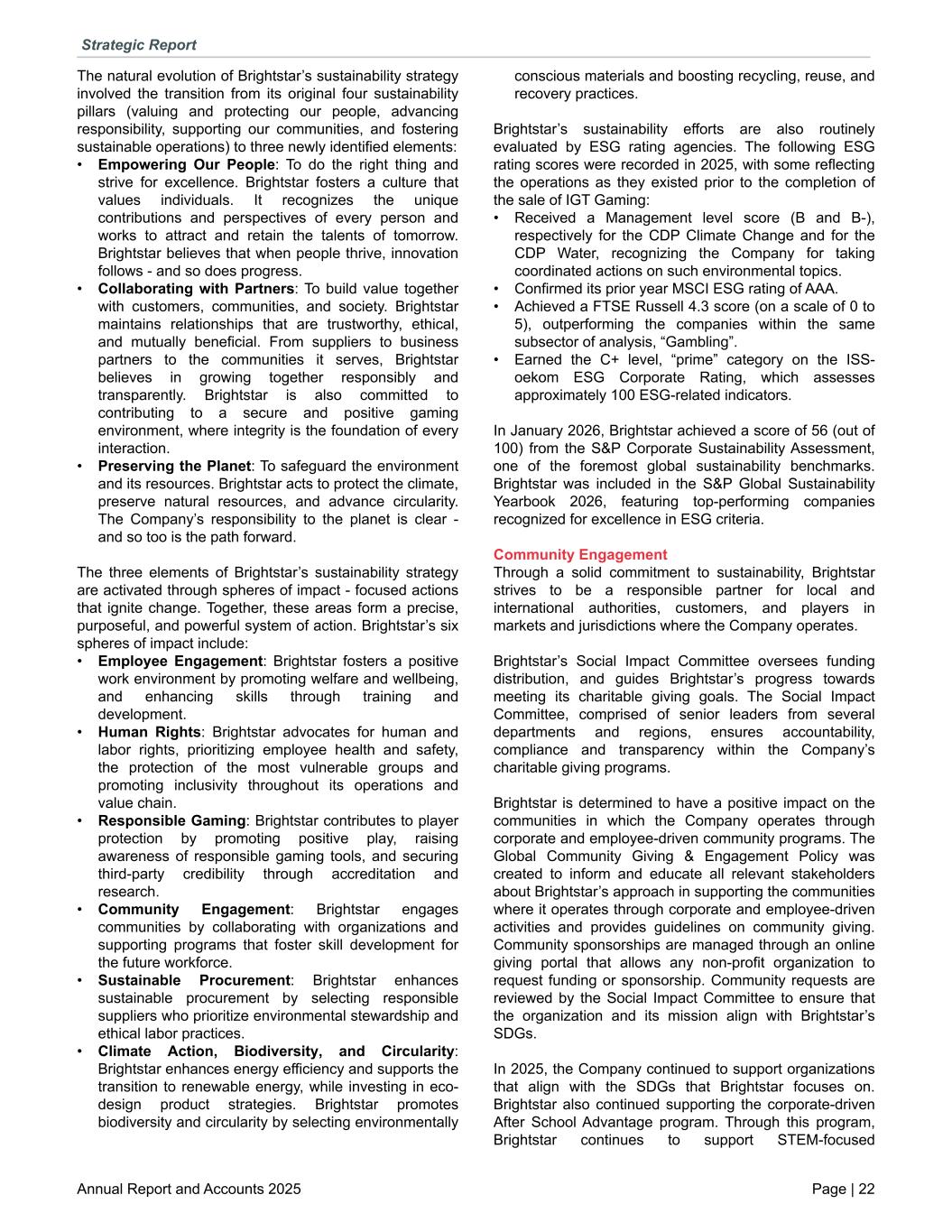 The natural evolution of Brightstar’s sustainability strategy involved the transition from its original four sustainability pillars (valuing and protecting our people, advancing responsibility, supporting our communities, and fostering sustainable operations) to three newly identified elements: • Empowering Our People: To do the right thing and strive for excellence. Brightstar fosters a culture that values individuals. It recognizes the unique contributions and perspectives of every person and works to attract and retain the talents of tomorrow. Brightstar believes that when people thrive, innovation follows - and so does progress. • Collaborating with Partners: To build value together with customers, communities, and society. Brightstar maintains relationships that are trustworthy, ethical, and mutually beneficial. From suppliers to business partners to the communities it serves, Brightstar believes in growing together responsibly and transparently. Brightstar is also committed to contributing to a secure and positive gaming environment, where integrity is the foundation of every interaction. • Preserving the Planet: To safeguard the environment and its resources. Brightstar acts to protect the climate, preserve natural resources, and advance circularity. The Company’s responsibility to the planet is clear - and so too is the path forward. The three elements of Brightstar’s sustainability strategy are activated through spheres of impact - focused actions that ignite change. Together, these areas form a precise, purposeful, and powerful system of action. Brightstar’s six spheres of impact include: • Employee Engagement: Brightstar fosters a positive work environment by promoting welfare and wellbeing, and enhancing skills through training and development. • Human Rights: Brightstar advocates for human and labor rights, prioritizing employee health and safety, the protection of the most vulnerable groups and promoting inclusivity throughout its operations and value chain. • Responsible Gaming: Brightstar contributes to player protection by promoting positive play, raising awareness of responsible gaming tools, and securing third-party credibility through accreditation and research. • Community Engagement: Brightstar engages communities by collaborating with organizations and supporting programs that foster skill development for the future workforce. • Sustainable Procurement: Brightstar enhances sustainable procurement by selecting responsible suppliers who prioritize environmental stewardship and ethical labor practices. • Climate Action, Biodiversity, and Circularity: Brightstar enhances energy efficiency and supports the transition to renewable energy, while investing in eco- design product strategies. Brightstar promotes biodiversity and circularity by selecting environmentally conscious materials and boosting recycling, reuse, and recovery practices. Brightstar’s sustainability efforts are also routinely evaluated by ESG rating agencies. The following ESG rating scores were recorded in 2025, with some reflecting the operations as they existed prior to the completion of the sale of IGT Gaming: • Received a Management level score (B and B-), respectively for the CDP Climate Change and for the CDP Water, recognizing the Company for taking coordinated actions on such environmental topics. • Confirmed its prior year MSCI ESG rating of AAA. • Achieved a FTSE Russell 4.3 score (on a scale of 0 to 5), outperforming the companies within the same subsector of analysis, “Gambling”. • Earned the C+ level, “prime” category on the ISS- oekom ESG Corporate Rating, which assesses approximately 100 ESG-related indicators. In January 2026, Brightstar achieved a score of 56 (out of 100) from the S&P Corporate Sustainability Assessment, one of the foremost global sustainability benchmarks. Brightstar was included in the S&P Global Sustainability Yearbook 2026, featuring top-performing companies recognized for excellence in ESG criteria. Community Engagement Through a solid commitment to sustainability, Brightstar strives to be a responsible partner for local and international authorities, customers, and players in markets and jurisdictions where the Company operates. Brightstar’s Social Impact Committee oversees funding distribution, and guides Brightstar’s progress towards meeting its charitable giving goals. The Social Impact Committee, comprised of senior leaders from several departments and regions, ensures accountability, compliance and transparency within the Company’s charitable giving programs. Brightstar is determined to have a positive impact on the communities in which the Company operates through corporate and employee-driven community programs. The Global Community Giving & Engagement Policy was created to inform and educate all relevant stakeholders about Brightstar’s approach in supporting the communities where it operates through corporate and employee-driven activities and provides guidelines on community giving. Community sponsorships are managed through an online giving portal that allows any non-profit organization to request funding or sponsorship. Community requests are reviewed by the Social Impact Committee to ensure that the organization and its mission align with Brightstar’s SDGs. In 2025, the Company continued to support organizations that align with the SDGs that Brightstar focuses on. Brightstar also continued supporting the corporate-driven After School Advantage program. Through this program, Brightstar continues to support STEM-focused Strategic Report Annual Report and Accounts 2025 Page | 22