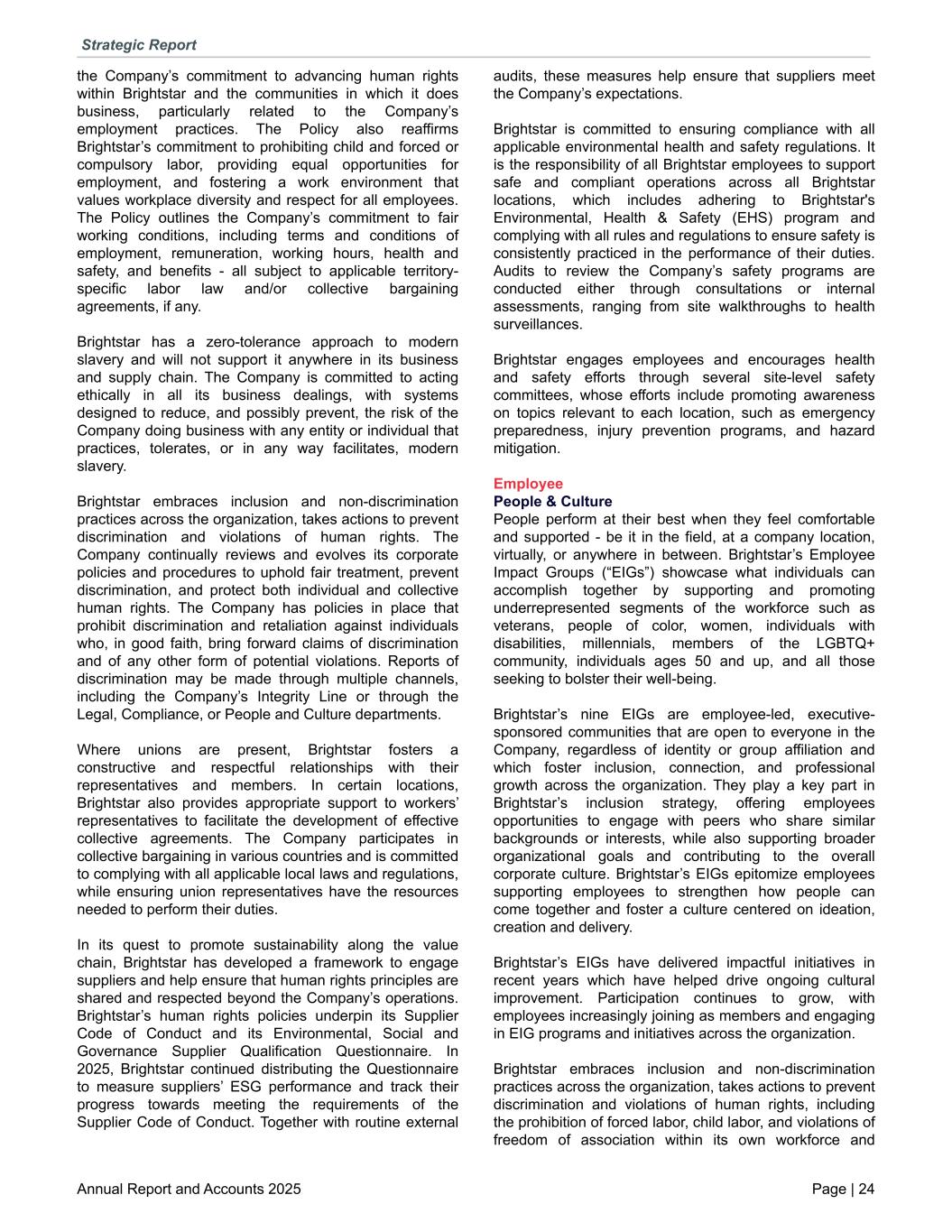 the Company’s commitment to advancing human rights within Brightstar and the communities in which it does business, particularly related to the Company’s employment practices. The Policy also reaffirms Brightstar’s commitment to prohibiting child and forced or compulsory labor, providing equal opportunities for employment, and fostering a work environment that values workplace diversity and respect for all employees. The Policy outlines the Company’s commitment to fair working conditions, including terms and conditions of employment, remuneration, working hours, health and safety, and benefits - all subject to applicable territory- specific labor law and/or collective bargaining agreements, if any. Brightstar has a zero-tolerance approach to modern slavery and will not support it anywhere in its business and supply chain. The Company is committed to acting ethically in all its business dealings, with systems designed to reduce, and possibly prevent, the risk of the Company doing business with any entity or individual that practices, tolerates, or in any way facilitates, modern slavery. Brightstar embraces inclusion and non-discrimination practices across the organization, takes actions to prevent discrimination and violations of human rights. The Company continually reviews and evolves its corporate policies and procedures to uphold fair treatment, prevent discrimination, and protect both individual and collective human rights. The Company has policies in place that prohibit discrimination and retaliation against individuals who, in good faith, bring forward claims of discrimination and of any other form of potential violations. Reports of discrimination may be made through multiple channels, including the Company’s Integrity Line or through the Legal, Compliance, or People and Culture departments. Where unions are present, Brightstar fosters a constructive and respectful relationships with their representatives and members. In certain locations, Brightstar also provides appropriate support to workers’ representatives to facilitate the development of effective collective agreements. The Company participates in collective bargaining in various countries and is committed to complying with all applicable local laws and regulations, while ensuring union representatives have the resources needed to perform their duties. In its quest to promote sustainability along the value chain, Brightstar has developed a framework to engage suppliers and help ensure that human rights principles are shared and respected beyond the Company’s operations. Brightstar’s human rights policies underpin its Supplier Code of Conduct and its Environmental, Social and Governance Supplier Qualification Questionnaire. In 2025, Brightstar continued distributing the Questionnaire to measure suppliers’ ESG performance and track their progress towards meeting the requirements of the Supplier Code of Conduct. Together with routine external audits, these measures help ensure that suppliers meet the Company’s expectations. Brightstar is committed to ensuring compliance with all applicable environmental health and safety regulations. It is the responsibility of all Brightstar employees to support safe and compliant operations across all Brightstar locations, which includes adhering to Brightstar's Environmental, Health & Safety (EHS) program and complying with all rules and regulations to ensure safety is consistently practiced in the performance of their duties. Audits to review the Company’s safety programs are conducted either through consultations or internal assessments, ranging from site walkthroughs to health surveillances. Brightstar engages employees and encourages health and safety efforts through several site-level safety committees, whose efforts include promoting awareness on topics relevant to each location, such as emergency preparedness, injury prevention programs, and hazard mitigation. Employee People & Culture People perform at their best when they feel comfortable and supported - be it in the field, at a company location, virtually, or anywhere in between. Brightstar’s Employee Impact Groups (“EIGs”) showcase what individuals can accomplish together by supporting and promoting underrepresented segments of the workforce such as veterans, people of color, women, individuals with disabilities, millennials, members of the LGBTQ+ community, individuals ages 50 and up, and all those seeking to bolster their well-being. Brightstar’s nine EIGs are employee-led, executive- sponsored communities that are open to everyone in the Company, regardless of identity or group affiliation and which foster inclusion, connection, and professional growth across the organization. They play a key part in Brightstar’s inclusion strategy, offering employees opportunities to engage with peers who share similar backgrounds or interests, while also supporting broader organizational goals and contributing to the overall corporate culture. Brightstar’s EIGs epitomize employees supporting employees to strengthen how people can come together and foster a culture centered on ideation, creation and delivery. Brightstar’s EIGs have delivered impactful initiatives in recent years which have helped drive ongoing cultural improvement. Participation continues to grow, with employees increasingly joining as members and engaging in EIG programs and initiatives across the organization. Brightstar embraces inclusion and non-discrimination practices across the organization, takes actions to prevent discrimination and violations of human rights, including the prohibition of forced labor, child labor, and violations of freedom of association within its own workforce and Strategic Report Annual Report and Accounts 2025 Page | 24