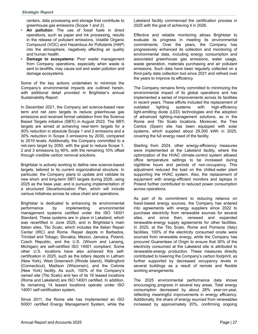 centers, data processing and storage that contribute to greenhouse gas emissions (Scope 1 and 2). • Air pollution: The use of fossil fuels in direct operations, such as paper and ink processing, results in the release of pollutant emissions, Volatile Organic Compound (VOC) and Hazardous Air Pollutants (HAP) into the atmosphere, negatively affecting air quality and human health. • Damage to ecosystems: Poor waste management from Company operations, especially when waste is sent to landfills, may cause soil and water pollution and damage ecosystems. Some of the key actions undertaken to minimize the Company’s environmental impacts are outlined herein, with additional detail provided in Brightstar’s annual Sustainability Report. In December 2021, the Company set science-based near term and net zero targets to reduce greenhouse gas emissions and received formal validation from the Science Based Targets initiative (SBTi) in August 2023. The SBTi targets are aimed at achieving near-term targets for a 50% reduction in absolute Scope 1 and 2 emissions and a 30% reduction in Scope 3 emissions by 2030, compared to 2019 levels. Additionally, the Company committed to a net-zero target by 2050, with the goal to reduce Scope 1, 2 and 3 emissions by 90%, with the remaining 10% offset through credible carbon removal solutions. Brightstar is actively working to define new science-based targets, tailored to its current organizational structure. In particular, the Company plans to update and validate its new short- and long-term SBTi targets during 2026, using 2025 as the base year, and is pursuing implementation of a structured Decarbonization Plan, which will include various initiatives across its value chain and operations. Brightstar is dedicated to enhancing its environmental performance by implementing environmental management systems certified under the ISO 14001 Standard. These systems are in place in Lakeland, which was recertified in June 2025, and in Brightstar’s main Italian sites, Tito Scalo, which includes the Italian Repair Center (IRC) and Rome. Repair depots in Barbados, Trinidad and Tobago, Slovakia, Mexico, Jamaica, Poland, Czech Republic, and the U.S. (Wixom and Lansing, Michigan) are self-certified ISO 14001 compliant. Some other U.S. locations have also achieved this self- certification in 2025, such as the lottery depots in Latham (New York), West Greenwich (Rhode Island), Wallingford (Connecticut), Madison (Wisconsin), and the Colonie (New York) facility. As such, 100% of the Company’s owned site (Tito Scalo) and two of its 16 leased locations (Rome and Lakeland) are ISO 14001 certified. In addition, its remaining 14 leased locations operate under ISO 14001 self-certification system. Since 2011, the Rome site has implemented an ISO 50001 certified Energy Management System, while the Lakeland facility commenced the certification process in 2025 with the goal of achieving it in 2026. Effective and reliable monitoring allows Brightstar to evaluate its progress in meeting its environmental commitments. Over the years, the Company has progressively enhanced its collection and monitoring of environmental data, including energy consumption and associated greenhouse gas emissions, water usage, waste generation, materials purchasing and air pollutant emissions. Such data have been regularly collected on a third-party data collection tool since 2021 and refined over the years to improve its efficiency. The Company remains firmly committed to minimizing the environmental impact of its global operations and has implemented a series of improvements across its facilities in recent years. These efforts included the replacement of outdated lighting systems with high-efficiency light-emitting diode (LED) technologies and the adoption of advanced lighting-management solutions, as in the Rome and Tito Scalo locations. Moreover, the Tres Cantos (Spain) site has been equipped with solar systems, which supplied about 29,300 kWh in 2025, covering the full energy need of the facility. Starting from 2024, other energy-efficiency measures were implemented at the Lakeland facility, where the optimization of the HVAC climate-control system allowed office temperature settings to be increased during nighttime hours and periods of non-occupancy. This adjustment reduced the load on the chilled-water plant supporting the HVAC system. Also, the replacement of equipment with energy-efficient monitors and laptops in Poland further contributed to reduced power consumption across operations. As part of its commitment to reducing reliance on fossil-based energy sources, the Company has entered into agreements with energy suppliers since 2022 to purchase electricity from renewable sources for several sites, and since then, renewed and expanded renewable-energy supply agreements for other facilities. In 2025, at the Tito Scalo, Rome and Pomezia (Italy) facilities, 100% of the electricity consumed onsite were sourced from renewable energy, while the Company has procured Guarantees of Origin to ensure that 30% of the electricity consumed at the Lakeland site is attributed to renewable-energy production. These measures directly contributed to lowering the Company’s carbon footprint, as further supported by decreased occupancy levels in several buildings as a result of remote and flexible working arrangements. The 2025 environmental performance data shows encouraging progress in several key areas. Total energy consumption decreased by about 28% year-on-year, reflecting meaningful improvements in energy efficiency. Additionally, the share of energy sourced from renewables increased by approximately 20%, confirming ongoing Strategic Report Annual Report and Accounts 2025 Page | 27