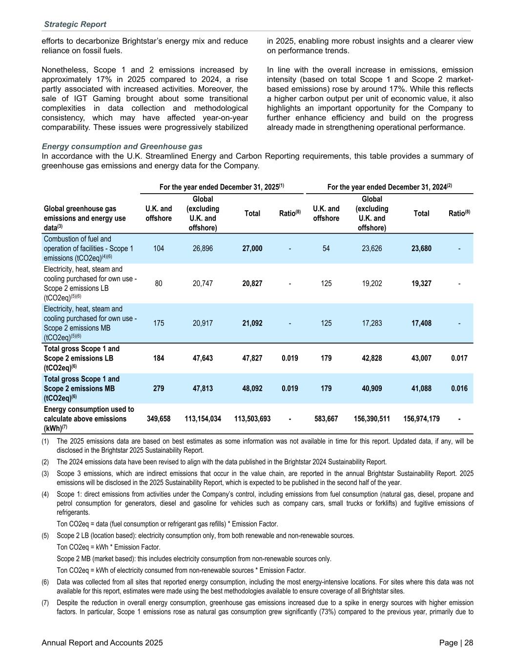efforts to decarbonize Brightstar’s energy mix and reduce reliance on fossil fuels. Nonetheless, Scope 1 and 2 emissions increased by approximately 17% in 2025 compared to 2024, a rise partly associated with increased activities. Moreover, the sale of IGT Gaming brought about some transitional complexities in data collection and methodological consistency, which may have affected year-on-year comparability. These issues were progressively stabilized in 2025, enabling more robust insights and a clearer view on performance trends. In line with the overall increase in emissions, emission intensity (based on total Scope 1 and Scope 2 market- based emissions) rose by around 17%. While this reflects a higher carbon output per unit of economic value, it also highlights an important opportunity for the Company to further enhance efficiency and build on the progress already made in strengthening operational performance. Energy consumption and Greenhouse gas In accordance with the U.K. Streamlined Energy and Carbon Reporting requirements, this table provides a summary of greenhouse gas emissions and energy data for the Company. Global greenhouse gas emissions and energy use data(3) For the year ended December 31, 2025(1) For the year ended December 31, 2024(2) U.K. and offshore Global (excluding U.K. and offshore) Total Ratio(8) U.K. and offshore Global (excluding U.K. and offshore) Total Ratio(8) Combustion of fuel and operation of facilities - Scope 1 emissions (tCO2eq)(4)(6) 104 26,896 27,000 - 54 23,626 23,680 - Electricity, heat, steam and cooling purchased for own use - Scope 2 emissions LB (tCO2eq)(5)(6) 80 20,747 20,827 - 125 19,202 19,327 - Electricity, heat, steam and cooling purchased for own use - Scope 2 emissions MB (tCO2eq)(5)(6) 175 20,917 21,092 - 125 17,283 17,408 - Total gross Scope 1 and Scope 2 emissions LB (tCO2eq)(6) 184 47,643 47,827 0.019 179 42,828 43,007 0.017 Total gross Scope 1 and Scope 2 emissions MB (tCO2eq)(6) 279 47,813 48,092 0.019 179 40,909 41,088 0.016 Energy consumption used to calculate above emissions (kWh)(7) 349,658 113,154,034 113,503,693 - 583,667 156,390,511 156,974,179 - (1) The 2025 emissions data are based on best estimates as some information was not available in time for this report. Updated data, if any, will be disclosed in the Brightstar 2025 Sustainability Report. (2) The 2024 emissions data have been revised to align with the data published in the Brightstar 2024 Sustainability Report. (3) Scope 3 emissions, which are indirect emissions that occur in the value chain, are reported in the annual Brightstar Sustainability Report. 2025 emissions will be disclosed in the 2025 Sustainability Report, which is expected to be published in the second half of the year. (4) Scope 1: direct emissions from activities under the Company’s control, including emissions from fuel consumption (natural gas, diesel, propane and petrol consumption for generators, diesel and gasoline for vehicles such as company cars, small trucks or forklifts) and fugitive emissions of refrigerants. Ton CO2eq = data (fuel consumption or refrigerant gas refills) * Emission Factor. (5) Scope 2 LB (location based): electricity consumption only, from both renewable and non-renewable sources. Ton CO2eq = kWh * Emission Factor. Scope 2 MB (market based): this includes electricity consumption from non-renewable sources only. Ton CO2eq = kWh of electricity consumed from non-renewable sources * Emission Factor. (6) Data was collected from all sites that reported energy consumption, including the most energy-intensive locations. For sites where this data was not available for this report, estimates were made using the best methodologies available to ensure coverage of all Brightstar sites. (7) Despite the reduction in overall energy consumption, greenhouse gas emissions increased due to a spike in energy sources with higher emission factors. In particular, Scope 1 emissions rose as natural gas consumption grew significantly (73%) compared to the previous year, primarily due to Strategic Report Annual Report and Accounts 2025 Page | 28