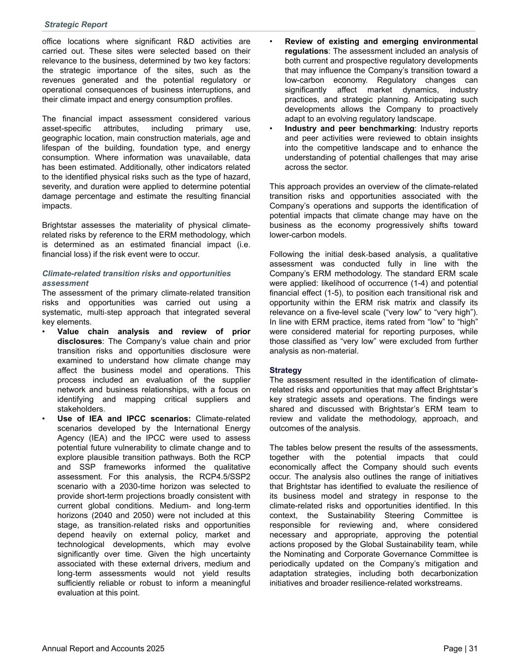 office locations where significant R&D activities are carried out. These sites were selected based on their relevance to the business, determined by two key factors: the strategic importance of the sites, such as the revenues generated and the potential regulatory or operational consequences of business interruptions, and their climate impact and energy consumption profiles. The financial impact assessment considered various asset-specific attributes, including primary use, geographic location, main construction materials, age and lifespan of the building, foundation type, and energy consumption. Where information was unavailable, data has been estimated. Additionally, other indicators related to the identified physical risks such as the type of hazard, severity, and duration were applied to determine potential damage percentage and estimate the resulting financial impacts. Brightstar assesses the materiality of physical climate- related risks by reference to the ERM methodology, which is determined as an estimated financial impact (i.e. financial loss) if the risk event were to occur. Climate-related transition risks and opportunities assessment The assessment of the primary climate-related transition risks and opportunities was carried out using a systematic, multi-step approach that integrated several key elements. • Value chain analysis and review of prior disclosures: The Company’s value chain and prior transition risks and opportunities disclosure were examined to understand how climate change may affect the business model and operations. This process included an evaluation of the supplier network and business relationships, with a focus on identifying and mapping critical suppliers and stakeholders. • Use of IEA and IPCC scenarios: Climate-related scenarios developed by the International Energy Agency (IEA) and the IPCC were used to assess potential future vulnerability to climate change and to explore plausible transition pathways. Both the RCP and SSP frameworks informed the qualitative assessment. For this analysis, the RCP4.5/SSP2 scenario with a 2030-time horizon was selected to provide short-term projections broadly consistent with current global conditions. Medium- and long-term horizons (2040 and 2050) were not included at this stage, as transition-related risks and opportunities depend heavily on external policy, market and technological developments, which may evolve significantly over time. Given the high uncertainty associated with these external drivers, medium and long-term assessments would not yield results sufficiently reliable or robust to inform a meaningful evaluation at this point. • Review of existing and emerging environmental regulations: The assessment included an analysis of both current and prospective regulatory developments that may influence the Company’s transition toward a low-carbon economy. Regulatory changes can significantly affect market dynamics, industry practices, and strategic planning. Anticipating such developments allows the Company to proactively adapt to an evolving regulatory landscape. • Industry and peer benchmarking: Industry reports and peer activities were reviewed to obtain insights into the competitive landscape and to enhance the understanding of potential challenges that may arise across the sector. This approach provides an overview of the climate-related transition risks and opportunities associated with the Company’s operations and supports the identification of potential impacts that climate change may have on the business as the economy progressively shifts toward lower-carbon models. Following the initial desk-based analysis, a qualitative assessment was conducted fully in line with the Company’s ERM methodology. The standard ERM scale were applied: likelihood of occurrence (1-4) and potential financial effect (1-5), to position each transitional risk and opportunity within the ERM risk matrix and classify its relevance on a five-level scale (“very low” to “very high”). In line with ERM practice, items rated from “low” to “high” were considered material for reporting purposes, while those classified as “very low” were excluded from further analysis as non-material. Strategy The assessment resulted in the identification of climate- related risks and opportunities that may affect Brightstar’s key strategic assets and operations. The findings were shared and discussed with Brightstar’s ERM team to review and validate the methodology, approach, and outcomes of the analysis. The tables below present the results of the assessments, together with the potential impacts that could economically affect the Company should such events occur. The analysis also outlines the range of initiatives that Brightstar has identified to evaluate the resilience of its business model and strategy in response to the climate-related risks and opportunities identified. In this context, the Sustainability Steering Committee is responsible for reviewing and, where considered necessary and appropriate, approving the potential actions proposed by the Global Sustainability team, while the Nominating and Corporate Governance Committee is periodically updated on the Company’s mitigation and adaptation strategies, including both decarbonization initiatives and broader resilience-related workstreams. Strategic Report Annual Report and Accounts 2025 Page | 31