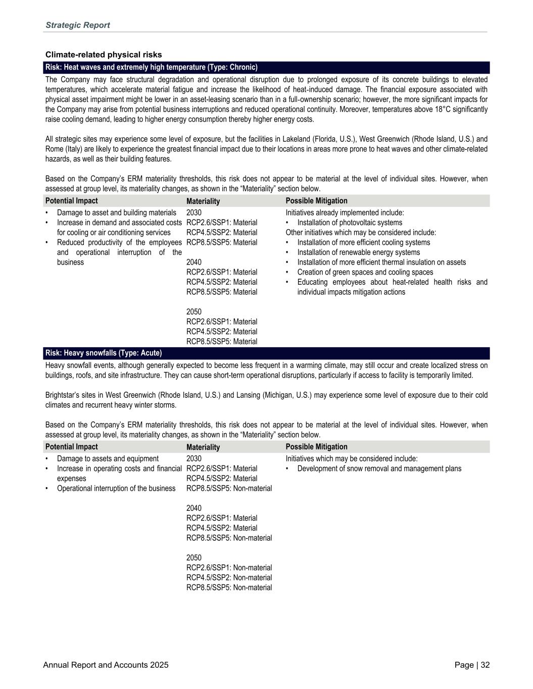 Risk: Heat waves and extremely high temperature (Type: Chronic) The Company may face structural degradation and operational disruption due to prolonged exposure of its concrete buildings to elevated temperatures, which accelerate material fatigue and increase the likelihood of heat-induced damage. The financial exposure associated with physical asset impairment might be lower in an asset-leasing scenario than in a full-ownership scenario; however, the more significant impacts for the Company may arise from potential business interruptions and reduced operational continuity. Moreover, temperatures above 18°C significantly raise cooling demand, leading to higher energy consumption thereby higher energy costs. All strategic sites may experience some level of exposure, but the facilities in Lakeland (Florida, U.S.), West Greenwich (Rhode Island, U.S.) and Rome (Italy) are likely to experience the greatest financial impact due to their locations in areas more prone to heat waves and other climate-related hazards, as well as their building features. Based on the Company’s ERM materiality thresholds, this risk does not appear to be material at the level of individual sites. However, when assessed at group level, its materiality changes, as shown in the “Materiality” section below. Potential Impact Materiality Possible Mitigation • Damage to asset and building materials • Increase in demand and associated costs for cooling or air conditioning services • Reduced productivity of the employees and operational interruption of the business 2030 RCP2.6/SSP1: Material RCP4.5/SSP2: Material RCP8.5/SSP5: Material 2040 RCP2.6/SSP1: Material RCP4.5/SSP2: Material RCP8.5/SSP5: Material 2050 RCP2.6/SSP1: Material RCP4.5/SSP2: Material RCP8.5/SSP5: Material Initiatives already implemented include: • Installation of photovoltaic systems Other initiatives which may be considered include: • Installation of more efficient cooling systems • Installation of renewable energy systems • Installation of more efficient thermal insulation on assets • Creation of green spaces and cooling spaces • Educating employees about heat-related health risks and individual impacts mitigation actions Risk: Heavy snowfalls (Type: Acute) Heavy snowfall events, although generally expected to become less frequent in a warming climate, may still occur and create localized stress on buildings, roofs, and site infrastructure. They can cause short-term operational disruptions, particularly if access to facility is temporarily limited. Brightstar’s sites in West Greenwich (Rhode Island, U.S.) and Lansing (Michigan, U.S.) may experience some level of exposure due to their cold climates and recurrent heavy winter storms. Based on the Company’s ERM materiality thresholds, this risk does not appear to be material at the level of individual sites. However, when assessed at group level, its materiality changes, as shown in the “Materiality” section below. Potential Impact Materiality Possible Mitigation • Damage to assets and equipment • Increase in operating costs and financial expenses • Operational interruption of the business 2030 RCP2.6/SSP1: Material RCP4.5/SSP2: Material RCP8.5/SSP5: Non-material 2040 RCP2.6/SSP1: Material RCP4.5/SSP2: Material RCP8.5/SSP5: Non-material 2050 RCP2.6/SSP1: Non-material RCP4.5/SSP2: Non-material RCP8.5/SSP5: Non-material Initiatives which may be considered include: • Development of snow removal and management plans Climate-related physical risks Strategic Report Annual Report and Accounts 2025 Page | 32