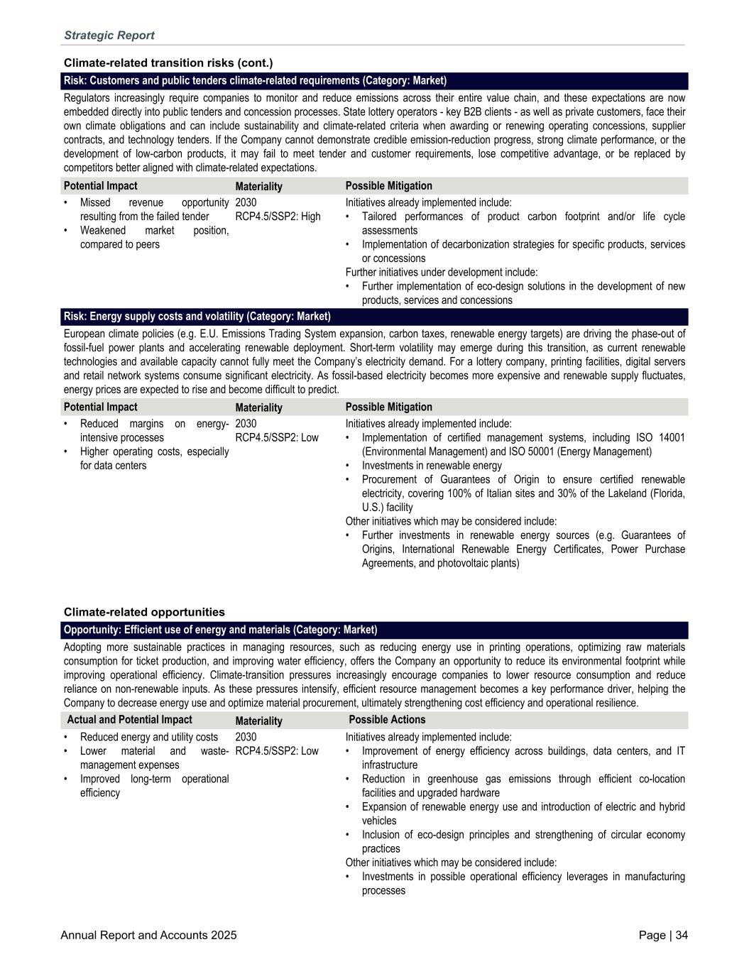 Climate-related transition risks (cont.) Risk: Customers and public tenders climate-related requirements (Category: Market) Regulators increasingly require companies to monitor and reduce emissions across their entire value chain, and these expectations are now embedded directly into public tenders and concession processes. State lottery operators - key B2B clients - as well as private customers, face their own climate obligations and can include sustainability and climate-related criteria when awarding or renewing operating concessions, supplier contracts, and technology tenders. If the Company cannot demonstrate credible emission-reduction progress, strong climate performance, or the development of low-carbon products, it may fail to meet tender and customer requirements, lose competitive advantage, or be replaced by competitors better aligned with climate-related expectations. Potential Impact Materiality Possible Mitigation • Missed revenue opportunity resulting from the failed tender • Weakened market position, compared to peers 2030 RCP4.5/SSP2: High Initiatives already implemented include: • Tailored performances of product carbon footprint and/or life cycle assessments • Implementation of decarbonization strategies for specific products, services or concessions Further initiatives under development include: • Further implementation of eco-design solutions in the development of new products, services and concessions Risk: Energy supply costs and volatility (Category: Market) European climate policies (e.g. E.U. Emissions Trading System expansion, carbon taxes, renewable energy targets) are driving the phase-out of fossil-fuel power plants and accelerating renewable deployment. Short-term volatility may emerge during this transition, as current renewable technologies and available capacity cannot fully meet the Company’s electricity demand. For a lottery company, printing facilities, digital servers and retail network systems consume significant electricity. As fossil-based electricity becomes more expensive and renewable supply fluctuates, energy prices are expected to rise and become difficult to predict. Potential Impact Materiality Possible Mitigation • Reduced margins on energy- intensive processes • Higher operating costs, especially for data centers 2030 RCP4.5/SSP2: Low Initiatives already implemented include: • Implementation of certified management systems, including ISO 14001 (Environmental Management) and ISO 50001 (Energy Management) • Investments in renewable energy • Procurement of Guarantees of Origin to ensure certified renewable electricity, covering 100% of Italian sites and 30% of the Lakeland (Florida, U.S.) facility Other initiatives which may be considered include: • Further investments in renewable energy sources (e.g. Guarantees of Origins, International Renewable Energy Certificates, Power Purchase Agreements, and photovoltaic plants) Climate-related opportunities Opportunity: Efficient use of energy and materials (Category: Market) Adopting more sustainable practices in managing resources, such as reducing energy use in printing operations, optimizing raw materials consumption for ticket production, and improving water efficiency, offers the Company an opportunity to reduce its environmental footprint while improving operational efficiency. Climate-transition pressures increasingly encourage companies to lower resource consumption and reduce reliance on non-renewable inputs. As these pressures intensify, efficient resource management becomes a key performance driver, helping the Company to decrease energy use and optimize material procurement, ultimately strengthening cost efficiency and operational resilience. Actual and Potential Impact Materiality Possible Actions • Reduced energy and utility costs • Lower material and waste- management expenses • Improved long-term operational efficiency 2030 RCP4.5/SSP2: Low Initiatives already implemented include: • Improvement of energy efficiency across buildings, data centers, and IT infrastructure • Reduction in greenhouse gas emissions through efficient co-location facilities and upgraded hardware • Expansion of renewable energy use and introduction of electric and hybrid vehicles • Inclusion of eco-design principles and strengthening of circular economy practices Other initiatives which may be considered include: • Investments in possible operational efficiency leverages in manufacturing processes Strategic Report Annual Report and Accounts 2025 Page | 34