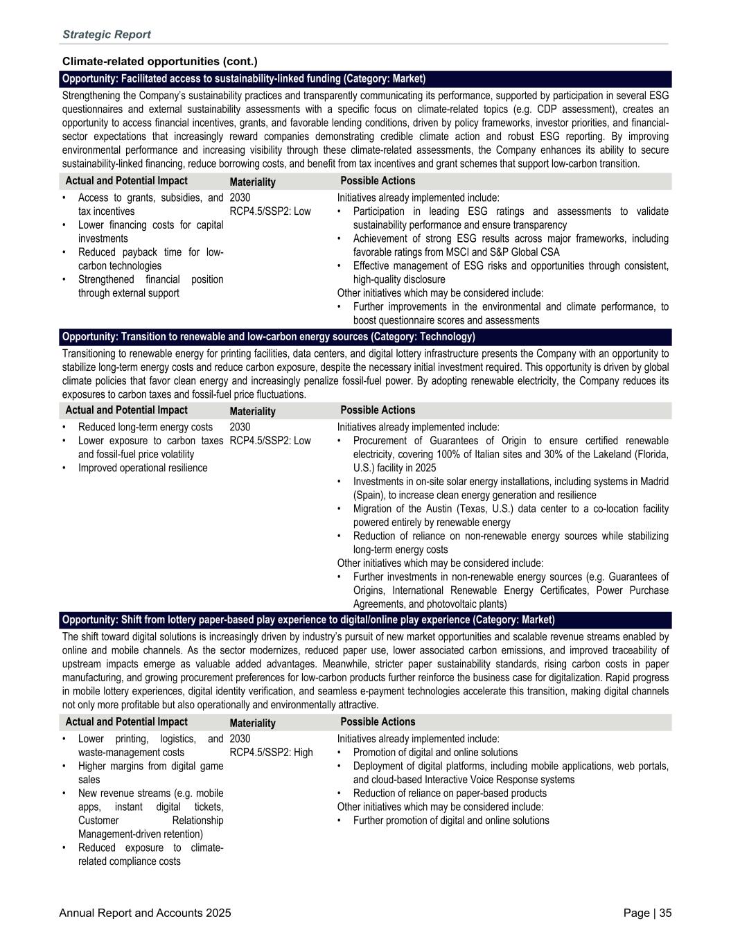 Climate-related opportunities (cont.) Opportunity: Facilitated access to sustainability-linked funding (Category: Market) Strengthening the Company’s sustainability practices and transparently communicating its performance, supported by participation in several ESG questionnaires and external sustainability assessments with a specific focus on climate-related topics (e.g. CDP assessment), creates an opportunity to access financial incentives, grants, and favorable lending conditions, driven by policy frameworks, investor priorities, and financial- sector expectations that increasingly reward companies demonstrating credible climate action and robust ESG reporting. By improving environmental performance and increasing visibility through these climate-related assessments, the Company enhances its ability to secure sustainability-linked financing, reduce borrowing costs, and benefit from tax incentives and grant schemes that support low-carbon transition. Actual and Potential Impact Materiality Possible Actions • Access to grants, subsidies, and tax incentives • Lower financing costs for capital investments • Reduced payback time for low- carbon technologies • Strengthened financial position through external support 2030 RCP4.5/SSP2: Low Initiatives already implemented include: • Participation in leading ESG ratings and assessments to validate sustainability performance and ensure transparency • Achievement of strong ESG results across major frameworks, including favorable ratings from MSCI and S&P Global CSA • Effective management of ESG risks and opportunities through consistent, high-quality disclosure Other initiatives which may be considered include: • Further improvements in the environmental and climate performance, to boost questionnaire scores and assessments Opportunity: Transition to renewable and low-carbon energy sources (Category: Technology) Transitioning to renewable energy for printing facilities, data centers, and digital lottery infrastructure presents the Company with an opportunity to stabilize long-term energy costs and reduce carbon exposure, despite the necessary initial investment required. This opportunity is driven by global climate policies that favor clean energy and increasingly penalize fossil-fuel power. By adopting renewable electricity, the Company reduces its exposures to carbon taxes and fossil-fuel price fluctuations. Actual and Potential Impact Materiality Possible Actions • Reduced long-term energy costs • Lower exposure to carbon taxes and fossil-fuel price volatility • Improved operational resilience 2030 RCP4.5/SSP2: Low Initiatives already implemented include: • Procurement of Guarantees of Origin to ensure certified renewable electricity, covering 100% of Italian sites and 30% of the Lakeland (Florida, U.S.) facility in 2025 • Investments in on-site solar energy installations, including systems in Madrid (Spain), to increase clean energy generation and resilience • Migration of the Austin (Texas, U.S.) data center to a co-location facility powered entirely by renewable energy • Reduction of reliance on non-renewable energy sources while stabilizing long-term energy costs Other initiatives which may be considered include: • Further investments in non-renewable energy sources (e.g. Guarantees of Origins, International Renewable Energy Certificates, Power Purchase Agreements, and photovoltaic plants) Opportunity: Shift from lottery paper-based play experience to digital/online play experience (Category: Market) The shift toward digital solutions is increasingly driven by industry’s pursuit of new market opportunities and scalable revenue streams enabled by online and mobile channels. As the sector modernizes, reduced paper use, lower associated carbon emissions, and improved traceability of upstream impacts emerge as valuable added advantages. Meanwhile, stricter paper sustainability standards, rising carbon costs in paper manufacturing, and growing procurement preferences for low-carbon products further reinforce the business case for digitalization. Rapid progress in mobile lottery experiences, digital identity verification, and seamless e-payment technologies accelerate this transition, making digital channels not only more profitable but also operationally and environmentally attractive. Actual and Potential Impact Materiality Possible Actions • Lower printing, logistics, and waste-management costs • Higher margins from digital game sales • New revenue streams (e.g. mobile apps, instant digital tickets, Customer Relationship Management-driven retention) • Reduced exposure to climate- related compliance costs 2030 RCP4.5/SSP2: High Initiatives already implemented include: • Promotion of digital and online solutions • Deployment of digital platforms, including mobile applications, web portals, and cloud-based Interactive Voice Response systems • Reduction of reliance on paper-based products Other initiatives which may be considered include: • Further promotion of digital and online solutions Strategic Report Annual Report and Accounts 2025 Page | 35