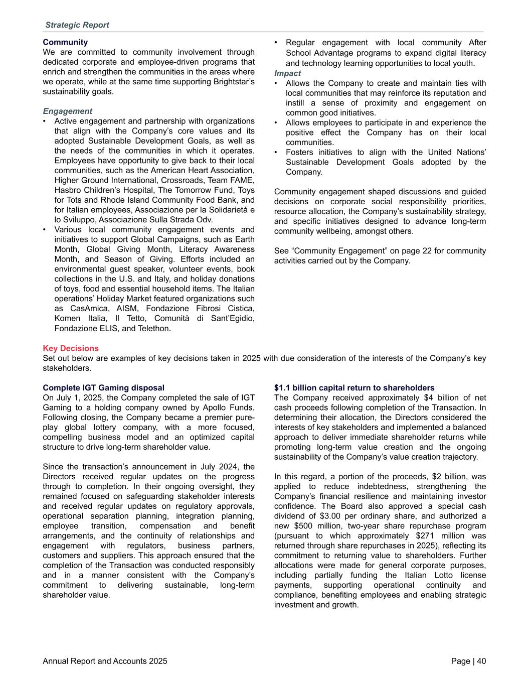 Community We are committed to community involvement through dedicated corporate and employee-driven programs that enrich and strengthen the communities in the areas where we operate, while at the same time supporting Brightstar’s sustainability goals. Engagement • Active engagement and partnership with organizations that align with the Company’s core values and its adopted Sustainable Development Goals, as well as the needs of the communities in which it operates. Employees have opportunity to give back to their local communities, such as the American Heart Association, Higher Ground International, Crossroads, Team FAME, Hasbro Children’s Hospital, The Tomorrow Fund, Toys for Tots and Rhode Island Community Food Bank, and for Italian employees, Associazione per la Solidarietà e lo Sviluppo, Associazione Sulla Strada Odv. • Various local community engagement events and initiatives to support Global Campaigns, such as Earth Month, Global Giving Month, Literacy Awareness Month, and Season of Giving. Efforts included an environmental guest speaker, volunteer events, book collections in the U.S. and Italy, and holiday donations of toys, food and essential household items. The Italian operations’ Holiday Market featured organizations such as CasAmica, AISM, Fondazione Fibrosi Cistica, Komen Italia, Il Tetto, Comunità di Sant’Egidio, Fondazione ELIS, and Telethon. • Regular engagement with local community After School Advantage programs to expand digital literacy and technology learning opportunities to local youth. Impact • Allows the Company to create and maintain ties with local communities that may reinforce its reputation and instill a sense of proximity and engagement on common good initiatives. • Allows employees to participate in and experience the positive effect the Company has on their local communities. • Fosters initiatives to align with the United Nations’ Sustainable Development Goals adopted by the Company. Community engagement shaped discussions and guided decisions on corporate social responsibility priorities, resource allocation, the Company’s sustainability strategy, and specific initiatives designed to advance long-term community wellbeing, amongst others. See “Community Engagement” on page 22 for community activities carried out by the Company. Key Decisions Set out below are examples of key decisions taken in 2025 with due consideration of the interests of the Company’s key stakeholders. Complete IGT Gaming disposal On July 1, 2025, the Company completed the sale of IGT Gaming to a holding company owned by Apollo Funds. Following closing, the Company became a premier pure- play global lottery company, with a more focused, compelling business model and an optimized capital structure to drive long-term shareholder value. Since the transaction’s announcement in July 2024, the Directors received regular updates on the progress through to completion. In their ongoing oversight, they remained focused on safeguarding stakeholder interests and received regular updates on regulatory approvals, operational separation planning, integration planning, employee transition, compensation and benefit arrangements, and the continuity of relationships and engagement with regulators, business partners, customers and suppliers. This approach ensured that the completion of the Transaction was conducted responsibly and in a manner consistent with the Company’s commitment to delivering sustainable, long-term shareholder value. $1.1 billion capital return to shareholders The Company received approximately $4 billion of net cash proceeds following completion of the Transaction. In determining their allocation, the Directors considered the interests of key stakeholders and implemented a balanced approach to deliver immediate shareholder returns while promoting long-term value creation and the ongoing sustainability of the Company’s value creation trajectory. In this regard, a portion of the proceeds, $2 billion, was applied to reduce indebtedness, strengthening the Company’s financial resilience and maintaining investor confidence. The Board also approved a special cash dividend of $3.00 per ordinary share, and authorized a new $500 million, two-year share repurchase program (pursuant to which approximately $271 million was returned through share repurchases in 2025), reflecting its commitment to returning value to shareholders. Further allocations were made for general corporate purposes, including partially funding the Italian Lotto license payments, supporting operational continuity and compliance, benefiting employees and enabling strategic investment and growth. Strategic Report Annual Report and Accounts 2025 Page | 40