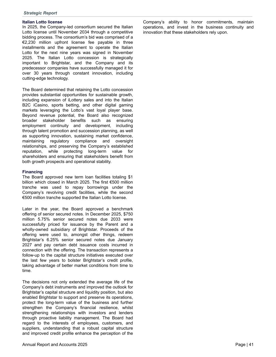 Italian Lotto license In 2025, the Company-led consortium secured the Italian Lotto license until November 2034 through a competitive bidding process. The consortium’s bid was comprised of a €2,230 million upfront license fee payable in three installments and the agreement to operate the Italian Lotto for the next nine years was signed in November 2025. The Italian Lotto concession is strategically important to Brightstar, and the Company and its predecessor companies have successfully managed it for over 30 years through constant innovation, including cutting-edge technology. The Board determined that retaining the Lotto concession provides substantial opportunities for sustainable growth, including expansion of iLottery sales and into the Italian B2C iCasino, sports betting, and other digital gaming markets leveraging the Lotto’s vast loyal player base. Beyond revenue potential, the Board also recognized broader stakeholder benefits such as ensuring employment continuity and development, including through talent promotion and succession planning, as well as supporting innovation, sustaining market confidence, maintaining regulatory compliance and oversight relationships, and preserving the Company’s established reputation, while protecting long-term value for shareholders and ensuring that stakeholders benefit from both growth prospects and operational stability. Financing The Board approved new term loan facilities totaling $1 billion which closed in March 2025. The first €500 million tranche was used to repay borrowings under the Company’s revolving credit facilities, while the second €500 million tranche supported the Italian Lotto license. Later in the year, the Board approved a benchmark offering of senior secured notes. In December 2025, $750 million 5.75% senior secured notes due 2033 were successfully priced for issuance by the Parent and a wholly-owned subsidiary of Brightstar. Proceeds of the offering were used to, amongst other things, redeem Brightstar’s 6.25% senior secured notes due January 2027 and pay certain debt issuance costs incurred in connection with the offering. The transaction represents a follow-up to the capital structure initiatives executed over the last few years to bolster Brightstar’s credit profile, taking advantage of better market conditions from time to time. The decisions not only extended the average life of the Company’s debt instruments and improved the outlook for Brightstar’s capital structure and liquidity position, but also enabled Brightstar to support and preserve its operations, protect the long-term value of the business and further strengthen the Company’s financial resilience, whilst strengthening relationships with investors and lenders through proactive liability management. The Board had regard to the interests of employees, customers, and suppliers, understanding that a robust capital structure and improved credit profile enhance the perception of the Company’s ability to honor commitments, maintain operations, and invest in the business continuity and innovation that these stakeholders rely upon. Strategic Report Annual Report and Accounts 2025 Page | 41