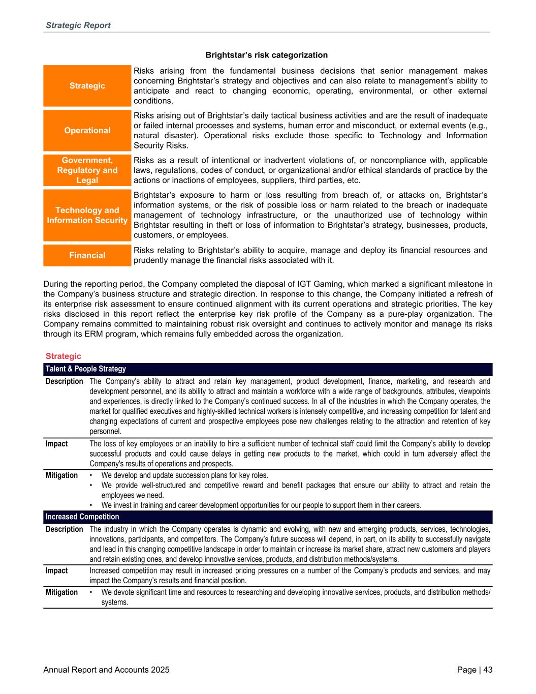 Brightstar’s risk categorization Strategic Risks arising from the fundamental business decisions that senior management makes concerning Brightstar’s strategy and objectives and can also relate to management’s ability to anticipate and react to changing economic, operating, environmental, or other external conditions. Operational Risks arising out of Brightstar’s daily tactical business activities and are the result of inadequate or failed internal processes and systems, human error and misconduct, or external events (e.g., natural disaster). Operational risks exclude those specific to Technology and Information Security Risks. Government, Regulatory and Legal Risks as a result of intentional or inadvertent violations of, or noncompliance with, applicable laws, regulations, codes of conduct, or organizational and/or ethical standards of practice by the actions or inactions of employees, suppliers, third parties, etc. Technology and Information Security Brightstar’s exposure to harm or loss resulting from breach of, or attacks on, Brightstar’s information systems, or the risk of possible loss or harm related to the breach or inadequate management of technology infrastructure, or the unauthorized use of technology within Brightstar resulting in theft or loss of information to Brightstar’s strategy, businesses, products, customers, or employees. Financial Risks relating to Brightstar’s ability to acquire, manage and deploy its financial resources and prudently manage the financial risks associated with it. During the reporting period, the Company completed the disposal of IGT Gaming, which marked a significant milestone in the Company’s business structure and strategic direction. In response to this change, the Company initiated a refresh of its enterprise risk assessment to ensure continued alignment with its current operations and strategic priorities. The key risks disclosed in this report reflect the enterprise key risk profile of the Company as a pure-play organization. The Company remains committed to maintaining robust risk oversight and continues to actively monitor and manage its risks through its ERM program, which remains fully embedded across the organization. Strategic Talent & People Strategy Description The Company’s ability to attract and retain key management, product development, finance, marketing, and research and development personnel, and its ability to attract and maintain a workforce with a wide range of backgrounds, attributes, viewpoints and experiences, is directly linked to the Company’s continued success. In all of the industries in which the Company operates, the market for qualified executives and highly-skilled technical workers is intensely competitive, and increasing competition for talent and changing expectations of current and prospective employees pose new challenges relating to the attraction and retention of key personnel. Impact The loss of key employees or an inability to hire a sufficient number of technical staff could limit the Company’s ability to develop successful products and could cause delays in getting new products to the market, which could in turn adversely affect the Company's results of operations and prospects. Mitigation • We develop and update succession plans for key roles. • We provide well-structured and competitive reward and benefit packages that ensure our ability to attract and retain the employees we need. • We invest in training and career development opportunities for our people to support them in their careers. Increased Competition Description The industry in which the Company operates is dynamic and evolving, with new and emerging products, services, technologies, innovations, participants, and competitors. The Company’s future success will depend, in part, on its ability to successfully navigate and lead in this changing competitive landscape in order to maintain or increase its market share, attract new customers and players and retain existing ones, and develop innovative services, products, and distribution methods/systems. Impact Increased competition may result in increased pricing pressures on a number of the Company’s products and services, and may impact the Company’s results and financial position. Mitigation • We devote significant time and resources to researching and developing innovative services, products, and distribution methods/ systems. Strategic Report Annual Report and Accounts 2025 Page | 43