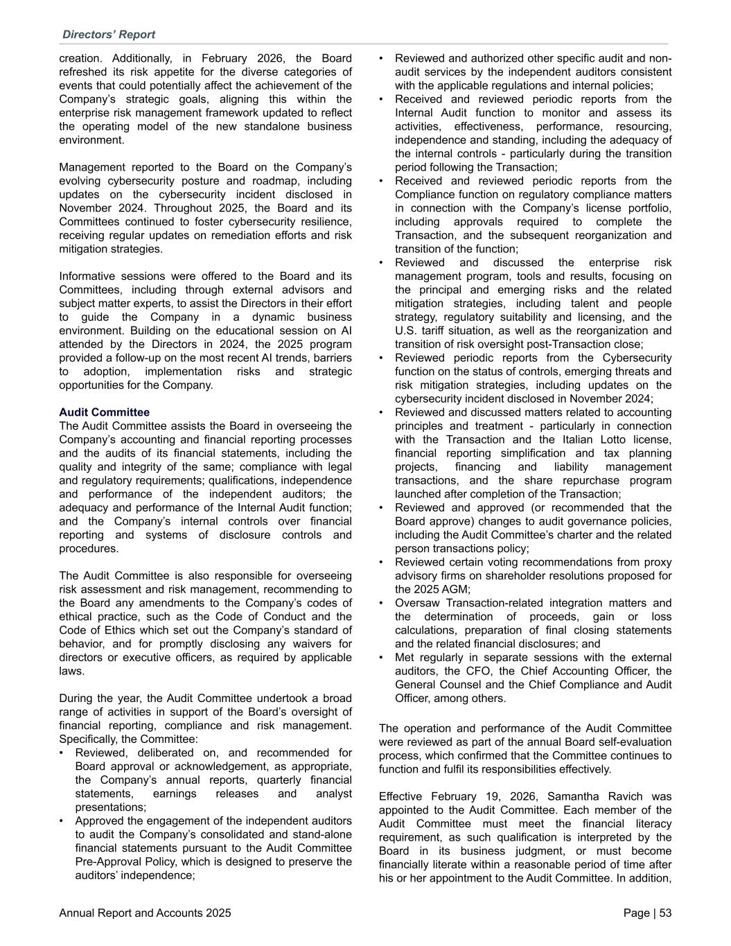 creation. Additionally, in February 2026, the Board refreshed its risk appetite for the diverse categories of events that could potentially affect the achievement of the Company’s strategic goals, aligning this within the enterprise risk management framework updated to reflect the operating model of the new standalone business environment. Management reported to the Board on the Company’s evolving cybersecurity posture and roadmap, including updates on the cybersecurity incident disclosed in November 2024. Throughout 2025, the Board and its Committees continued to foster cybersecurity resilience, receiving regular updates on remediation efforts and risk mitigation strategies. Informative sessions were offered to the Board and its Committees, including through external advisors and subject matter experts, to assist the Directors in their effort to guide the Company in a dynamic business environment. Building on the educational session on AI attended by the Directors in 2024, the 2025 program provided a follow-up on the most recent AI trends, barriers to adoption, implementation risks and strategic opportunities for the Company. Audit Committee The Audit Committee assists the Board in overseeing the Company’s accounting and financial reporting processes and the audits of its financial statements, including the quality and integrity of the same; compliance with legal and regulatory requirements; qualifications, independence and performance of the independent auditors; the adequacy and performance of the Internal Audit function; and the Company’s internal controls over financial reporting and systems of disclosure controls and procedures. The Audit Committee is also responsible for overseeing risk assessment and risk management, recommending to the Board any amendments to the Company’s codes of ethical practice, such as the Code of Conduct and the Code of Ethics which set out the Company’s standard of behavior, and for promptly disclosing any waivers for directors or executive officers, as required by applicable laws. During the year, the Audit Committee undertook a broad range of activities in support of the Board’s oversight of financial reporting, compliance and risk management. Specifically, the Committee: • Reviewed, deliberated on, and recommended for Board approval or acknowledgement, as appropriate, the Company’s annual reports, quarterly financial statements, earnings releases and analyst presentations; • Approved the engagement of the independent auditors to audit the Company’s consolidated and stand-alone financial statements pursuant to the Audit Committee Pre-Approval Policy, which is designed to preserve the auditors’ independence; • Reviewed and authorized other specific audit and non- audit services by the independent auditors consistent with the applicable regulations and internal policies; • Received and reviewed periodic reports from the Internal Audit function to monitor and assess its activities, effectiveness, performance, resourcing, independence and standing, including the adequacy of the internal controls - particularly during the transition period following the Transaction; • Received and reviewed periodic reports from the Compliance function on regulatory compliance matters in connection with the Company’s license portfolio, including approvals required to complete the Transaction, and the subsequent reorganization and transition of the function; • Reviewed and discussed the enterprise risk management program, tools and results, focusing on the principal and emerging risks and the related mitigation strategies, including talent and people strategy, regulatory suitability and licensing, and the U.S. tariff situation, as well as the reorganization and transition of risk oversight post-Transaction close; • Reviewed periodic reports from the Cybersecurity function on the status of controls, emerging threats and risk mitigation strategies, including updates on the cybersecurity incident disclosed in November 2024; • Reviewed and discussed matters related to accounting principles and treatment - particularly in connection with the Transaction and the Italian Lotto license, financial reporting simplification and tax planning projects, financing and liability management transactions, and the share repurchase program launched after completion of the Transaction; • Reviewed and approved (or recommended that the Board approve) changes to audit governance policies, including the Audit Committee’s charter and the related person transactions policy; • Reviewed certain voting recommendations from proxy advisory firms on shareholder resolutions proposed for the 2025 AGM; • Oversaw Transaction-related integration matters and the determination of proceeds, gain or loss calculations, preparation of final closing statements and the related financial disclosures; and • Met regularly in separate sessions with the external auditors, the CFO, the Chief Accounting Officer, the General Counsel and the Chief Compliance and Audit Officer, among others. The operation and performance of the Audit Committee were reviewed as part of the annual Board self-evaluation process, which confirmed that the Committee continues to function and fulfil its responsibilities effectively. Effective February 19, 2026, Samantha Ravich was appointed to the Audit Committee. Each member of the Audit Committee must meet the financial literacy requirement, as such qualification is interpreted by the Board in its business judgment, or must become financially literate within a reasonable period of time after his or her appointment to the Audit Committee. In addition, Directors’ Report Annual Report and Accounts 2025 Page | 53