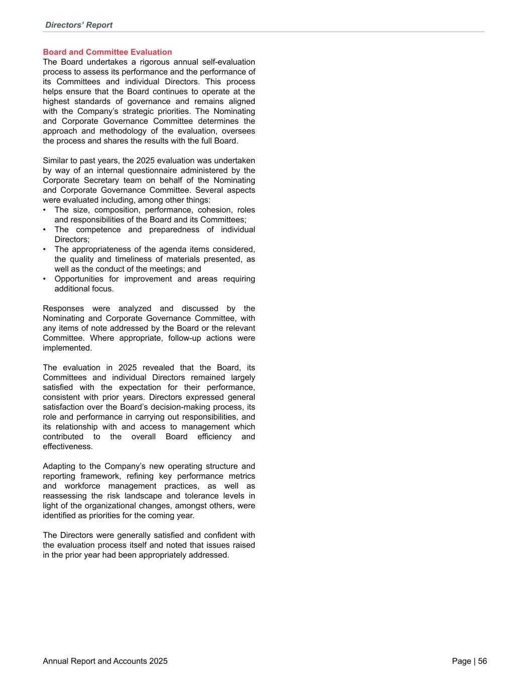 Board and Committee Evaluation The Board undertakes a rigorous annual self-evaluation process to assess its performance and the performance of its Committees and individual Directors. This process helps ensure that the Board continues to operate at the highest standards of governance and remains aligned with the Company’s strategic priorities. The Nominating and Corporate Governance Committee determines the approach and methodology of the evaluation, oversees the process and shares the results with the full Board. Similar to past years, the 2025 evaluation was undertaken by way of an internal questionnaire administered by the Corporate Secretary team on behalf of the Nominating and Corporate Governance Committee. Several aspects were evaluated including, among other things: • The size, composition, performance, cohesion, roles and responsibilities of the Board and its Committees; • The competence and preparedness of individual Directors; • The appropriateness of the agenda items considered, the quality and timeliness of materials presented, as well as the conduct of the meetings; and • Opportunities for improvement and areas requiring additional focus. Responses were analyzed and discussed by the Nominating and Corporate Governance Committee, with any items of note addressed by the Board or the relevant Committee. Where appropriate, follow-up actions were implemented. The evaluation in 2025 revealed that the Board, its Committees and individual Directors remained largely satisfied with the expectation for their performance, consistent with prior years. Directors expressed general satisfaction over the Board’s decision-making process, its role and performance in carrying out responsibilities, and its relationship with and access to management which contributed to the overall Board efficiency and effectiveness. Adapting to the Company’s new operating structure and reporting framework, refining key performance metrics and workforce management practices, as well as reassessing the risk landscape and tolerance levels in light of the organizational changes, amongst others, were identified as priorities for the coming year. The Directors were generally satisfied and confident with the evaluation process itself and noted that issues raised in the prior year had been appropriately addressed. Directors’ Report Annual Report and Accounts 2025 Page | 56