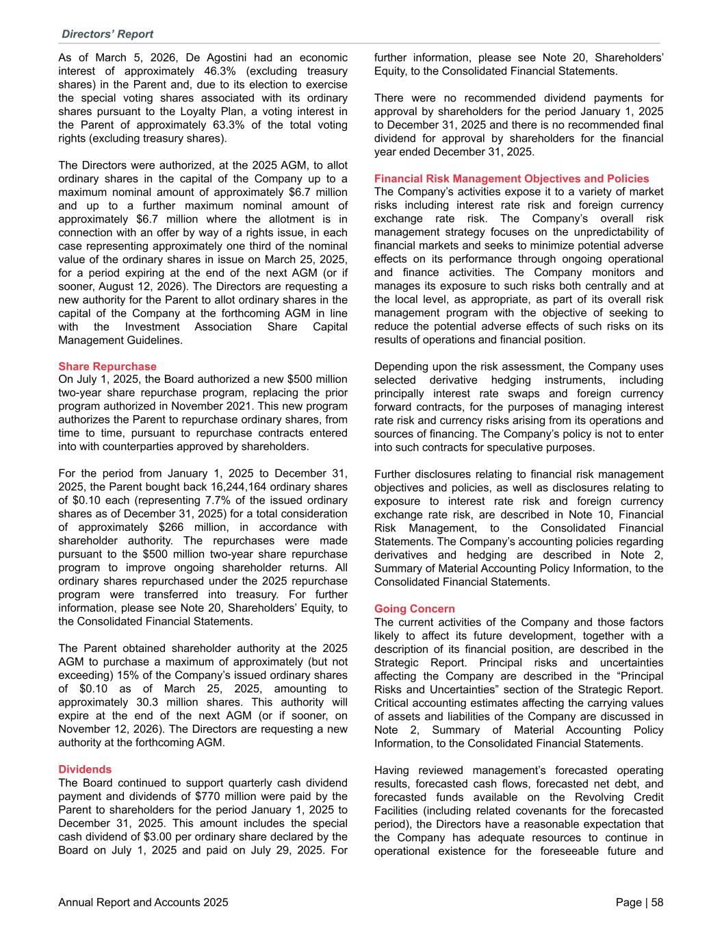 As of March 5, 2026, De Agostini had an economic interest of approximately 46.3% (excluding treasury shares) in the Parent and, due to its election to exercise the special voting shares associated with its ordinary shares pursuant to the Loyalty Plan, a voting interest in the Parent of approximately 63.3% of the total voting rights (excluding treasury shares). The Directors were authorized, at the 2025 AGM, to allot ordinary shares in the capital of the Company up to a maximum nominal amount of approximately $6.7 million and up to a further maximum nominal amount of approximately $6.7 million where the allotment is in connection with an offer by way of a rights issue, in each case representing approximately one third of the nominal value of the ordinary shares in issue on March 25, 2025, for a period expiring at the end of the next AGM (or if sooner, August 12, 2026). The Directors are requesting a new authority for the Parent to allot ordinary shares in the capital of the Company at the forthcoming AGM in line with the Investment Association Share Capital Management Guidelines. Share Repurchase On July 1, 2025, the Board authorized a new $500 million two-year share repurchase program, replacing the prior program authorized in November 2021. This new program authorizes the Parent to repurchase ordinary shares, from time to time, pursuant to repurchase contracts entered into with counterparties approved by shareholders. For the period from January 1, 2025 to December 31, 2025, the Parent bought back 16,244,164 ordinary shares of $0.10 each (representing 7.7% of the issued ordinary shares as of December 31, 2025) for a total consideration of approximately $266 million, in accordance with shareholder authority. The repurchases were made pursuant to the $500 million two-year share repurchase program to improve ongoing shareholder returns. All ordinary shares repurchased under the 2025 repurchase program were transferred into treasury. For further information, please see Note 20, Shareholders’ Equity, to the Consolidated Financial Statements. The Parent obtained shareholder authority at the 2025 AGM to purchase a maximum of approximately (but not exceeding) 15% of the Company’s issued ordinary shares of $0.10 as of March 25, 2025, amounting to approximately 30.3 million shares. This authority will expire at the end of the next AGM (or if sooner, on November 12, 2026). The Directors are requesting a new authority at the forthcoming AGM. Dividends The Board continued to support quarterly cash dividend payment and dividends of $770 million were paid by the Parent to shareholders for the period January 1, 2025 to December 31, 2025. This amount includes the special cash dividend of $3.00 per ordinary share declared by the Board on July 1, 2025 and paid on July 29, 2025. For further information, please see Note 20, Shareholders’ Equity, to the Consolidated Financial Statements. There were no recommended dividend payments for approval by shareholders for the period January 1, 2025 to December 31, 2025 and there is no recommended final dividend for approval by shareholders for the financial year ended December 31, 2025. Financial Risk Management Objectives and Policies The Company’s activities expose it to a variety of market risks including interest rate risk and foreign currency exchange rate risk. The Company’s overall risk management strategy focuses on the unpredictability of financial markets and seeks to minimize potential adverse effects on its performance through ongoing operational and finance activities. The Company monitors and manages its exposure to such risks both centrally and at the local level, as appropriate, as part of its overall risk management program with the objective of seeking to reduce the potential adverse effects of such risks on its results of operations and financial position. Depending upon the risk assessment, the Company uses selected derivative hedging instruments, including principally interest rate swaps and foreign currency forward contracts, for the purposes of managing interest rate risk and currency risks arising from its operations and sources of financing. The Company’s policy is not to enter into such contracts for speculative purposes. Further disclosures relating to financial risk management objectives and policies, as well as disclosures relating to exposure to interest rate risk and foreign currency exchange rate risk, are described in Note 10, Financial Risk Management, to the Consolidated Financial Statements. The Company’s accounting policies regarding derivatives and hedging are described in Note 2, Summary of Material Accounting Policy Information, to the Consolidated Financial Statements. Going Concern The current activities of the Company and those factors likely to affect its future development, together with a description of its financial position, are described in the Strategic Report. Principal risks and uncertainties affecting the Company are described in the “Principal Risks and Uncertainties” section of the Strategic Report. Critical accounting estimates affecting the carrying values of assets and liabilities of the Company are discussed in Note 2, Summary of Material Accounting Policy Information, to the Consolidated Financial Statements. Having reviewed management’s forecasted operating results, forecasted cash flows, forecasted net debt, and forecasted funds available on the Revolving Credit Facilities (including related covenants for the forecasted period), the Directors have a reasonable expectation that the Company has adequate resources to continue in operational existence for the foreseeable future and Directors’ Report Annual Report and Accounts 2025 Page | 58