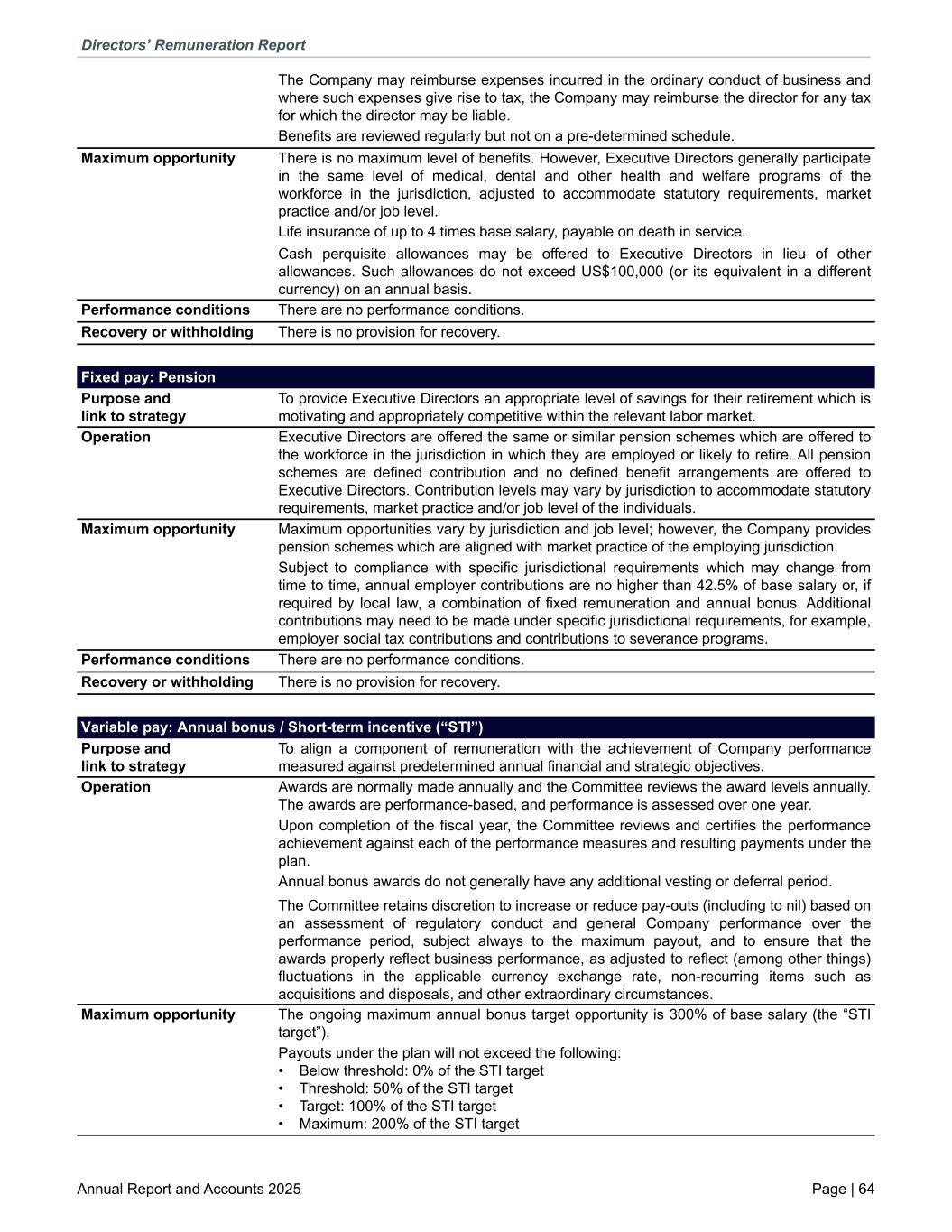 The Company may reimburse expenses incurred in the ordinary conduct of business and where such expenses give rise to tax, the Company may reimburse the director for any tax for which the director may be liable. Benefits are reviewed regularly but not on a pre-determined schedule. Maximum opportunity There is no maximum level of benefits. However, Executive Directors generally participate in the same level of medical, dental and other health and welfare programs of the workforce in the jurisdiction, adjusted to accommodate statutory requirements, market practice and/or job level. Life insurance of up to 4 times base salary, payable on death in service. Cash perquisite allowances may be offered to Executive Directors in lieu of other allowances. Such allowances do not exceed US$100,000 (or its equivalent in a different currency) on an annual basis. Performance conditions There are no performance conditions. Recovery or withholding There is no provision for recovery. Fixed pay: Pension Purpose and link to strategy To provide Executive Directors an appropriate level of savings for their retirement which is motivating and appropriately competitive within the relevant labor market. Operation Executive Directors are offered the same or similar pension schemes which are offered to the workforce in the jurisdiction in which they are employed or likely to retire. All pension schemes are defined contribution and no defined benefit arrangements are offered to Executive Directors. Contribution levels may vary by jurisdiction to accommodate statutory requirements, market practice and/or job level of the individuals. Maximum opportunity Maximum opportunities vary by jurisdiction and job level; however, the Company provides pension schemes which are aligned with market practice of the employing jurisdiction. Subject to compliance with specific jurisdictional requirements which may change from time to time, annual employer contributions are no higher than 42.5% of base salary or, if required by local law, a combination of fixed remuneration and annual bonus. Additional contributions may need to be made under specific jurisdictional requirements, for example, employer social tax contributions and contributions to severance programs. Performance conditions There are no performance conditions. Recovery or withholding There is no provision for recovery. Variable pay: Annual bonus / Short-term incentive (“STI”) Purpose and link to strategy To align a component of remuneration with the achievement of Company performance measured against predetermined annual financial and strategic objectives. Operation Awards are normally made annually and the Committee reviews the award levels annually. The awards are performance-based, and performance is assessed over one year. Upon completion of the fiscal year, the Committee reviews and certifies the performance achievement against each of the performance measures and resulting payments under the plan. Annual bonus awards do not generally have any additional vesting or deferral period. The Committee retains discretion to increase or reduce pay-outs (including to nil) based on an assessment of regulatory conduct and general Company performance over the performance period, subject always to the maximum payout, and to ensure that the awards properly reflect business performance, as adjusted to reflect (among other things) fluctuations in the applicable currency exchange rate, non-recurring items such as acquisitions and disposals, and other extraordinary circumstances. Maximum opportunity The ongoing maximum annual bonus target opportunity is 300% of base salary (the “STI target”). Payouts under the plan will not exceed the following: • Below threshold: 0% of the STI target • Threshold: 50% of the STI target • Target: 100% of the STI target • Maximum: 200% of the STI target Directors’ Remuneration Report Annual Report and Accounts 2025 Page | 64