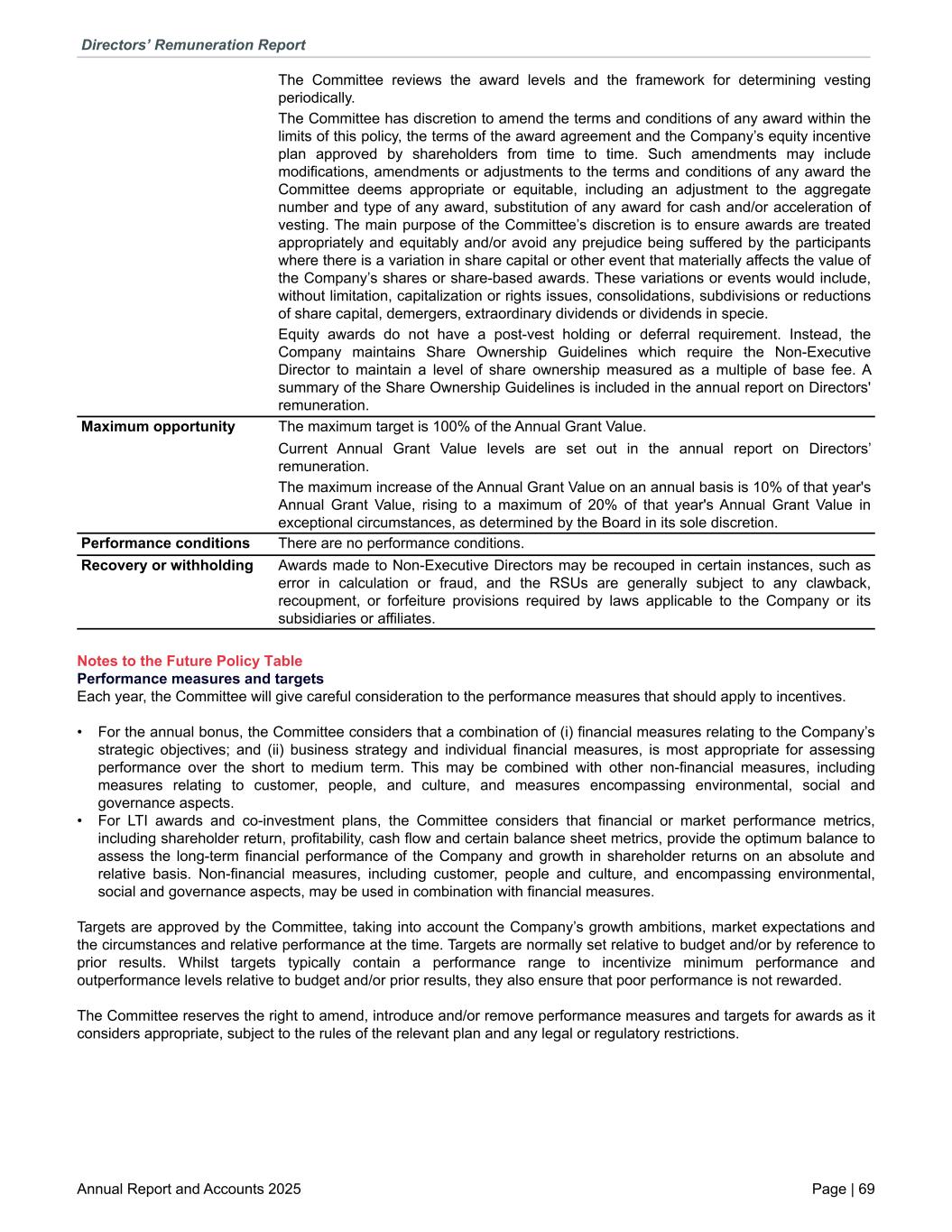 The Committee reviews the award levels and the framework for determining vesting periodically. The Committee has discretion to amend the terms and conditions of any award within the limits of this policy, the terms of the award agreement and the Company’s equity incentive plan approved by shareholders from time to time. Such amendments may include modifications, amendments or adjustments to the terms and conditions of any award the Committee deems appropriate or equitable, including an adjustment to the aggregate number and type of any award, substitution of any award for cash and/or acceleration of vesting. The main purpose of the Committee’s discretion is to ensure awards are treated appropriately and equitably and/or avoid any prejudice being suffered by the participants where there is a variation in share capital or other event that materially affects the value of the Company’s shares or share-based awards. These variations or events would include, without limitation, capitalization or rights issues, consolidations, subdivisions or reductions of share capital, demergers, extraordinary dividends or dividends in specie. Equity awards do not have a post-vest holding or deferral requirement. Instead, the Company maintains Share Ownership Guidelines which require the Non-Executive Director to maintain a level of share ownership measured as a multiple of base fee. A summary of the Share Ownership Guidelines is included in the annual report on Directors' remuneration. Maximum opportunity The maximum target is 100% of the Annual Grant Value. Current Annual Grant Value levels are set out in the annual report on Directors’ remuneration. The maximum increase of the Annual Grant Value on an annual basis is 10% of that year's Annual Grant Value, rising to a maximum of 20% of that year's Annual Grant Value in exceptional circumstances, as determined by the Board in its sole discretion. Performance conditions There are no performance conditions. Recovery or withholding Awards made to Non-Executive Directors may be recouped in certain instances, such as error in calculation or fraud, and the RSUs are generally subject to any clawback, recoupment, or forfeiture provisions required by laws applicable to the Company or its subsidiaries or affiliates. Notes to the Future Policy Table Performance measures and targets Each year, the Committee will give careful consideration to the performance measures that should apply to incentives. • For the annual bonus, the Committee considers that a combination of (i) financial measures relating to the Company’s strategic objectives; and (ii) business strategy and individual financial measures, is most appropriate for assessing performance over the short to medium term. This may be combined with other non-financial measures, including measures relating to customer, people, and culture, and measures encompassing environmental, social and governance aspects. • For LTI awards and co-investment plans, the Committee considers that financial or market performance metrics, including shareholder return, profitability, cash flow and certain balance sheet metrics, provide the optimum balance to assess the long-term financial performance of the Company and growth in shareholder returns on an absolute and relative basis. Non-financial measures, including customer, people and culture, and encompassing environmental, social and governance aspects, may be used in combination with financial measures. Targets are approved by the Committee, taking into account the Company’s growth ambitions, market expectations and the circumstances and relative performance at the time. Targets are normally set relative to budget and/or by reference to prior results. Whilst targets typically contain a performance range to incentivize minimum performance and outperformance levels relative to budget and/or prior results, they also ensure that poor performance is not rewarded. The Committee reserves the right to amend, introduce and/or remove performance measures and targets for awards as it considers appropriate, subject to the rules of the relevant plan and any legal or regulatory restrictions. Directors’ Remuneration Report Annual Report and Accounts 2025 Page | 69
