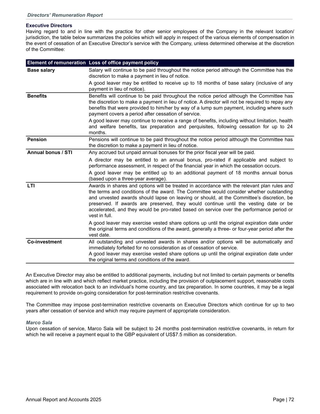 Executive Directors Having regard to and in line with the practice for other senior employees of the Company in the relevant location/ jurisdiction, the table below summarizes the policies which will apply in respect of the various elements of compensation in the event of cessation of an Executive Director’s service with the Company, unless determined otherwise at the discretion of the Committee: Base salary Salary will continue to be paid throughout the notice period although the Committee has the discretion to make a payment in lieu of notice. A good leaver may be entitled to receive up to 18 months of base salary (inclusive of any payment in lieu of notice). Benefits Benefits will continue to be paid throughout the notice period although the Committee has the discretion to make a payment in lieu of notice. A director will not be required to repay any benefits that were provided to him/her by way of a lump sum payment, including where such payment covers a period after cessation of service. A good leaver may continue to receive a range of benefits, including without limitation, health and welfare benefits, tax preparation and perquisites, following cessation for up to 24 months. Pension Pensions will continue to be paid throughout the notice period although the Committee has the discretion to make a payment in lieu of notice. Annual bonus / STI Any accrued but unpaid annual bonuses for the prior fiscal year will be paid. A director may be entitled to an annual bonus, pro-rated if applicable and subject to performance assessment, in respect of the financial year in which the cessation occurs. A good leaver may be entitled up to an additional payment of 18 months annual bonus (based upon a three-year average). LTI Awards in shares and options will be treated in accordance with the relevant plan rules and the terms and conditions of the award. The Committee would consider whether outstanding and unvested awards should lapse on leaving or should, at the Committee’s discretion, be preserved. If awards are preserved, they would continue until the vesting date or be accelerated, and they would be pro-rated based on service over the performance period or vest in full. A good leaver may exercise vested share options up until the original expiration date under the original terms and conditions of the award, generally a three- or four-year period after the vest date. Co-investment All outstanding and unvested awards in shares and/or options will be automatically and immediately forfeited for no consideration as of cessation of service. A good leaver may exercise vested share options up until the original expiration date under the original terms and conditions of the award. Element of remuneration Loss of office payment policy An Executive Director may also be entitled to additional payments, including but not limited to certain payments or benefits which are in line with and which reflect market practice, including the provision of outplacement support, reasonable costs associated with relocation back to an individual’s home country, and tax preparation. In some countries, it may be a legal requirement to provide on-going consideration for post-termination restrictive covenants. The Committee may impose post-termination restrictive covenants on Executive Directors which continue for up to two years after cessation of service and which may require payment of appropriate consideration. Marco Sala Upon cessation of service, Marco Sala will be subject to 24 months post-termination restrictive covenants, in return for which he will receive a payment equal to the GBP equivalent of US$7.5 million as consideration. Directors’ Remuneration Report Annual Report and Accounts 2025 Page | 72
