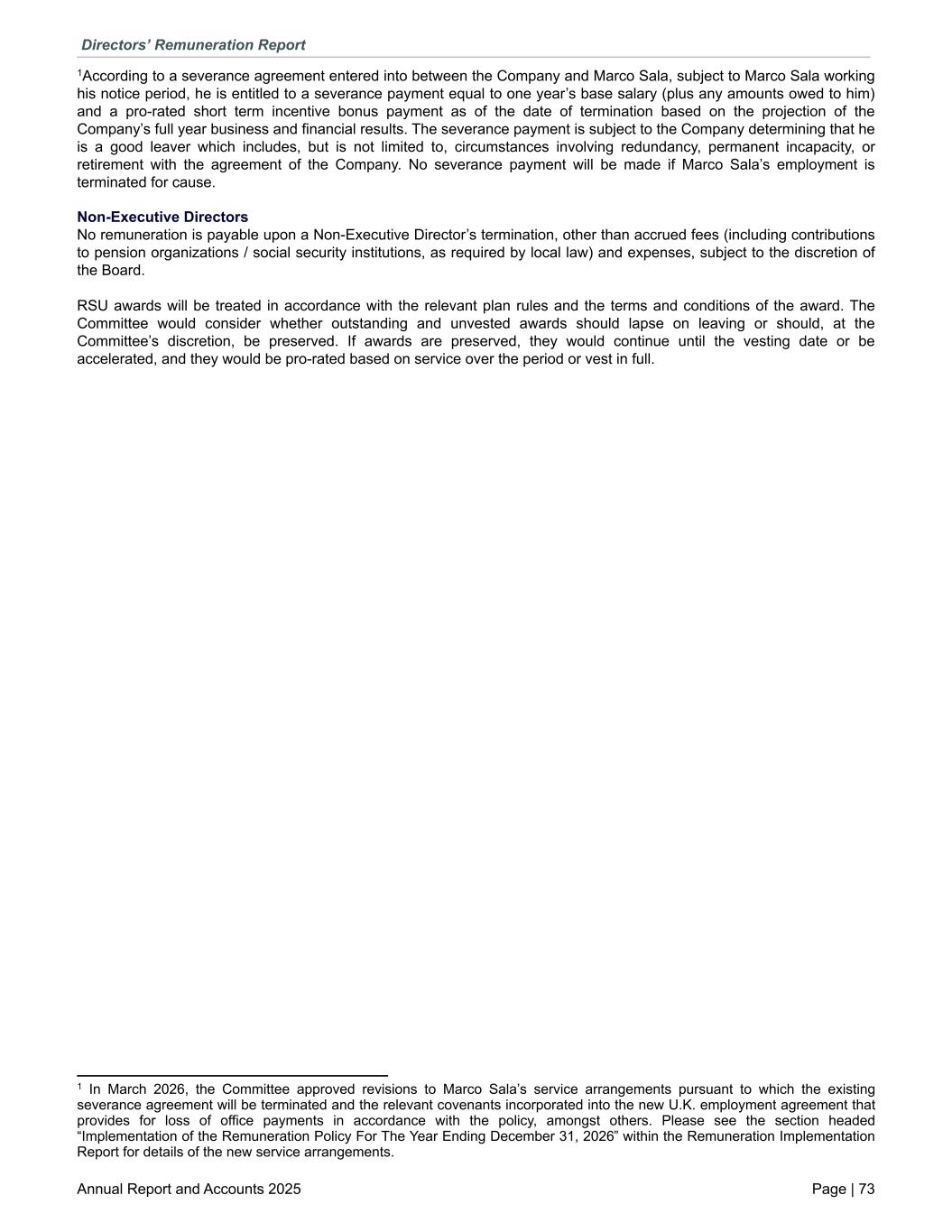 1According to a severance agreement entered into between the Company and Marco Sala, subject to Marco Sala working his notice period, he is entitled to a severance payment equal to one year’s base salary (plus any amounts owed to him) and a pro-rated short term incentive bonus payment as of the date of termination based on the projection of the Company’s full year business and financial results. The severance payment is subject to the Company determining that he is a good leaver which includes, but is not limited to, circumstances involving redundancy, permanent incapacity, or retirement with the agreement of the Company. No severance payment will be made if Marco Sala’s employment is terminated for cause. Non-Executive Directors No remuneration is payable upon a Non-Executive Director’s termination, other than accrued fees (including contributions to pension organizations / social security institutions, as required by local law) and expenses, subject to the discretion of the Board. RSU awards will be treated in accordance with the relevant plan rules and the terms and conditions of the award. The Committee would consider whether outstanding and unvested awards should lapse on leaving or should, at the Committee’s discretion, be preserved. If awards are preserved, they would continue until the vesting date or be accelerated, and they would be pro-rated based on service over the period or vest in full. Directors’ Remuneration Report Annual Report and Accounts 2025 Page | 73 1 In March 2026, the Committee approved revisions to Marco Sala’s service arrangements pursuant to which the existing severance agreement will be terminated and the relevant covenants incorporated into the new U.K. employment agreement that provides for loss of office payments in accordance with the policy, amongst others. Please see the section headed “Implementation of the Remuneration Policy For The Year Ending December 31, 2026” within the Remuneration Implementation Report for details of the new service arrangements.