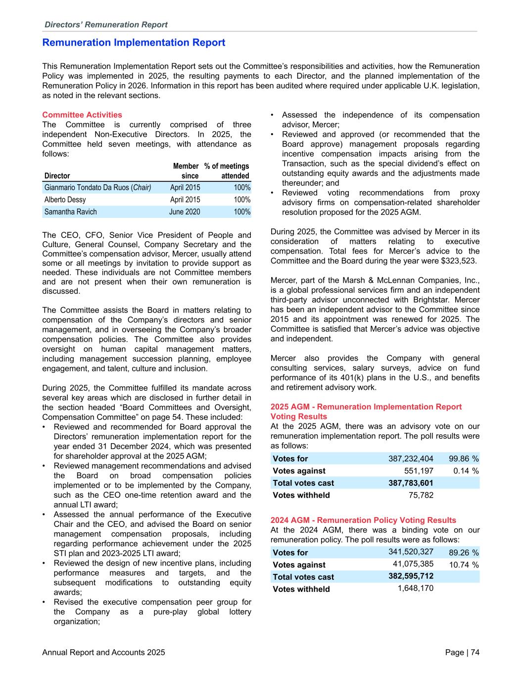 Remuneration Implementation Report This Remuneration Implementation Report sets out the Committee’s responsibilities and activities, how the Remuneration Policy was implemented in 2025, the resulting payments to each Director, and the planned implementation of the Remuneration Policy in 2026. Information in this report has been audited where required under applicable U.K. legislation, as noted in the relevant sections. Committee Activities The Committee is currently comprised of three independent Non-Executive Directors. In 2025, the Committee held seven meetings, with attendance as follows: Gianmario Tondato Da Ruos (Chair) April 2015 100 % Alberto Dessy April 2015 100 % Samantha Ravich June 2020 100 % Director Member since % of meetings attended The CEO, CFO, Senior Vice President of People and Culture, General Counsel, Company Secretary and the Committee’s compensation advisor, Mercer, usually attend some or all meetings by invitation to provide support as needed. These individuals are not Committee members and are not present when their own remuneration is discussed. The Committee assists the Board in matters relating to compensation of the Company’s directors and senior management, and in overseeing the Company’s broader compensation policies. The Committee also provides oversight on human capital management matters, including management succession planning, employee engagement, and talent, culture and inclusion. During 2025, the Committee fulfilled its mandate across several key areas which are disclosed in further detail in the section headed “Board Committees and Oversight, Compensation Committee” on page 54. These included: • Reviewed and recommended for Board approval the Directors’ remuneration implementation report for the year ended 31 December 2024, which was presented for shareholder approval at the 2025 AGM; • Reviewed management recommendations and advised the Board on broad compensation policies implemented or to be implemented by the Company, such as the CEO one-time retention award and the annual LTI award; • Assessed the annual performance of the Executive Chair and the CEO, and advised the Board on senior management compensation proposals, including regarding performance achievement under the 2025 STI plan and 2023-2025 LTI award; • Reviewed the design of new incentive plans, including performance measures and targets, and the subsequent modifications to outstanding equity awards; • Revised the executive compensation peer group for the Company as a pure-play global lottery organization; • Assessed the independence of its compensation advisor, Mercer; • Reviewed and approved (or recommended that the Board approve) management proposals regarding incentive compensation impacts arising from the Transaction, such as the special dividend’s effect on outstanding equity awards and the adjustments made thereunder; and • Reviewed voting recommendations from proxy advisory firms on compensation-related shareholder resolution proposed for the 2025 AGM. During 2025, the Committee was advised by Mercer in its consideration of matters relating to executive compensation. Total fees for Mercer’s advice to the Committee and the Board during the year were $323,523. Mercer, part of the Marsh & McLennan Companies, Inc., is a global professional services firm and an independent third-party advisor unconnected with Brightstar. Mercer has been an independent advisor to the Committee since 2015 and its appointment was renewed for 2025. The Committee is satisfied that Mercer’s advice was objective and independent. Mercer also provides the Company with general consulting services, salary surveys, advice on fund performance of its 401(k) plans in the U.S., and benefits and retirement advisory work. 2025 AGM - Remuneration Implementation Report Voting Results At the 2025 AGM, there was an advisory vote on our remuneration implementation report. The poll results were as follows: Votes for 387,232,404 99.86 % Votes against 551,197 0.14 % Total votes cast 387,783,601 Votes withheld 75,782 2024 AGM - Remuneration Policy Voting Results At the 2024 AGM, there was a binding vote on our remuneration policy. The poll results were as follows: Votes for 341,520,327 89.26 % Votes against 41,075,385 10.74 % Total votes cast 382,595,712 Votes withheld 1,648,170 Directors’ Remuneration Report Annual Report and Accounts 2025 Page | 74