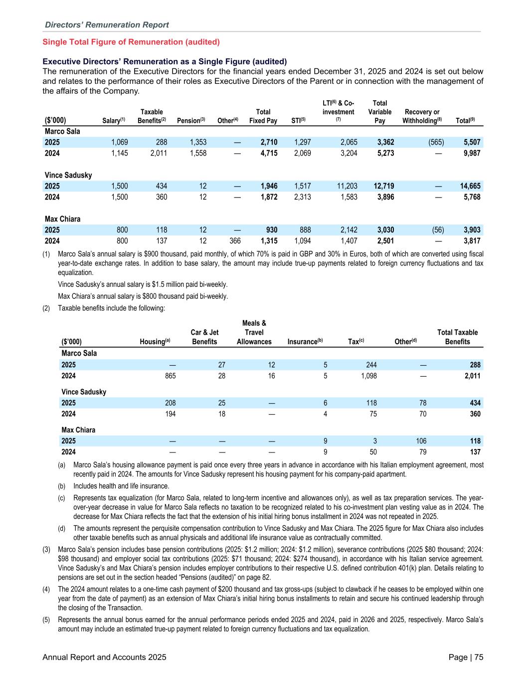 Single Total Figure of Remuneration (audited) Executive Directors’ Remuneration as a Single Figure (audited) The remuneration of the Executive Directors for the financial years ended December 31, 2025 and 2024 is set out below and relates to the performance of their roles as Executive Directors of the Parent or in connection with the management of the affairs of the Company. ($’000) Salary(1) Taxable Benefits(2) Pension(3) Other(4) Total Fixed Pay STI(5) LTI(6) & Co- investment (7) Total Variable Pay Recovery or Withholding(8) Total(9) Marco Sala 2025 1,069 288 1,353 — 2,710 1,297 2,065 3,362 (565) 5,507 2024 1,145 2,011 1,558 — 4,715 2,069 3,204 5,273 — 9,987 Vince Sadusky 2025 1,500 434 12 — 1,946 1,517 11,203 12,719 — 14,665 2024 1,500 360 12 — 1,872 2,313 1,583 3,896 — 5,768 Max Chiara 2025 800 118 12 — 930 888 2,142 3,030 (56) 3,903 2024 800 137 12 366 1,315 1,094 1,407 2,501 — 3,817 (1) Marco Sala’s annual salary is $900 thousand, paid monthly, of which 70% is paid in GBP and 30% in Euros, both of which are converted using fiscal year-to-date exchange rates. In addition to base salary, the amount may include true-up payments related to foreign currency fluctuations and tax equalization. Vince Sadusky’s annual salary is $1.5 million paid bi-weekly. Max Chiara’s annual salary is $800 thousand paid bi-weekly. (2) Taxable benefits include the following: ($’000) Housing(a) Car & Jet Benefits Meals & Travel Allowances Insurance(b) Tax(c) Other(d) Total Taxable Benefits Marco Sala 2025 — 27 12 5 244 — 288 2024 865 28 16 5 1,098 — 2,011 Vince Sadusky 2025 208 25 — 6 118 78 434 2024 194 18 — 4 75 70 360 Max Chiara 2025 — — — 9 3 106 118 2024 — — — 9 50 79 137 (a) Marco Sala’s housing allowance payment is paid once every three years in advance in accordance with his Italian employment agreement, most recently paid in 2024. The amounts for Vince Sadusky represent his housing payment for his company-paid apartment. (b) Includes health and life insurance. (c) Represents tax equalization (for Marco Sala, related to long-term incentive and allowances only), as well as tax preparation services. The year- over-year decrease in value for Marco Sala reflects no taxation to be recognized related to his co-investment plan vesting value as in 2024. The decrease for Max Chiara reflects the fact that the extension of his initial hiring bonus installment in 2024 was not repeated in 2025. (d) The amounts represent the perquisite compensation contribution to Vince Sadusky and Max Chiara. The 2025 figure for Max Chiara also includes other taxable benefits such as annual physicals and additional life insurance value as contractually committed. (3) Marco Sala’s pension includes base pension contributions (2025: $1.2 million; 2024: $1.2 million), severance contributions (2025 $80 thousand; 2024: $98 thousand) and employer social tax contributions (2025: $71 thousand; 2024: $274 thousand), in accordance with his Italian service agreement. Vince Sadusky’s and Max Chiara’s pension includes employer contributions to their respective U.S. defined contribution 401(k) plan. Details relating to pensions are set out in the section headed “Pensions (audited)” on page 82. (4) The 2024 amount relates to a one-time cash payment of $200 thousand and tax gross-ups (subject to clawback if he ceases to be employed within one year from the date of payment) as an extension of Max Chiara’s initial hiring bonus installments to retain and secure his continued leadership through the closing of the Transaction. (5) Represents the annual bonus earned for the annual performance periods ended 2025 and 2024, paid in 2026 and 2025, respectively. Marco Sala’s amount may include an estimated true-up payment related to foreign currency fluctuations and tax equalization. Directors’ Remuneration Report Annual Report and Accounts 2025 Page | 75