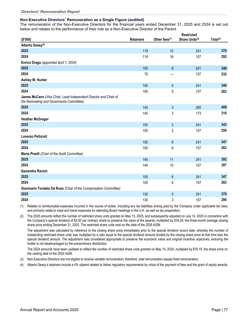 Non-Executive Directors’ Remuneration as a Single Figure (audited) The remuneration of the Non-Executive Directors for the financial years ended December 31, 2025 and 2024 is set out below and relates to the performance of their role as a Non-Executive Director of the Parent. Alberto Dessy(4) 2025 119 10 241 370 2024 119 16 157 292 Enrico Drago (appointed April 1, 2024) 2025 100 8 241 349 2024 75 — 157 232 Ashley M. Hunter 2025 100 5 241 346 2024 100 5 157 263 James McCann (Vice Chair, Lead Independent Director and Chair of the Nominating and Governance Committee) 2025 140 3 265 408 2024 140 3 173 316 Heather McGregor 2025 100 2 241 343 2024 100 2 157 259 Lorenzo Pellicioli 2025 100 6 241 347 2024 100 6 157 263 Maria Pinelli (Chair of the Audit Committee) 2025 140 11 241 392 2024 140 10 157 307 Samantha Ravich 2025 100 6 241 347 2024 100 6 157 263 Gianmario Tondato Da Ruos (Chair of the Compensation Committee) 2025 130 5 241 376 2024 130 3 157 290 ($’000) Retainers Other fees(1) Restricted Share Units(2) Total(3) (1) Relates to reimbursable expenses incurred in the course of duties, including any tax liabilities arising paid by the Company under applicable tax laws, and primarily relate to meal and travel expenses for attending Board meetings in the U.K. as well as tax preparation. (2) The 2025 amounts reflect the number of restricted share units granted on May 13, 2025, and subsequently adjusted on July 14, 2025 in connection with the Company’s special dividend of $3.00 per ordinary share to preserve the value of the awards, multiplied by $16.29, the three-month average closing share price ending December 31, 2025. The restricted share units vest on the date of the 2026 AGM. The adjustment was calculated by reference to the closing share price immediately prior to the special dividend record date, whereby the number of outstanding restricted share units was multiplied by a ratio equal to the special dividend amount divided by the closing share price at that time less the special dividend amount. The adjustment was considered appropriate to preserve the economic value and original incentive objectives, ensuring the holder is not disadvantaged by the extraordinary distribution. The 2024 amounts have been updated to reflect the number of restricted share units granted on May 14, 2024, multiplied by $16.19, the share price on the vesting date of the 2025 AGM. (3) Non-Executive Directors are not eligible to receive variable remuneration; therefore, total remuneration equals fixed remuneration. (4) Alberto Dessy’s retainers include a 4% stipend related to Italian regulatory requirements by virtue of the payment of fees and the grant of equity awards. Directors’ Remuneration Report Annual Report and Accounts 2025 Page | 77
