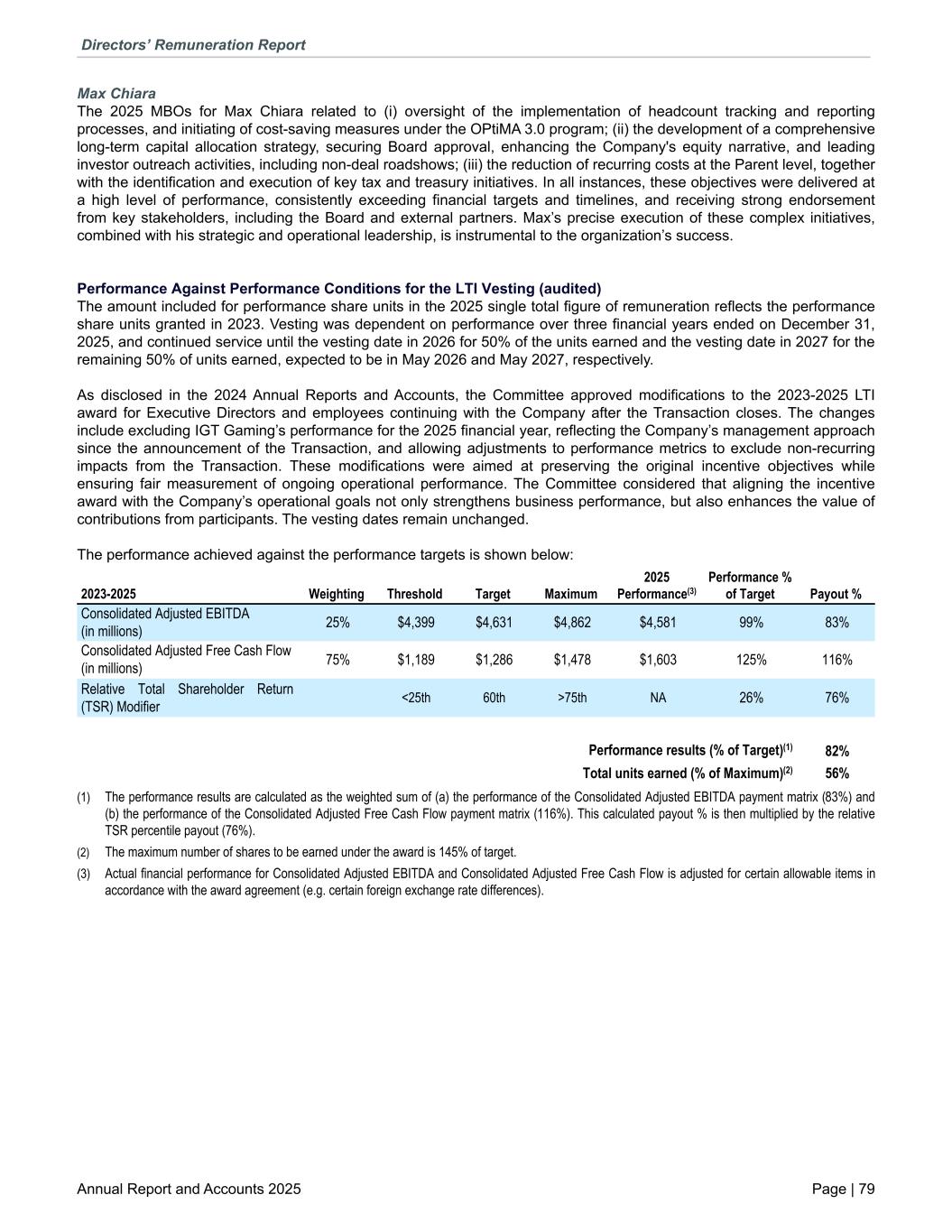 Max Chiara The 2025 MBOs for Max Chiara related to (i) oversight of the implementation of headcount tracking and reporting processes, and initiating of cost-saving measures under the OPtiMA 3.0 program; (ii) the development of a comprehensive long-term capital allocation strategy, securing Board approval, enhancing the Company's equity narrative, and leading investor outreach activities, including non-deal roadshows; (iii) the reduction of recurring costs at the Parent level, together with the identification and execution of key tax and treasury initiatives. In all instances, these objectives were delivered at a high level of performance, consistently exceeding financial targets and timelines, and receiving strong endorsement from key stakeholders, including the Board and external partners. Max’s precise execution of these complex initiatives, combined with his strategic and operational leadership, is instrumental to the organization’s success. Performance Against Performance Conditions for the LTI Vesting (audited) The amount included for performance share units in the 2025 single total figure of remuneration reflects the performance share units granted in 2023. Vesting was dependent on performance over three financial years ended on December 31, 2025, and continued service until the vesting date in 2026 for 50% of the units earned and the vesting date in 2027 for the remaining 50% of units earned, expected to be in May 2026 and May 2027, respectively. As disclosed in the 2024 Annual Reports and Accounts, the Committee approved modifications to the 2023-2025 LTI award for Executive Directors and employees continuing with the Company after the Transaction closes. The changes include excluding IGT Gaming’s performance for the 2025 financial year, reflecting the Company’s management approach since the announcement of the Transaction, and allowing adjustments to performance metrics to exclude non-recurring impacts from the Transaction. These modifications were aimed at preserving the original incentive objectives while ensuring fair measurement of ongoing operational performance. The Committee considered that aligning the incentive award with the Company’s operational goals not only strengthens business performance, but also enhances the value of contributions from participants. The vesting dates remain unchanged. The performance achieved against the performance targets is shown below: 2023-2025 Weighting Threshold Target Maximum 2025 Performance(3) Performance % of Target Payout % Consolidated Adjusted EBITDA (in millions) 25% $4,399 $4,631 $4,862 $4,581 99% 83% Consolidated Adjusted Free Cash Flow (in millions) 75% $1,189 $1,286 $1,478 $1,603 125% 116% Relative Total Shareholder Return (TSR) Modifier <25th 60th >75th NA 26% 76% Performance results (% of Target)(1) 82% Total units earned (% of Maximum)(2) 56% (1) The performance results are calculated as the weighted sum of (a) the performance of the Consolidated Adjusted EBITDA payment matrix (83%) and (b) the performance of the Consolidated Adjusted Free Cash Flow payment matrix (116%). This calculated payout % is then multiplied by the relative TSR percentile payout (76%). (2) The maximum number of shares to be earned under the award is 145% of target. (3) Actual financial performance for Consolidated Adjusted EBITDA and Consolidated Adjusted Free Cash Flow is adjusted for certain allowable items in accordance with the award agreement (e.g. certain foreign exchange rate differences). Directors’ Remuneration Report Annual Report and Accounts 2025 Page | 79