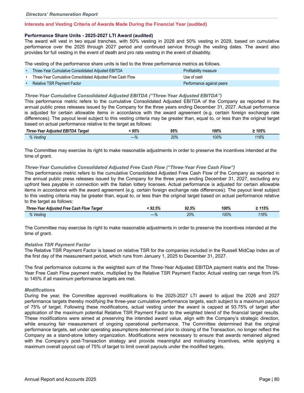Interests and Vesting Criteria of Awards Made During the Financial Year (audited) Performance Share Units - 2025-2027 LTI Award (audited) The award will vest in two equal tranches, with 50% vesting in 2028 and 50% vesting in 2029, based on cumulative performance over the 2025 through 2027 period and continued service through the vesting dates. The award also provides for full vesting in the event of death and pro rata vesting in the event of disability. The vesting of the performance share units is tied to the three performance metrics as follows. • Three-Year Cumulative Consolidated Adjusted EBITDA Profitability measure • Three-Year Cumulative Consolidated Adjusted Free Cash Flow Use of cash • Relative TSR Payment Factor Performance against peers Three-Year Cumulative Consolidated Adjusted EBITDA (“Three-Year Adjusted EBITDA”) This performance metric refers to the cumulative Consolidated Adjusted EBITDA of the Company as reported in the annual public press releases issued by the Company for the three years ending December 31, 2027. Actual performance is adjusted for certain allowable items in accordance with the award agreement (e.g. certain foreign exchange rate differences). The payout level subject to this vesting criteria may be greater than, equal to, or less than the original target based on actual performance relative to the target as follows: Three-Year Adjusted EBITDA Target < 95% 95% 100% ≥ 105% % Vesting —% 20% 100% 116% The Committee may exercise its right to make reasonable adjustments in order to preserve the incentives intended at the time of grant. Three-Year Cumulative Consolidated Adjusted Free Cash Flow (“Three-Year Free Cash Flow”) This performance metric refers to the cumulative Consolidated Adjusted Free Cash Flow of the Company as reported in the annual public press releases issued by the Company for the three years ending December 31, 2027, excluding any upfront fees payable in connection with the Italian lottery licenses. Actual performance is adjusted for certain allowable items in accordance with the award agreement (e.g. certain foreign exchange rate differences). The payout level subject to this vesting criteria may be greater than, equal to, or less than the original target based on actual performance relative to the target as follows: Three-Year Adjusted Free Cash Flow Target < 92.5% 92.5% 100% ≥ 115% % Vesting —% 20% 100% 116% The Committee may exercise its right to make reasonable adjustments in order to preserve the incentives intended at the time of grant. Relative TSR Payment Factor The Relative TSR Payment Factor is based on relative TSR for the companies included in the Russell MidCap Index as of the first day of the measurement period, which runs from January 1, 2025 to December 31, 2027. The final performance outcome is the weighted sum of the Three-Year Adjusted EBITDA payment matrix and the Three- Year Free Cash Flow payment matrix, multiplied by the Relative TSR Payment Factor. Actual vesting can range from 0% to 145% if all maximum performance targets are met. Modifications During the year, the Committee approved modifications to the 2025-2027 LTI award to adjust the 2026 and 2027 performance targets thereby modifying the three-year cumulative performance targets, each subject to a maximum payout of 75% of target. Following these modifications, actual vesting under the award is capped at 93.75% of target after application of the maximum potential Relative TSR Payment Factor to the weighted blend of the financial target results. These modifications were aimed at preserving the intended award value, align with the Company’s strategic direction, while ensuring fair measurement of ongoing operational performance. The Committee determined that the original performance targets, set under operating assumptions determined prior to closing of the Transaction, no longer reflect the Company as a stand-alone lottery organization. Modifications were necessary to ensure that awards remained aligned with the Company’s post-Transaction strategy and provide meaningful and motivating incentives, while applying a maximum overall payout cap of 75% of target to limit overall payouts under the modified targets. Directors’ Remuneration Report Annual Report and Accounts 2025 Page | 80