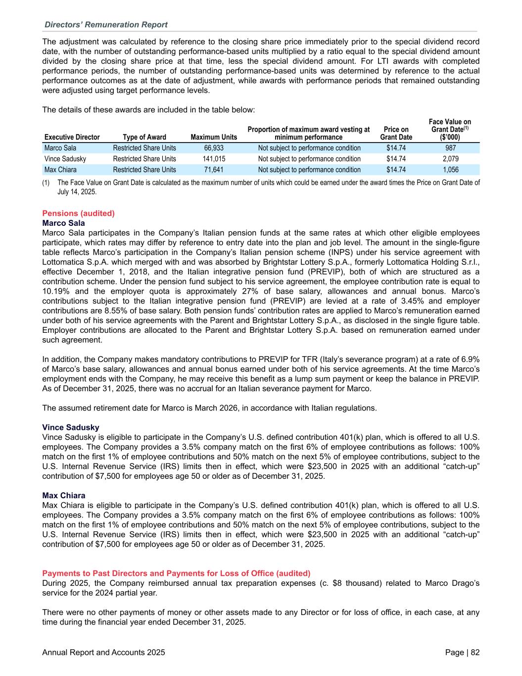 The adjustment was calculated by reference to the closing share price immediately prior to the special dividend record date, with the number of outstanding performance-based units multiplied by a ratio equal to the special dividend amount divided by the closing share price at that time, less the special dividend amount. For LTI awards with completed performance periods, the number of outstanding performance-based units was determined by reference to the actual performance outcomes as at the date of adjustment, while awards with performance periods that remained outstanding were adjusted using target performance levels. The details of these awards are included in the table below: Executive Director Type of Award Maximum Units Proportion of maximum award vesting at minimum performance Price on Grant Date Face Value on Grant Date(1) ($’000) Marco Sala Restricted Share Units 66,933 Not subject to performance condition $14.74 987 Vince Sadusky Restricted Share Units 141,015 Not subject to performance condition $14.74 2,079 Max Chiara Restricted Share Units 71,641 Not subject to performance condition $14.74 1,056 (1) The Face Value on Grant Date is calculated as the maximum number of units which could be earned under the award times the Price on Grant Date of July 14, 2025. Pensions (audited) Marco Sala Marco Sala participates in the Company’s Italian pension funds at the same rates at which other eligible employees participate, which rates may differ by reference to entry date into the plan and job level. The amount in the single-figure table reflects Marco’s participation in the Company’s Italian pension scheme (INPS) under his service agreement with Lottomatica S.p.A. which merged with and was absorbed by Brightstar Lottery S.p.A., formerly Lottomatica Holding S.r.l., effective December 1, 2018, and the Italian integrative pension fund (PREVIP), both of which are structured as a contribution scheme. Under the pension fund subject to his service agreement, the employee contribution rate is equal to 10.19% and the employer quota is approximately 27% of base salary, allowances and annual bonus. Marco’s contributions subject to the Italian integrative pension fund (PREVIP) are levied at a rate of 3.45% and employer contributions are 8.55% of base salary. Both pension funds’ contribution rates are applied to Marco’s remuneration earned under both of his service agreements with the Parent and Brightstar Lottery S.p.A., as disclosed in the single figure table. Employer contributions are allocated to the Parent and Brightstar Lottery S.p.A. based on remuneration earned under such agreement. In addition, the Company makes mandatory contributions to PREVIP for TFR (Italy’s severance program) at a rate of 6.9% of Marco’s base salary, allowances and annual bonus earned under both of his service agreements. At the time Marco’s employment ends with the Company, he may receive this benefit as a lump sum payment or keep the balance in PREVIP. As of December 31, 2025, there was no accrual for an Italian severance payment for Marco. The assumed retirement date for Marco is March 2026, in accordance with Italian regulations. Vince Sadusky Vince Sadusky is eligible to participate in the Company’s U.S. defined contribution 401(k) plan, which is offered to all U.S. employees. The Company provides a 3.5% company match on the first 6% of employee contributions as follows: 100% match on the first 1% of employee contributions and 50% match on the next 5% of employee contributions, subject to the U.S. Internal Revenue Service (IRS) limits then in effect, which were $23,500 in 2025 with an additional “catch-up” contribution of $7,500 for employees age 50 or older as of December 31, 2025. Max Chiara Max Chiara is eligible to participate in the Company’s U.S. defined contribution 401(k) plan, which is offered to all U.S. employees. The Company provides a 3.5% company match on the first 6% of employee contributions as follows: 100% match on the first 1% of employee contributions and 50% match on the next 5% of employee contributions, subject to the U.S. Internal Revenue Service (IRS) limits then in effect, which were $23,500 in 2025 with an additional “catch-up” contribution of $7,500 for employees age 50 or older as of December 31, 2025. Payments to Past Directors and Payments for Loss of Office (audited) During 2025, the Company reimbursed annual tax preparation expenses (c. $8 thousand) related to Marco Drago’s service for the 2024 partial year. There were no other payments of money or other assets made to any Director or for loss of office, in each case, at any time during the financial year ended December 31, 2025. Directors’ Remuneration Report Annual Report and Accounts 2025 Page | 82