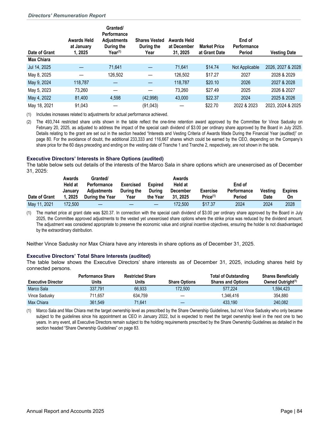 Max Chiara Jul 14, 2025 — 71,641 — 71,641 $14.74 Not Applicable 2026, 2027 & 2028 May 8, 2025 — 126,502 — 126,502 $17.27 2027 2028 & 2029 May 9, 2024 118,787 — — 118,787 $20.10 2026 2027 & 2028 May 5, 2023 73,260 — — 73,260 $27.49 2025 2026 & 2027 May 4, 2022 81,400 4,598 (42,998) 43,000 $22.37 2024 2025 & 2026 May 18, 2021 91,043 — (91,043) — $22.70 2022 & 2023 2023, 2024 & 2025 Date of Grant Awards Held at January 1, 2025 Granted/ Performance Adjustments During the Year(1) Shares Vested During the Year Awards Held at December 31, 2025 Market Price at Grant Date End of Performance Period Vesting Date (1) Includes increases related to adjustments for actual performance achieved. (2) The 493,744 restricted share units shown in the table reflect the one-time retention award approved by the Committee for Vince Sadusky on February 20, 2025, as adjusted to address the impact of the special cash dividend of $3.00 per ordinary share approved by the Board in July 2025. Details relating to the grant are set out in the section headed “Interests and Vesting Criteria of Awards Made During the Financial Year (audited)” on page 80. For the avoidance of doubt, the additional 233,333 and 116,667 shares which could be earned by the CEO, depending on the Company’s share price for the 60 days preceding and ending on the vesting date of Tranche 1 and Tranche 2, respectively, are not shown in the table. Executive Directors’ Interests in Share Options (audited) The table below sets out details of the interests of the Marco Sala in share options which are unexercised as of December 31, 2025: Date of Grant Awards Held at January 1, 2025 Granted/ Performance Adjustments During the Year Exercised During the Year Expired During the Year Awards Held at December 31, 2025 Exercise Price(1) End of Performance Period Vesting Date Expires On May 11, 2021 172,500 — — — 172,500 $17.37 2024 2024 2028 (1) The market price at grant date was $20.37. In connection with the special cash dividend of $3.00 per ordinary share approved by the Board in July 2025, the Committee approved adjustments to the vested yet unexercised share options where the strike price was reduced by the dividend amount. The adjustment was considered appropriate to preserve the economic value and original incentive objectives, ensuring the holder is not disadvantaged by the extraordinary distribution. Neither Vince Sadusky nor Max Chiara have any interests in share options as of December 31, 2025. Executive Directors’ Total Share Interests (audited) The table below shows the Executive Directors’ share interests as of December 31, 2025, including shares held by connected persons. Executive Director Performance Share Units Restricted Share Units Share Options Total of Outstanding Shares and Options Shares Beneficially Owned Outright(1) Marco Sala 337,791 66,933 172,500 577,224 1,594,423 Vince Sadusky 711,657 634,759 — 1,346,416 354,880 Max Chiara 361,549 71,641 — 433,190 240,082 (1) Marco Sala and Max Chiara met the target ownership level as prescribed by the Share Ownership Guidelines, but not Vince Sadusky who only became subject to the guidelines since his appointment as CEO in January 2022, but is expected to meet the target ownership level in the next one to two years. In any event, all Executive Directors remain subject to the holding requirements prescribed by the Share Ownership Guidelines as detailed in the section headed “Share Ownership Guidelines” on page 83. Directors’ Remuneration Report Annual Report and Accounts 2025 Page | 84