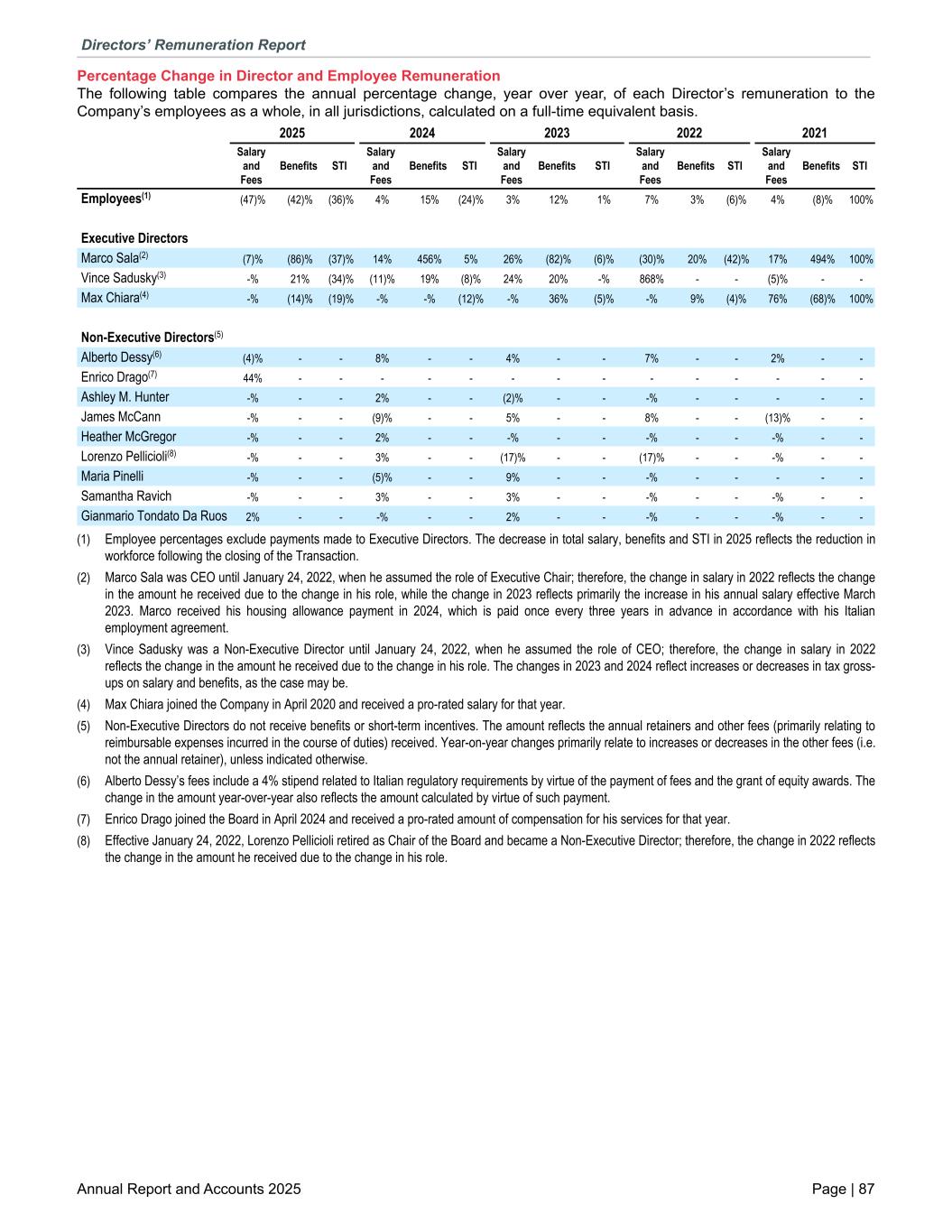 Percentage Change in Director and Employee Remuneration The following table compares the annual percentage change, year over year, of each Director’s remuneration to the Company’s employees as a whole, in all jurisdictions, calculated on a full-time equivalent basis. Employees(1) (47)% (42)% (36)% 4% 15% (24)% 3% 12% 1% 7% 3% (6)% 4% (8)% 100% Executive Directors Marco Sala(2) (7)% (86)% (37)% 14% 456% 5% 26% (82)% (6)% (30)% 20% (42)% 17% 494% 100% Vince Sadusky(3) -% 21% (34)% (11)% 19% (8)% 24% 20% -% 868% - - (5)% - - Max Chiara(4) -% (14)% (19)% -% -% (12)% -% 36% (5)% -% 9% (4)% 76% (68)% 100% Non-Executive Directors(5) Alberto Dessy(6) (4)% - - 8% - - 4% - - 7% - - 2% - - Enrico Drago(7) 44% - - - - - - - - - - - - - - Ashley M. Hunter -% - - 2% - - (2)% - - -% - - - - - James McCann -% - - (9)% - - 5% - - 8% - - (13)% - - Heather McGregor -% - - 2% - - -% - - -% - - -% - - Lorenzo Pellicioli(8) -% - - 3% - - (17)% - - (17)% - - -% - - Maria Pinelli -% - - (5)% - - 9% - - -% - - - - - Samantha Ravich -% - - 3% - - 3% - - -% - - -% - - Gianmario Tondato Da Ruos 2% - - -% - - 2% - - -% - - -% - - 2025 2024 2023 2022 2021 Salary and Fees Benefits STI Salary and Fees Benefits STI Salary and Fees Benefits STI Salary and Fees Benefits STI Salary and Fees Benefits STI (1) Employee percentages exclude payments made to Executive Directors. The decrease in total salary, benefits and STI in 2025 reflects the reduction in workforce following the closing of the Transaction. (2) Marco Sala was CEO until January 24, 2022, when he assumed the role of Executive Chair; therefore, the change in salary in 2022 reflects the change in the amount he received due to the change in his role, while the change in 2023 reflects primarily the increase in his annual salary effective March 2023. Marco received his housing allowance payment in 2024, which is paid once every three years in advance in accordance with his Italian employment agreement. (3) Vince Sadusky was a Non-Executive Director until January 24, 2022, when he assumed the role of CEO; therefore, the change in salary in 2022 reflects the change in the amount he received due to the change in his role. The changes in 2023 and 2024 reflect increases or decreases in tax gross- ups on salary and benefits, as the case may be. (4) Max Chiara joined the Company in April 2020 and received a pro-rated salary for that year. (5) Non-Executive Directors do not receive benefits or short-term incentives. The amount reflects the annual retainers and other fees (primarily relating to reimbursable expenses incurred in the course of duties) received. Year-on-year changes primarily relate to increases or decreases in the other fees (i.e. not the annual retainer), unless indicated otherwise. (6) Alberto Dessy’s fees include a 4% stipend related to Italian regulatory requirements by virtue of the payment of fees and the grant of equity awards. The change in the amount year-over-year also reflects the amount calculated by virtue of such payment. (7) Enrico Drago joined the Board in April 2024 and received a pro-rated amount of compensation for his services for that year. (8) Effective January 24, 2022, Lorenzo Pellicioli retired as Chair of the Board and became a Non-Executive Director; therefore, the change in 2022 reflects the change in the amount he received due to the change in his role. Directors’ Remuneration Report Annual Report and Accounts 2025 Page | 87