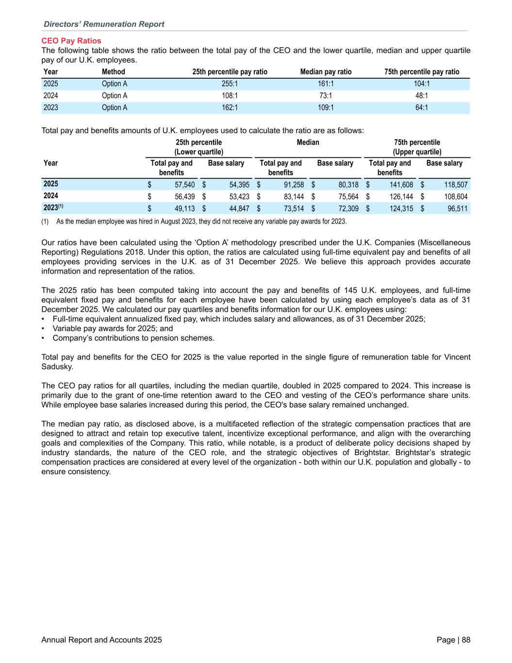 CEO Pay Ratios The following table shows the ratio between the total pay of the CEO and the lower quartile, median and upper quartile pay of our U.K. employees. Year Method 25th percentile pay ratio Median pay ratio 75th percentile pay ratio 2025 Option A 255:1 161:1 104:1 2024 Option A 108:1 73:1 48:1 2023 Option A 162:1 109:1 64:1 Total pay and benefits amounts of U.K. employees used to calculate the ratio are as follows: 25th percentile (Lower quartile) Median 75th percentile (Upper quartile) Year Total pay and benefits Base salary Total pay and benefits Base salary Total pay and benefits Base salary 2025 $ 57,540 $ 54,395 $ 91,258 $ 80,318 $ 141,608 $ 118,507 2024 $ 56,439 $ 53,423 $ 83,144 $ 75,564 $ 126,144 $ 108,604 2023(1) $ 49,113 $ 44,847 $ 73,514 $ 72,309 $ 124,315 $ 96,511 (1) As the median employee was hired in August 2023, they did not receive any variable pay awards for 2023. Our ratios have been calculated using the ‘Option A’ methodology prescribed under the U.K. Companies (Miscellaneous Reporting) Regulations 2018. Under this option, the ratios are calculated using full-time equivalent pay and benefits of all employees providing services in the U.K. as of 31 December 2025. We believe this approach provides accurate information and representation of the ratios. The 2025 ratio has been computed taking into account the pay and benefits of 145 U.K. employees, and full-time equivalent fixed pay and benefits for each employee have been calculated by using each employee’s data as of 31 December 2025. We calculated our pay quartiles and benefits information for our U.K. employees using: • Full-time equivalent annualized fixed pay, which includes salary and allowances, as of 31 December 2025; • Variable pay awards for 2025; and • Company’s contributions to pension schemes. Total pay and benefits for the CEO for 2025 is the value reported in the single figure of remuneration table for Vincent Sadusky. The CEO pay ratios for all quartiles, including the median quartile, doubled in 2025 compared to 2024. This increase is primarily due to the grant of one-time retention award to the CEO and vesting of the CEO’s performance share units. While employee base salaries increased during this period, the CEO's base salary remained unchanged. The median pay ratio, as disclosed above, is a multifaceted reflection of the strategic compensation practices that are designed to attract and retain top executive talent, incentivize exceptional performance, and align with the overarching goals and complexities of the Company. This ratio, while notable, is a product of deliberate policy decisions shaped by industry standards, the nature of the CEO role, and the strategic objectives of Brightstar. Brightstar’s strategic compensation practices are considered at every level of the organization - both within our U.K. population and globally - to ensure consistency. Directors’ Remuneration Report Annual Report and Accounts 2025 Page | 88