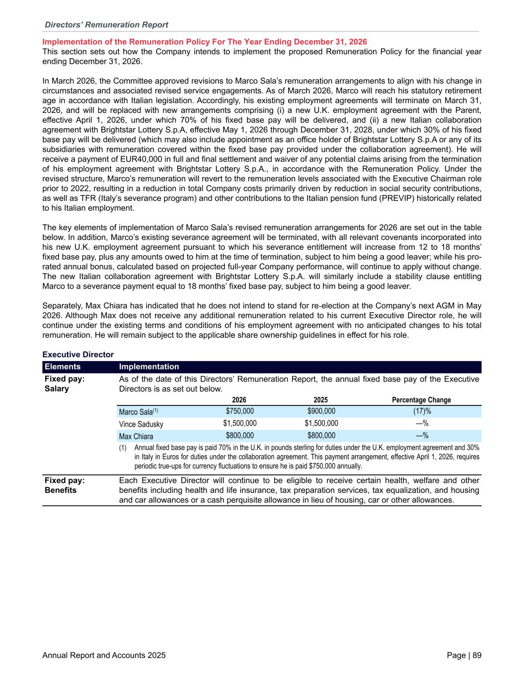 Implementation of the Remuneration Policy For The Year Ending December 31, 2026 This section sets out how the Company intends to implement the proposed Remuneration Policy for the financial year ending December 31, 2026. In March 2026, the Committee approved revisions to Marco Sala’s remuneration arrangements to align with his change in circumstances and associated revised service engagements. As of March 2026, Marco will reach his statutory retirement age in accordance with Italian legislation. Accordingly, his existing employment agreements will terminate on March 31, 2026, and will be replaced with new arrangements comprising (i) a new U.K. employment agreement with the Parent, effective April 1, 2026, under which 70% of his fixed base pay will be delivered, and (ii) a new Italian collaboration agreement with Brightstar Lottery S.p.A, effective May 1, 2026 through December 31, 2028, under which 30% of his fixed base pay will be delivered (which may also include appointment as an office holder of Brightstar Lottery S.p.A or any of its subsidiaries with remuneration covered within the fixed base pay provided under the collaboration agreement). He will receive a payment of EUR40,000 in full and final settlement and waiver of any potential claims arising from the termination of his employment agreement with Brightstar Lottery S.p.A., in accordance with the Remuneration Policy. Under the revised structure, Marco’s remuneration will revert to the remuneration levels associated with the Executive Chairman role prior to 2022, resulting in a reduction in total Company costs primarily driven by reduction in social security contributions, as well as TFR (Italy’s severance program) and other contributions to the Italian pension fund (PREVIP) historically related to his Italian employment. The key elements of implementation of Marco Sala’s revised remuneration arrangements for 2026 are set out in the table below. In addition, Marco’s existing severance agreement will be terminated, with all relevant covenants incorporated into his new U.K. employment agreement pursuant to which his severance entitlement will increase from 12 to 18 months’ fixed base pay, plus any amounts owed to him at the time of termination, subject to him being a good leaver; while his pro- rated annual bonus, calculated based on projected full-year Company performance, will continue to apply without change. The new Italian collaboration agreement with Brightstar Lottery S.p.A. will similarly include a stability clause entitling Marco to a severance payment equal to 18 months’ fixed base pay, subject to him being a good leaver. Separately, Max Chiara has indicated that he does not intend to stand for re-election at the Company’s next AGM in May 2026. Although Max does not receive any additional remuneration related to his current Executive Director role, he will continue under the existing terms and conditions of his employment agreement with no anticipated changes to his total remuneration. He will remain subject to the applicable share ownership guidelines in effect for his role. Executive Director Fixed pay: Salary As of the date of this Directors’ Remuneration Report, the annual fixed base pay of the Executive Directors is as set out below. 2026 2025 Percentage Change Marco Sala(1) $750,000 $900,000 (17)% Vince Sadusky $1,500,000 $1,500,000 —% Max Chiara $800,000 $800,000 —% (1) Annual fixed base pay is paid 70% in the U.K. in pounds sterling for duties under the U.K. employment agreement and 30% in Italy in Euros for duties under the collaboration agreement. This payment arrangement, effective April 1, 2026, requires periodic true-ups for currency fluctuations to ensure he is paid $750,000 annually. Fixed pay: Benefits Each Executive Director will continue to be eligible to receive certain health, welfare and other benefits including health and life insurance, tax preparation services, tax equalization, and housing and car allowances or a cash perquisite allowance in lieu of housing, car or other allowances. Elements Implementation Directors’ Remuneration Report Annual Report and Accounts 2025 Page | 89