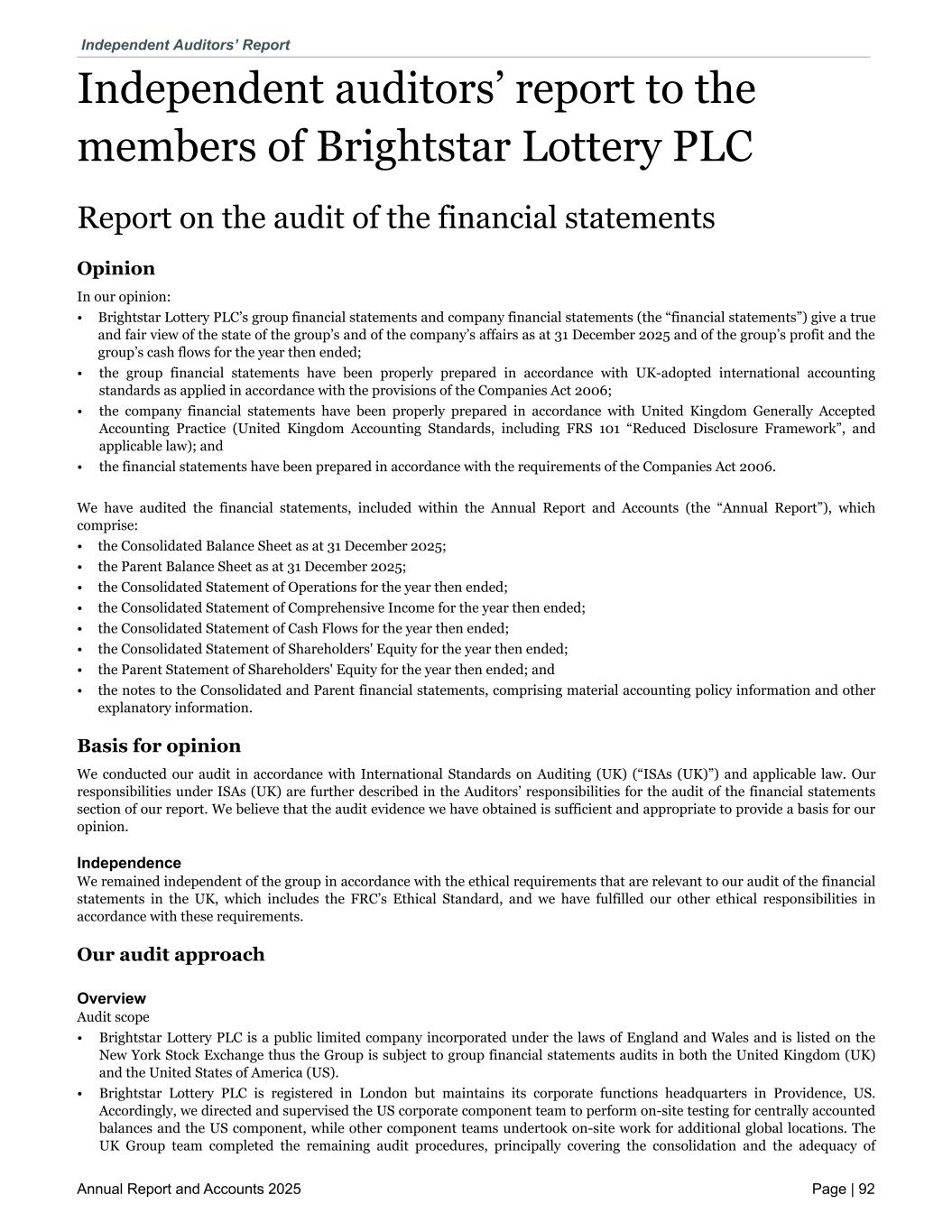 Independent auditors’ report to the members of Brightstar Lottery PLC Report on the audit of the financial statements Opinion In our opinion: • Brightstar Lottery PLC’s group financial statements and company financial statements (the “financial statements”) give a true and fair view of the state of the group’s and of the company’s affairs as at 31 December 2025 and of the group’s profit and the group’s cash flows for the year then ended; • the group financial statements have been properly prepared in accordance with UK-adopted international accounting standards as applied in accordance with the provisions of the Companies Act 2006; • the company financial statements have been properly prepared in accordance with United Kingdom Generally Accepted Accounting Practice (United Kingdom Accounting Standards, including FRS 101 “Reduced Disclosure Framework”, and applicable law); and • the financial statements have been prepared in accordance with the requirements of the Companies Act 2006. We have audited the financial statements, included within the Annual Report and Accounts (the “Annual Report”), which comprise: • the Consolidated Balance Sheet as at 31 December 2025; • the Parent Balance Sheet as at 31 December 2025; • the Consolidated Statement of Operations for the year then ended; • the Consolidated Statement of Comprehensive Income for the year then ended; • the Consolidated Statement of Cash Flows for the year then ended; • the Consolidated Statement of Shareholders' Equity for the year then ended; • the Parent Statement of Shareholders' Equity for the year then ended; and • the notes to the Consolidated and Parent financial statements, comprising material accounting policy information and other explanatory information. Basis for opinion We conducted our audit in accordance with International Standards on Auditing (UK) (“ISAs (UK)”) and applicable law. Our responsibilities under ISAs (UK) are further described in the Auditors’ responsibilities for the audit of the financial statements section of our report. We believe that the audit evidence we have obtained is sufficient and appropriate to provide a basis for our opinion. Independence We remained independent of the group in accordance with the ethical requirements that are relevant to our audit of the financial statements in the UK, which includes the FRC’s Ethical Standard, and we have fulfilled our other ethical responsibilities in accordance with these requirements. Our audit approach Overview Audit scope • Brightstar Lottery PLC is a public limited company incorporated under the laws of England and Wales and is listed on the New York Stock Exchange thus the Group is subject to group financial statements audits in both the United Kingdom (UK) and the United States of America (US). • Brightstar Lottery PLC is registered in London but maintains its corporate functions headquarters in Providence, US. Accordingly, we directed and supervised the US corporate component team to perform on-site testing for centrally accounted balances and the US component, while other component teams undertook on-site work for additional global locations. The UK Group team completed the remaining audit procedures, principally covering the consolidation and the adequacy of Independent Auditors’ Report Annual Report and Accounts 2025 Page | 92