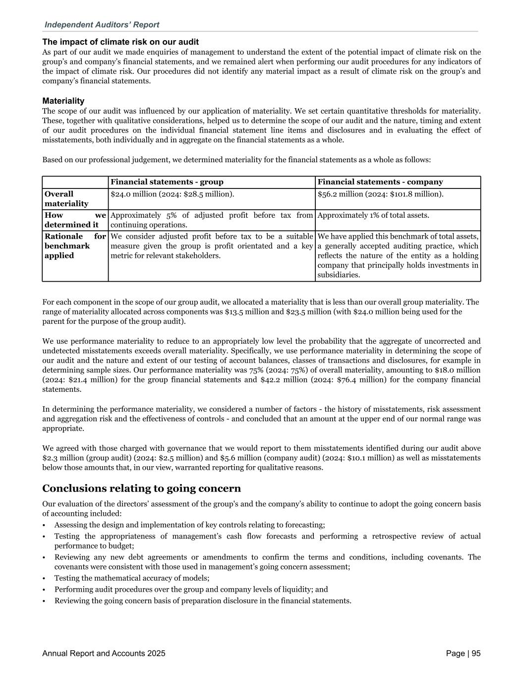 The impact of climate risk on our audit As part of our audit we made enquiries of management to understand the extent of the potential impact of climate risk on the group’s and company’s financial statements, and we remained alert when performing our audit procedures for any indicators of the impact of climate risk. Our procedures did not identify any material impact as a result of climate risk on the group’s and company’s financial statements. Materiality The scope of our audit was influenced by our application of materiality. We set certain quantitative thresholds for materiality. These, together with qualitative considerations, helped us to determine the scope of our audit and the nature, timing and extent of our audit procedures on the individual financial statement line items and disclosures and in evaluating the effect of misstatements, both individually and in aggregate on the financial statements as a whole. Based on our professional judgement, we determined materiality for the financial statements as a whole as follows: Financial statements - group Financial statements - company Overall materiality $24.0 million (2024: $28.5 million). $56.2 million (2024: $101.8 million). How we determined it Approximately 5% of adjusted profit before tax from continuing operations. Approximately 1% of total assets. Rationale for benchmark applied We consider adjusted profit before tax to be a suitable measure given the group is profit orientated and a key metric for relevant stakeholders. We have applied this benchmark of total assets, a generally accepted auditing practice, which reects the nature of the entity as a holding company that principally holds investments in subsidiaries. For each component in the scope of our group audit, we allocated a materiality that is less than our overall group materiality. The range of materiality allocated across components was $13.5 million and $23.5 million (with $24.0 million being used for the parent for the purpose of the group audit). We use performance materiality to reduce to an appropriately low level the probability that the aggregate of uncorrected and undetected misstatements exceeds overall materiality. Specifically, we use performance materiality in determining the scope of our audit and the nature and extent of our testing of account balances, classes of transactions and disclosures, for example in determining sample sizes. Our performance materiality was 75% (2024: 75%) of overall materiality, amounting to $18.0 million (2024: $21.4 million) for the group financial statements and $42.2 million (2024: $76.4 million) for the company financial statements. In determining the performance materiality, we considered a number of factors - the history of misstatements, risk assessment and aggregation risk and the effectiveness of controls - and concluded that an amount at the upper end of our normal range was appropriate. We agreed with those charged with governance that we would report to them misstatements identified during our audit above $2.3 million (group audit) (2024: $2.5 million) and $5.6 million (company audit) (2024: $10.1 million) as well as misstatements below those amounts that, in our view, warranted reporting for qualitative reasons. Conclusions relating to going concern Our evaluation of the directors’ assessment of the group's and the company’s ability to continue to adopt the going concern basis of accounting included: • Assessing the design and implementation of key controls relating to forecasting; • Testing the appropriateness of management’s cash flow forecasts and performing a retrospective review of actual performance to budget; • Reviewing any new debt agreements or amendments to confirm the terms and conditions, including covenants. The covenants were consistent with those used in management’s going concern assessment; • Testing the mathematical accuracy of models; • Performing audit procedures over the group and company levels of liquidity; and • Reviewing the going concern basis of preparation disclosure in the financial statements. Independent Auditors’ Report Annual Report and Accounts 2025 Page | 95