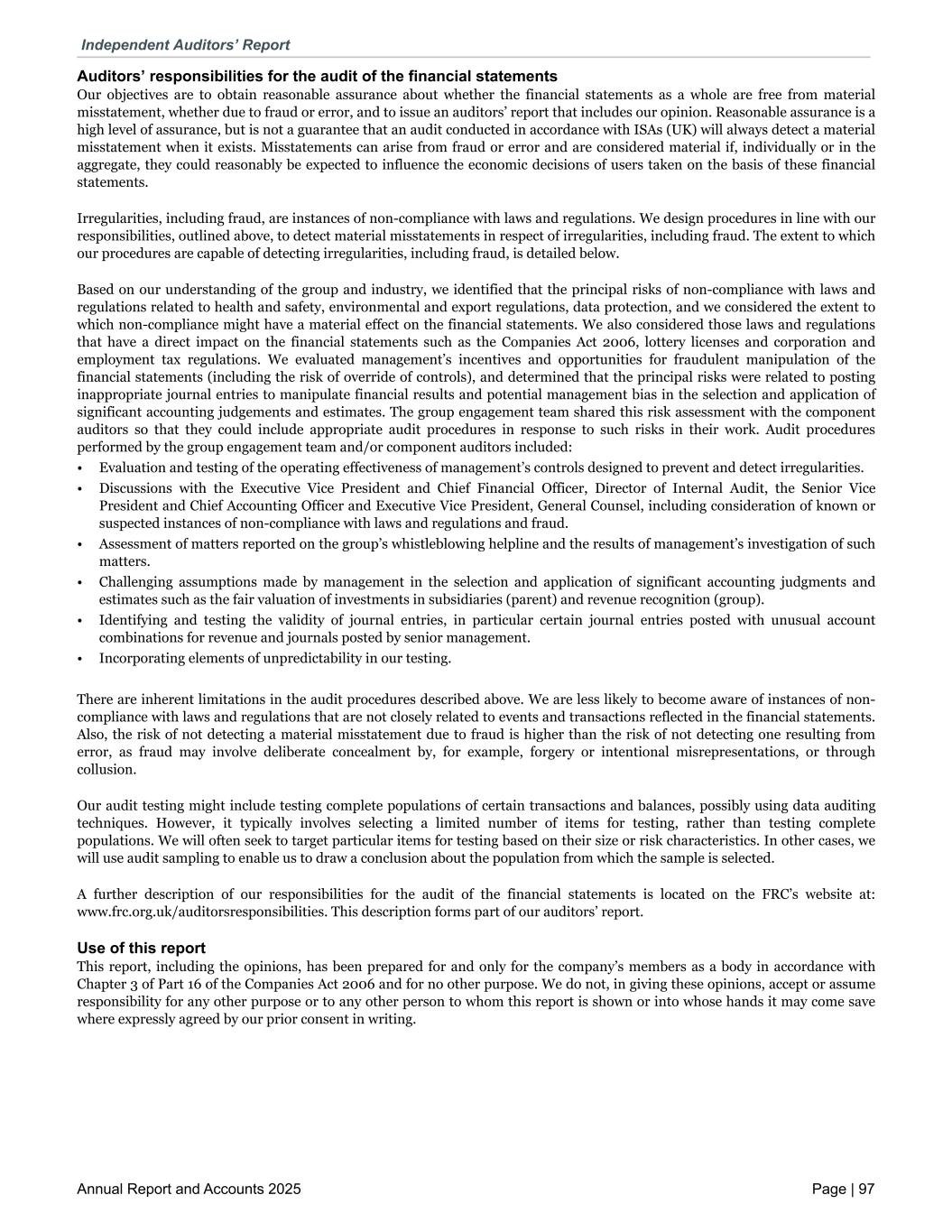 Auditors’ responsibilities for the audit of the financial statements Our objectives are to obtain reasonable assurance about whether the financial statements as a whole are free from material misstatement, whether due to fraud or error, and to issue an auditors’ report that includes our opinion. Reasonable assurance is a high level of assurance, but is not a guarantee that an audit conducted in accordance with ISAs (UK) will always detect a material misstatement when it exists. Misstatements can arise from fraud or error and are considered material if, individually or in the aggregate, they could reasonably be expected to influence the economic decisions of users taken on the basis of these financial statements. Irregularities, including fraud, are instances of non-compliance with laws and regulations. We design procedures in line with our responsibilities, outlined above, to detect material misstatements in respect of irregularities, including fraud. The extent to which our procedures are capable of detecting irregularities, including fraud, is detailed below. Based on our understanding of the group and industry, we identified that the principal risks of non-compliance with laws and regulations related to health and safety, environmental and export regulations, data protection, and we considered the extent to which non-compliance might have a material effect on the financial statements. We also considered those laws and regulations that have a direct impact on the financial statements such as the Companies Act 2006, lottery licenses and corporation and employment tax regulations. We evaluated management’s incentives and opportunities for fraudulent manipulation of the financial statements (including the risk of override of controls), and determined that the principal risks were related to posting inappropriate journal entries to manipulate financial results and potential management bias in the selection and application of significant accounting judgements and estimates. The group engagement team shared this risk assessment with the component auditors so that they could include appropriate audit procedures in response to such risks in their work. Audit procedures performed by the group engagement team and/or component auditors included: • Evaluation and testing of the operating effectiveness of management’s controls designed to prevent and detect irregularities. • Discussions with the Executive Vice President and Chief Financial Officer, Director of Internal Audit, the Senior Vice President and Chief Accounting Officer and Executive Vice President, General Counsel, including consideration of known or suspected instances of non-compliance with laws and regulations and fraud. • Assessment of matters reported on the group’s whistleblowing helpline and the results of management’s investigation of such matters. • Challenging assumptions made by management in the selection and application of significant accounting judgments and estimates such as the fair valuation of investments in subsidiaries (parent) and revenue recognition (group). • Identifying and testing the validity of journal entries, in particular certain journal entries posted with unusual account combinations for revenue and journals posted by senior management. • Incorporating elements of unpredictability in our testing. There are inherent limitations in the audit procedures described above. We are less likely to become aware of instances of non- compliance with laws and regulations that are not closely related to events and transactions reflected in the financial statements. Also, the risk of not detecting a material misstatement due to fraud is higher than the risk of not detecting one resulting from error, as fraud may involve deliberate concealment by, for example, forgery or intentional misrepresentations, or through collusion. Our audit testing might include testing complete populations of certain transactions and balances, possibly using data auditing techniques. However, it typically involves selecting a limited number of items for testing, rather than testing complete populations. We will often seek to target particular items for testing based on their size or risk characteristics. In other cases, we will use audit sampling to enable us to draw a conclusion about the population from which the sample is selected. A further description of our responsibilities for the audit of the financial statements is located on the FRC’s website at: www.frc.org.uk/auditorsresponsibilities. This description forms part of our auditors’ report. Use of this report This report, including the opinions, has been prepared for and only for the company’s members as a body in accordance with Chapter 3 of Part 16 of the Companies Act 2006 and for no other purpose. We do not, in giving these opinions, accept or assume responsibility for any other purpose or to any other person to whom this report is shown or into whose hands it may come save where expressly agreed by our prior consent in writing. Independent Auditors’ Report Annual Report and Accounts 2025 Page | 97